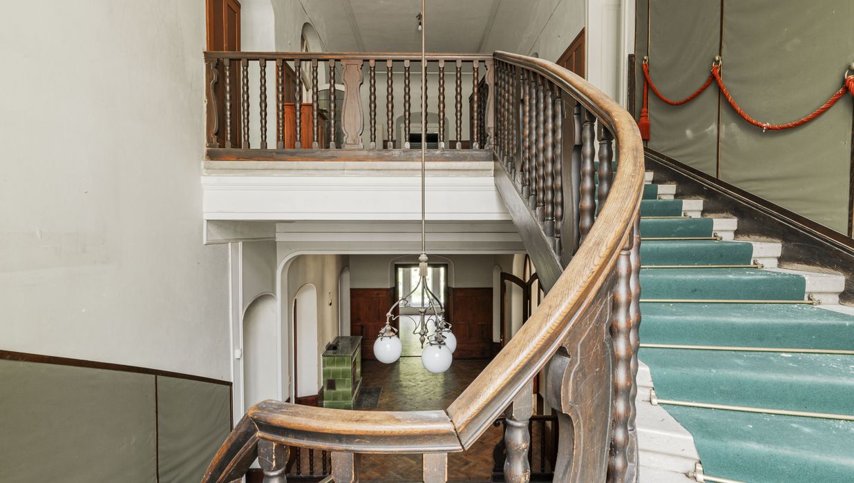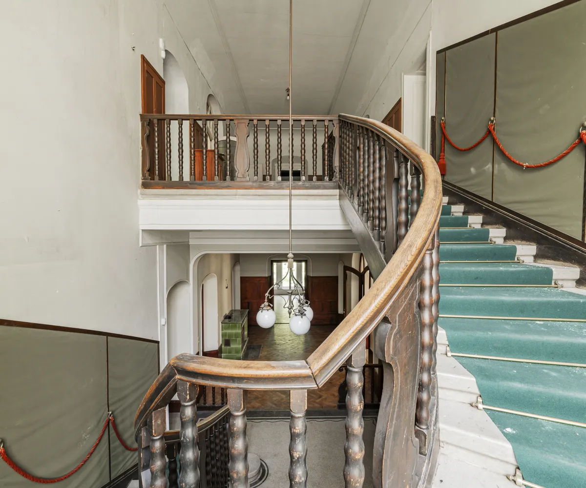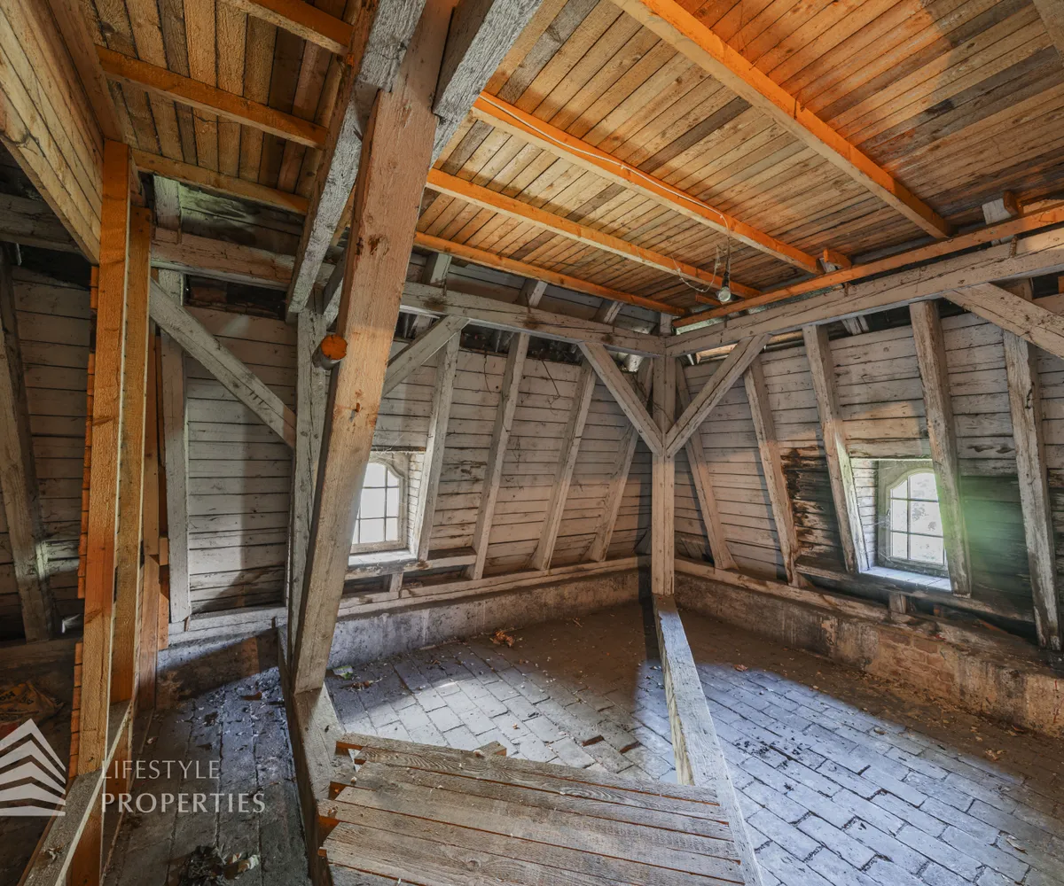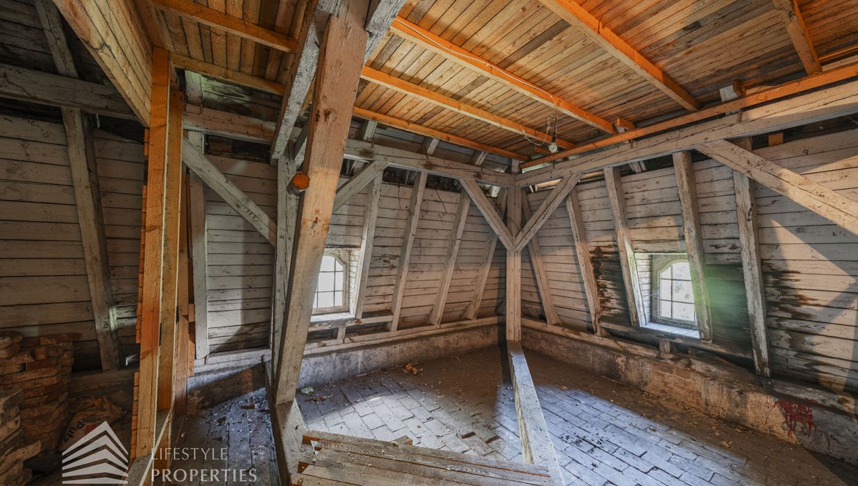 Neben dem Hauptgebäude befindet sich ein Pförtnerhäuschen, welches ebenfalls um ein Dachgeschoss ergänzt werden soll, und ein parkähnlich angelegter Garten. Hierbei würde eine Wohnfläche von unglaublichen ca. 1.019 m² entstehen.