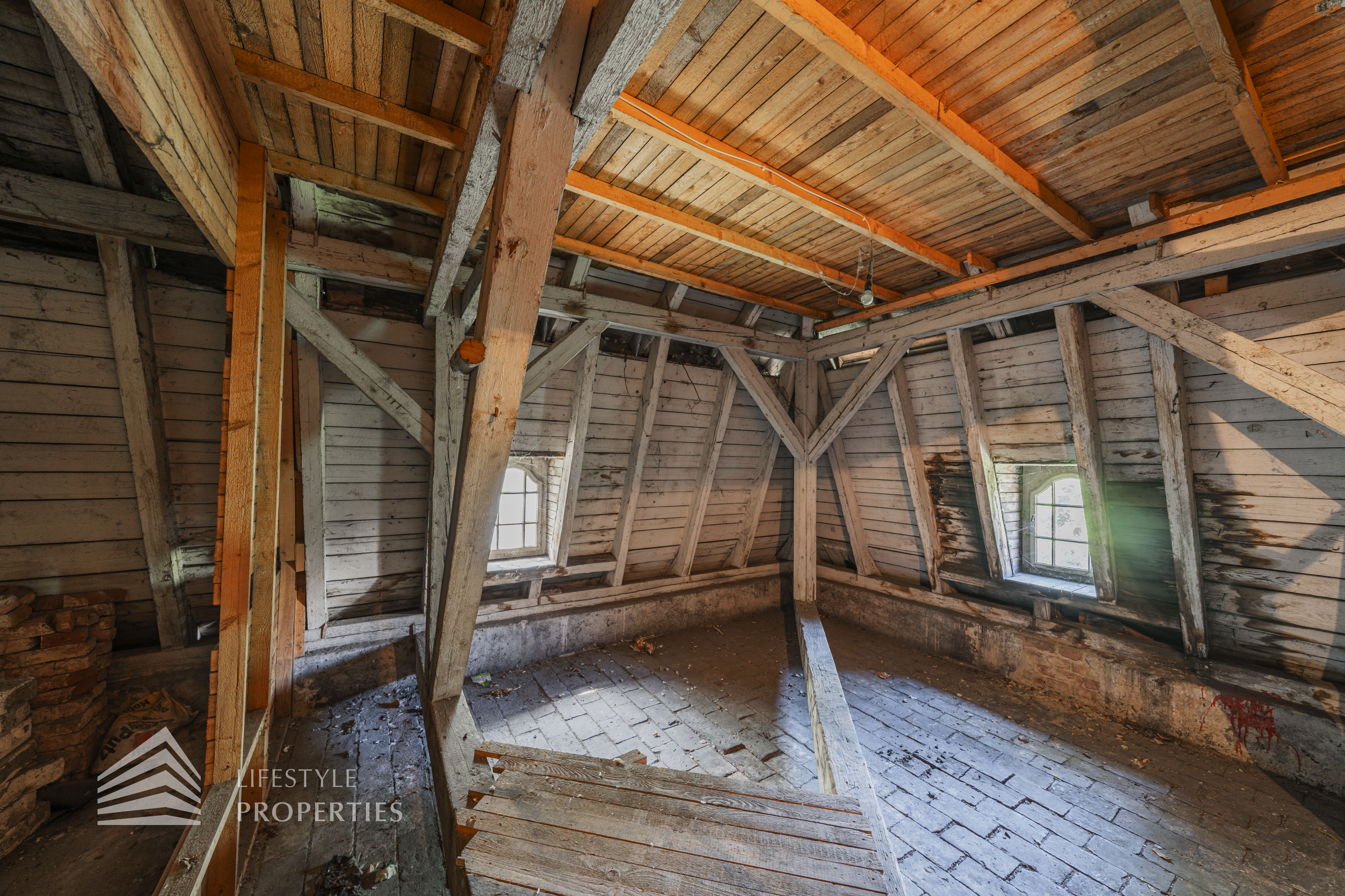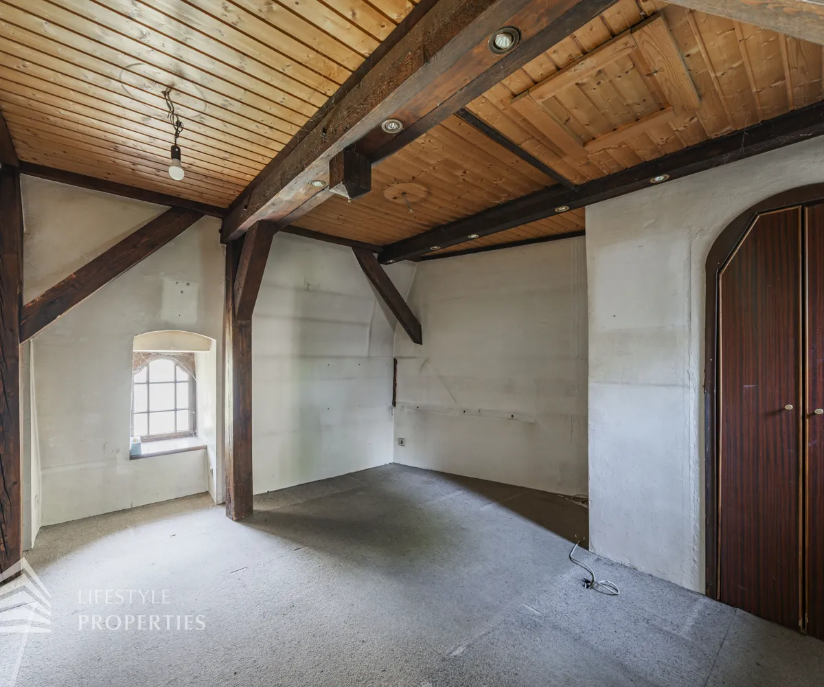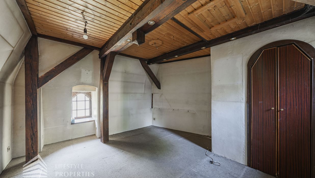 Neben dem Hauptgebäude befindet sich ein Pförtnerhäuschen, welches ebenfalls um ein Dachgeschoss ergänzt werden soll, und ein parkähnlich angelegter Garten. Hierbei würde eine Wohnfläche von unglaublichen ca. 1.019 m² entstehen.