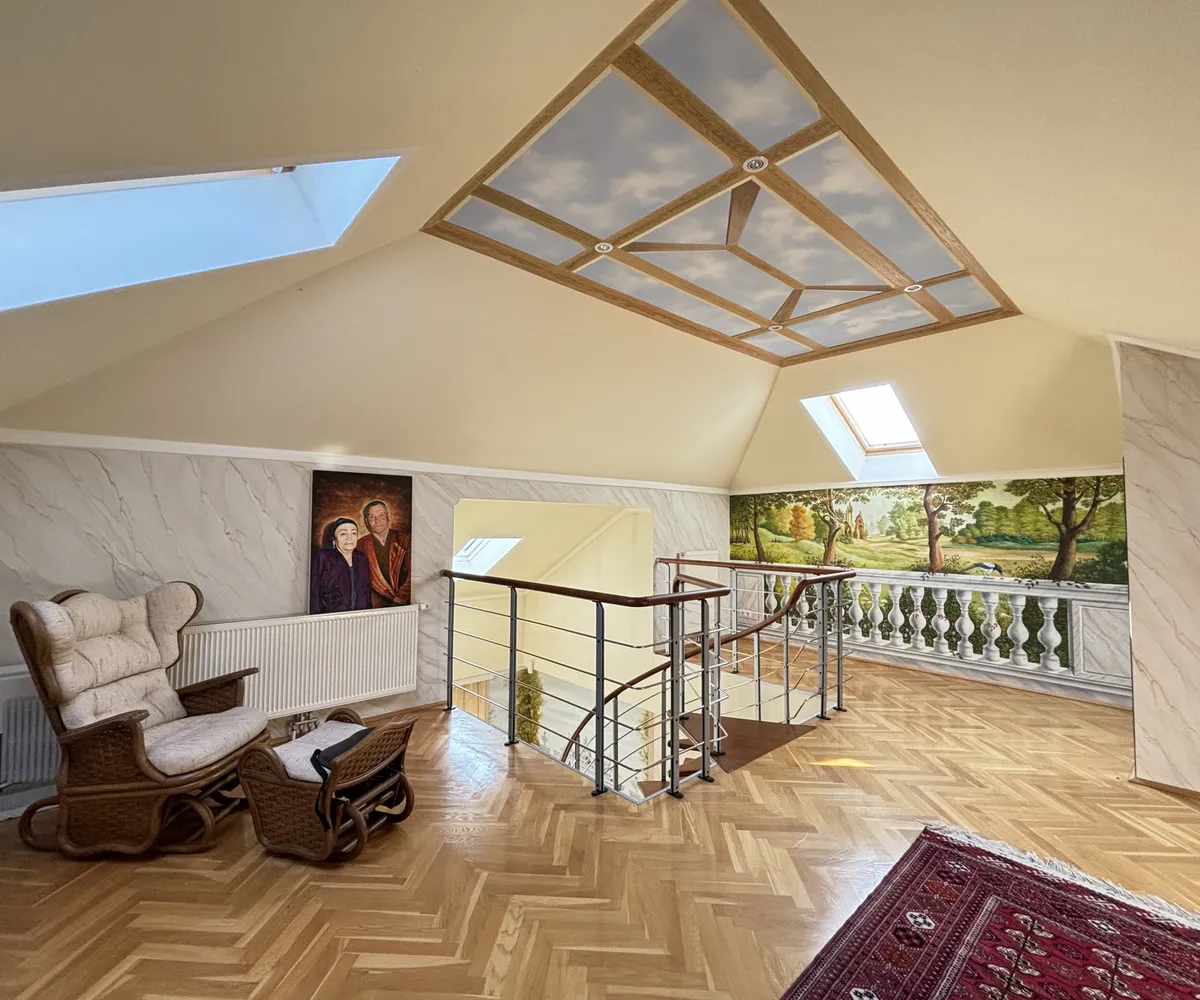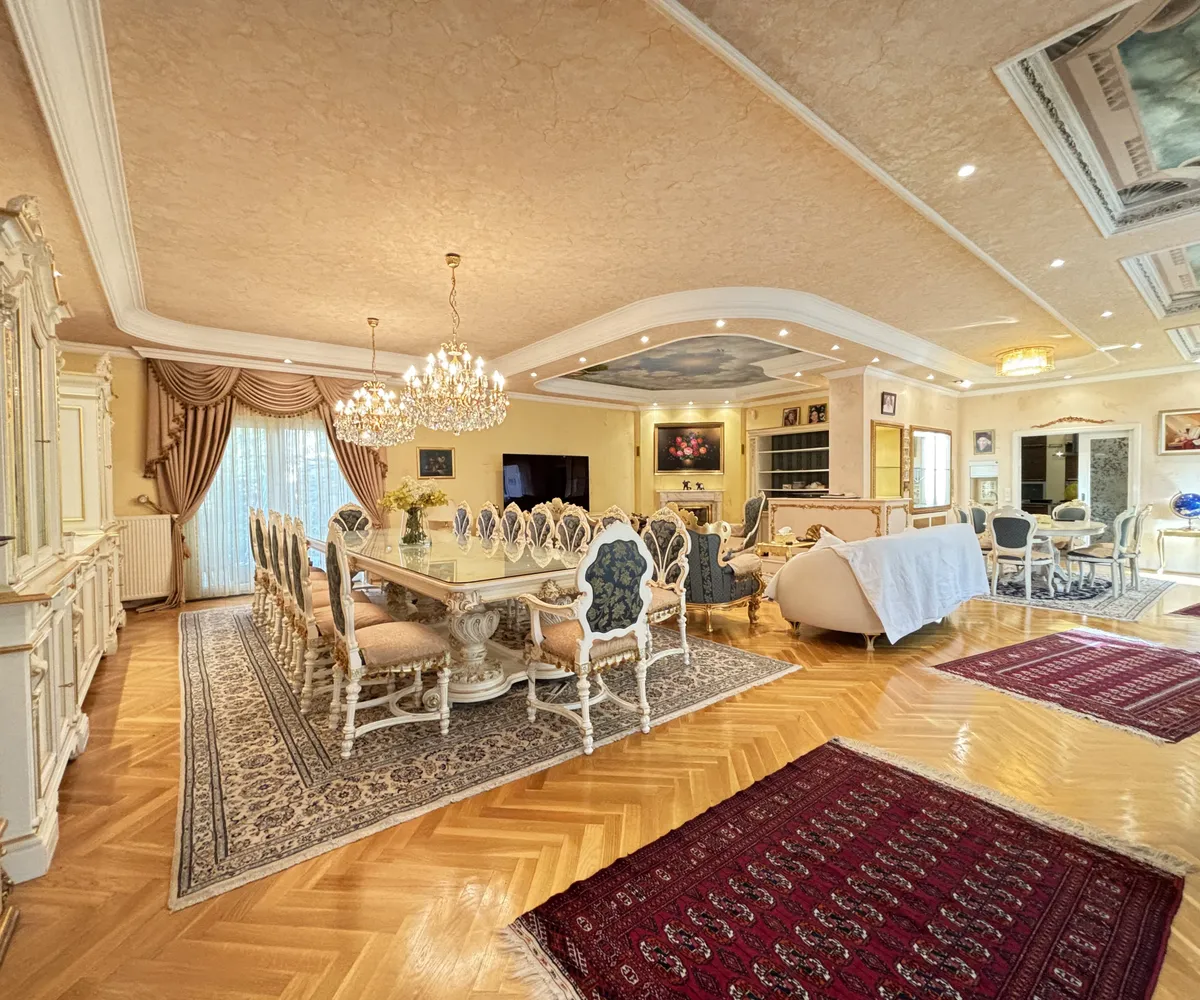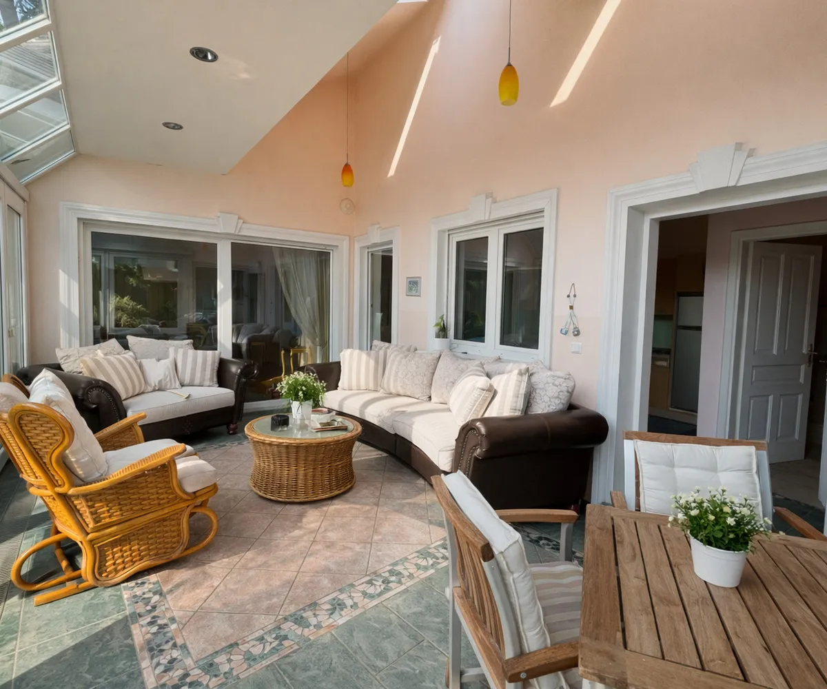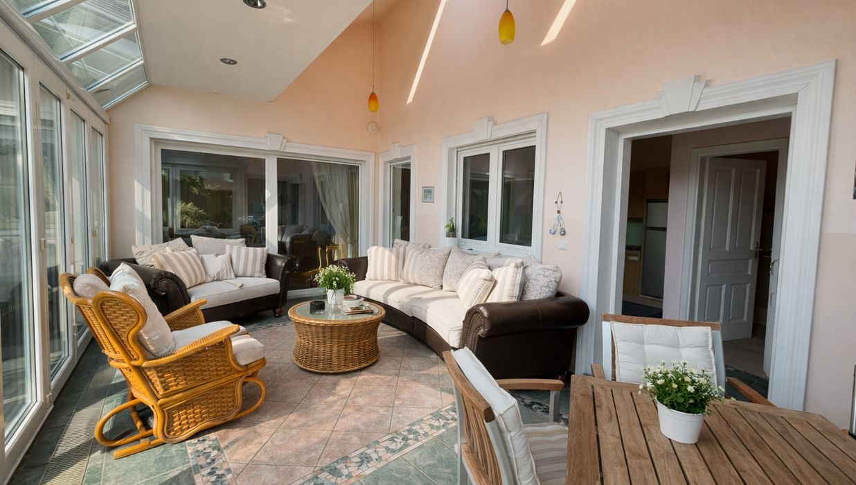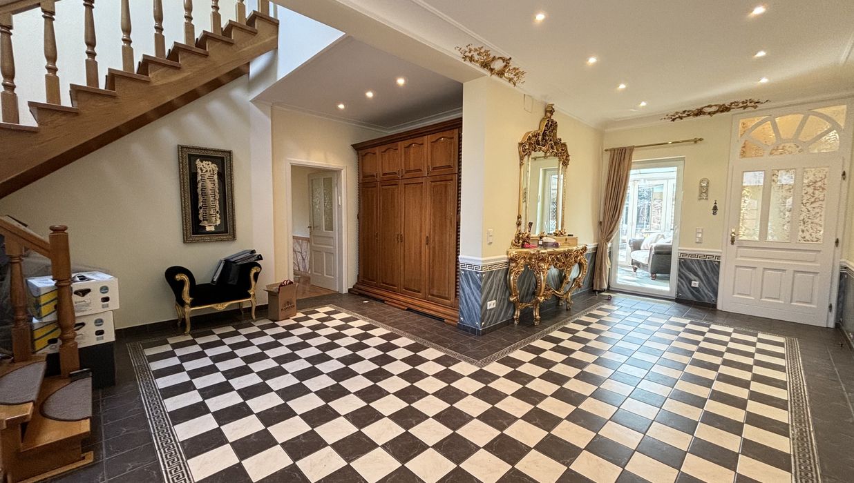 Im Inneren eröffnet sich ein Wohnkonzept für höchste Ansprüche: Edle Massivparkettböden im Fischgrätmuster , hochwertige Naturmaterialien wie Marmor und Granit , kunstvolle Details und großzügige Raumhöhen schaffen eine Atmosphäre zeitloser Eleganz. Das Herzstück des Hauses bildet der lichtdurchflutete Wohnbereich mit offenem Kamin , angrenzendem Wintergarten und direktem Zugang zur Terrasse.