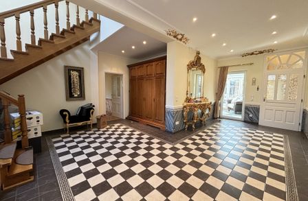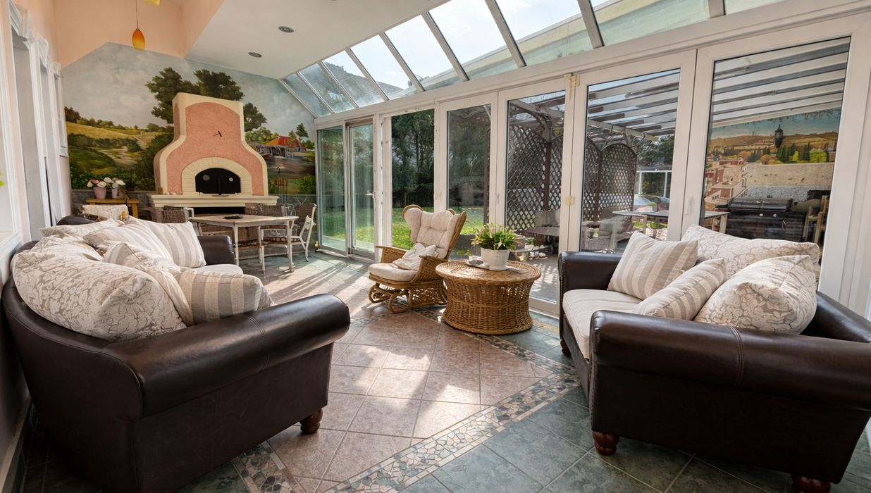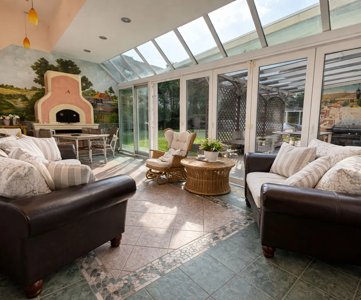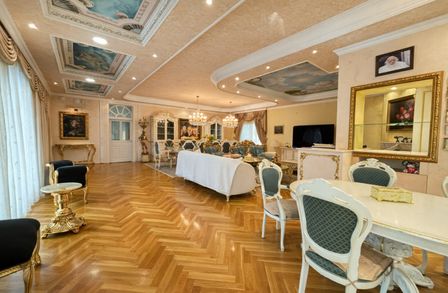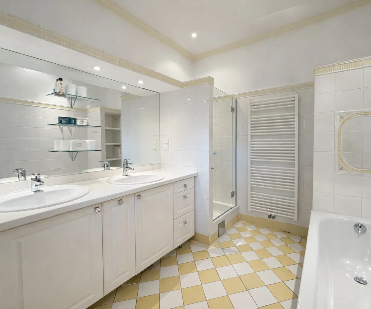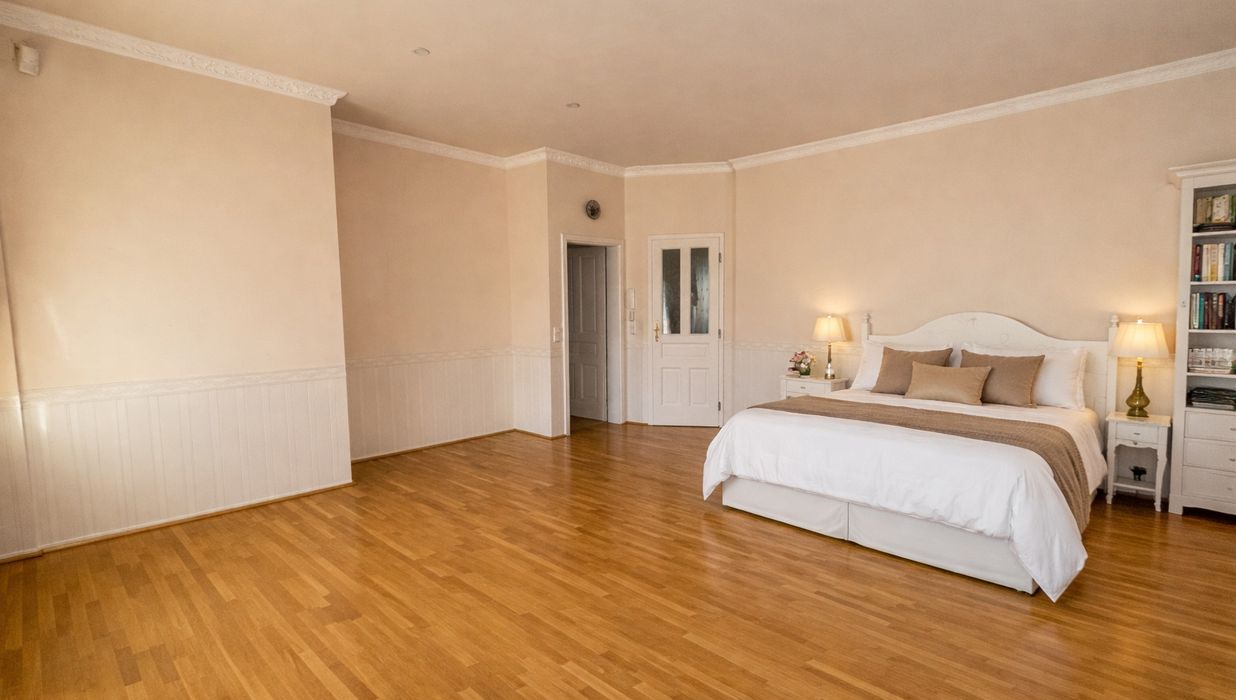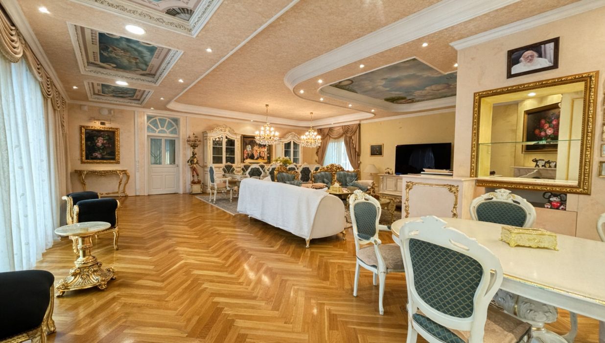 Im Inneren eröffnet sich ein Wohnkonzept für höchste Ansprüche: Edle Massivparkettböden im Fischgrätmuster , hochwertige Naturmaterialien wie Marmor und Granit , kunstvolle Details und großzügige Raumhöhen schaffen eine Atmosphäre zeitloser Eleganz. Das Herzstück des Hauses bildet der lichtdurchflutete Wohnbereich mit offenem Kamin , angrenzendem Wintergarten und direktem Zugang zur Terrasse.