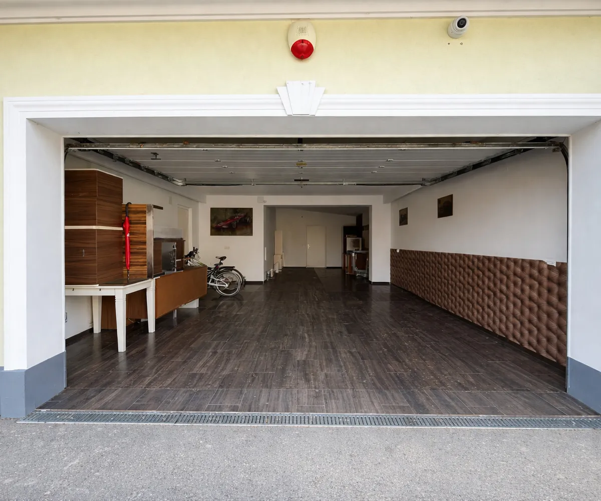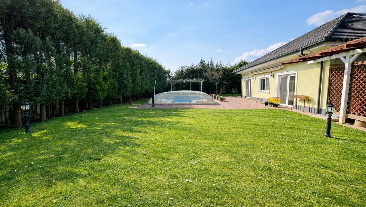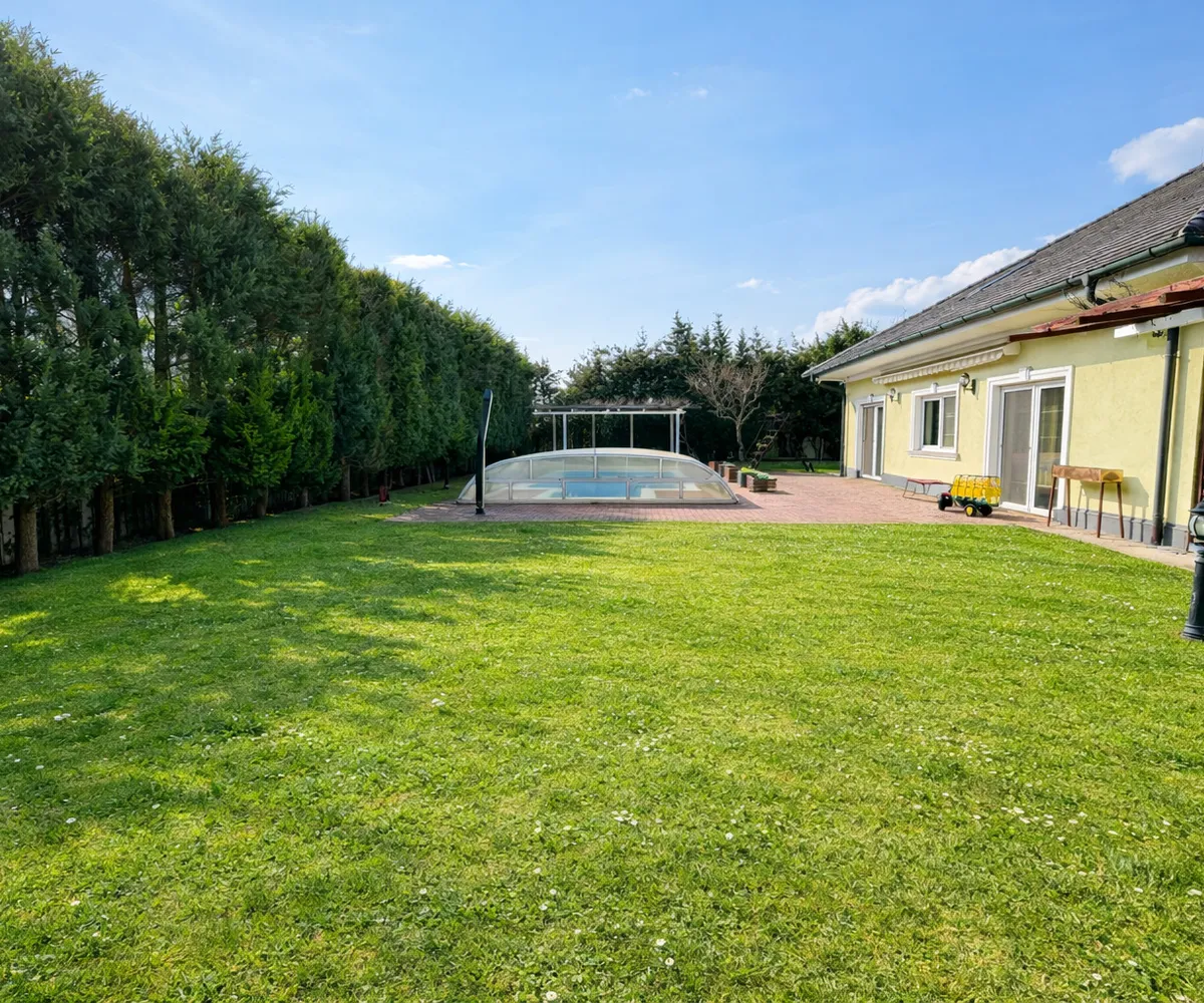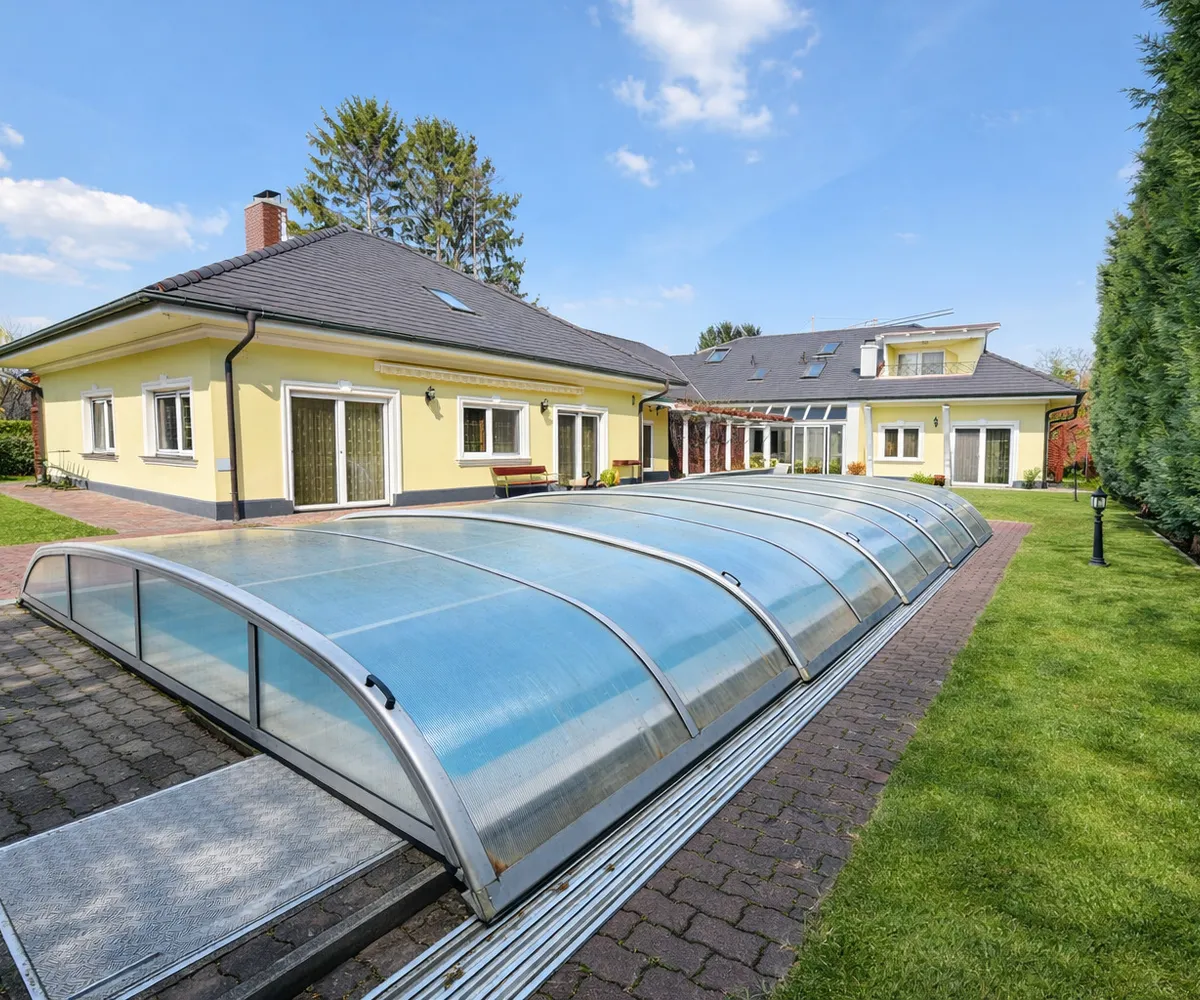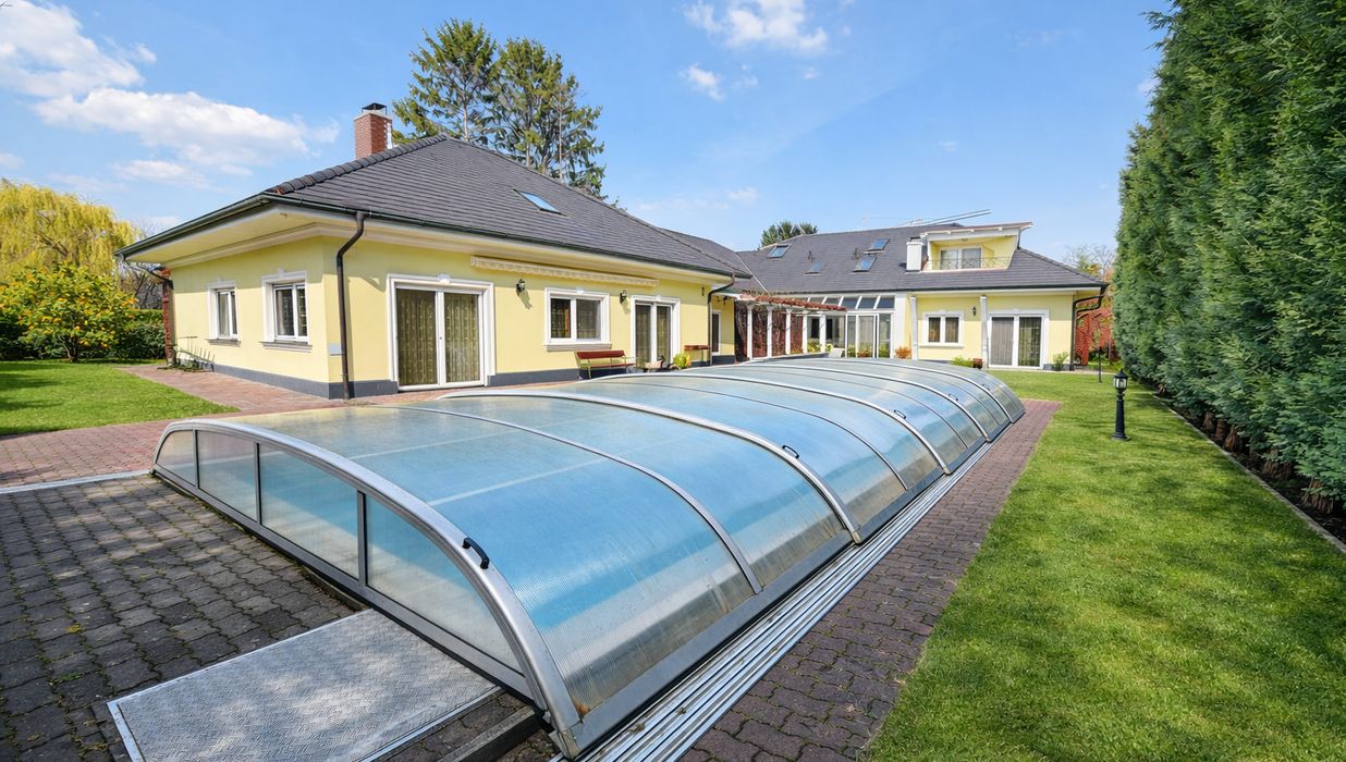 Auch im Außenbereich setzt sich das exklusive Lebensgefühl fort: Der gepflegte Garten mit automatischer Bewässerung, großzügige Terrassenflächen und ein überdachter Swimmingpool (8 × 4 m) laden zu entspannten Stunden und geselligen Abenden ein.