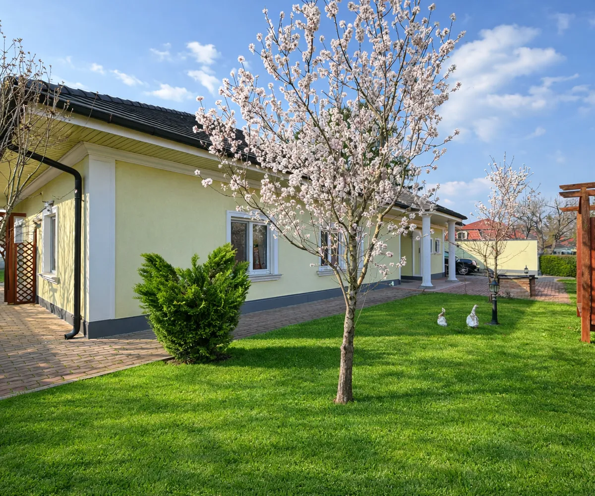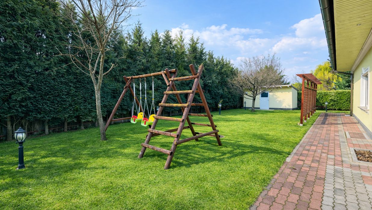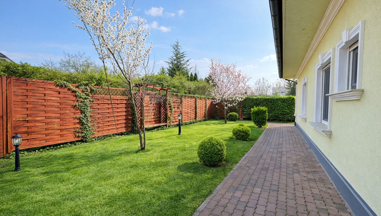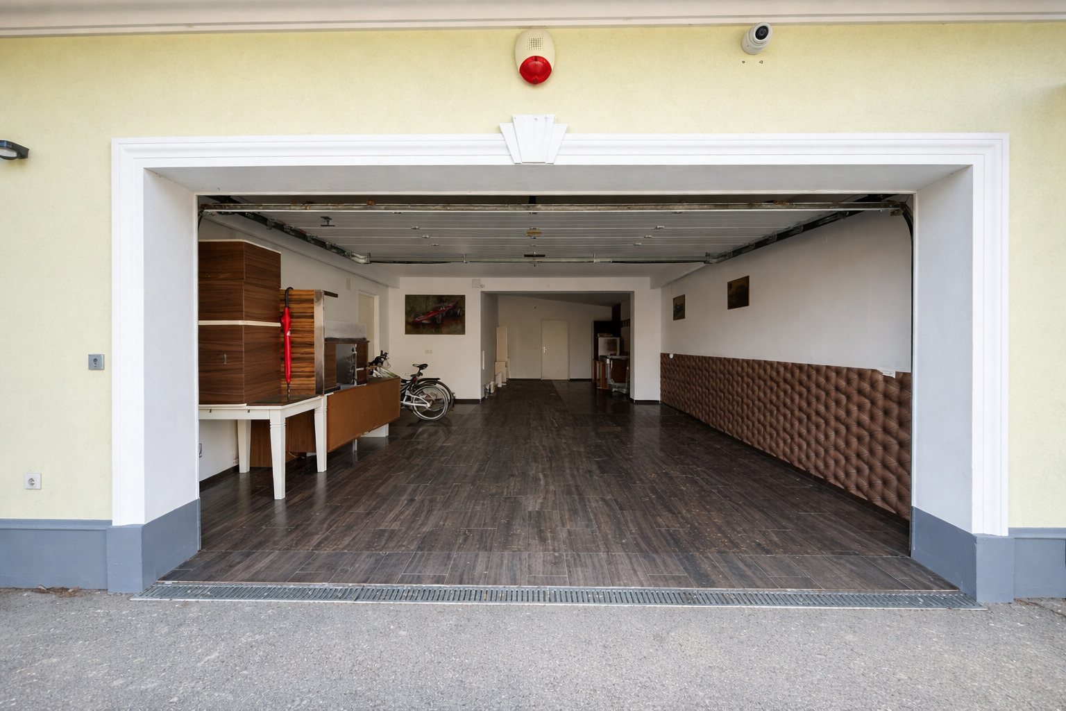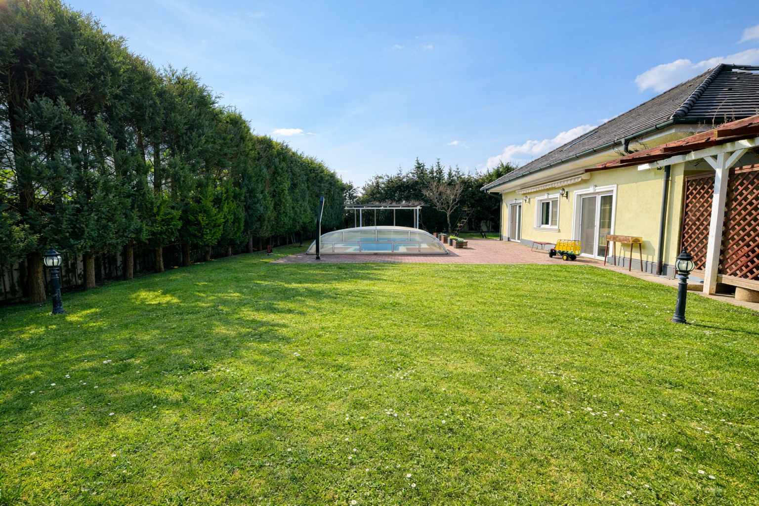 Auch im Außenbereich setzt sich das exklusive Lebensgefühl fort: Der gepflegte Garten mit automatischer Bewässerung, großzügige Terrassenflächen und ein überdachter Swimmingpool (8 × 4 m) laden zu entspannten Stunden und geselligen Abenden ein.