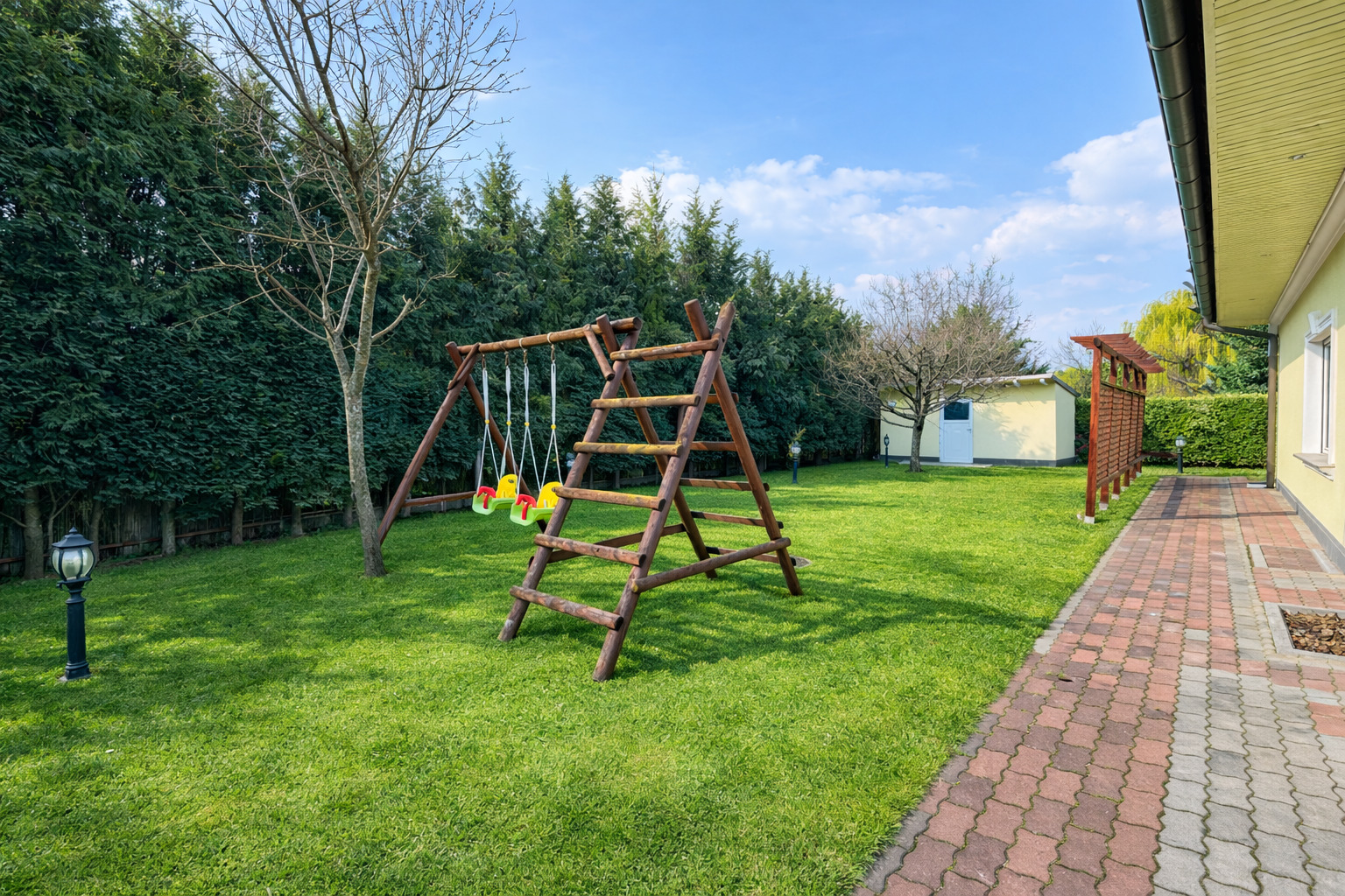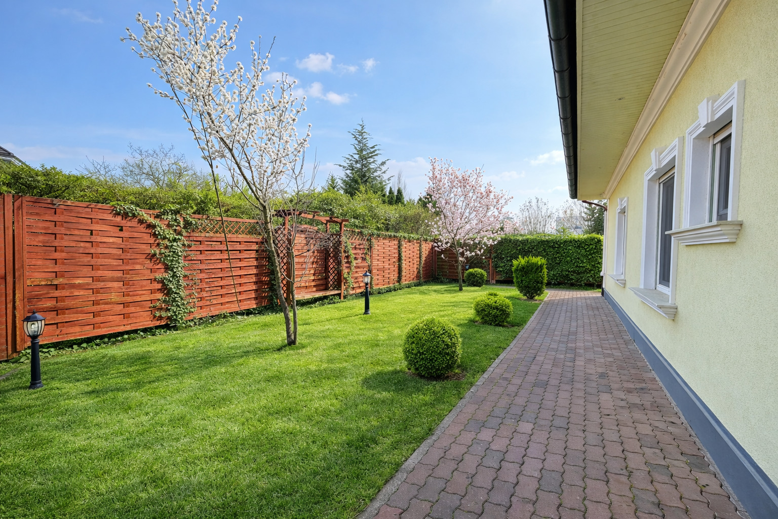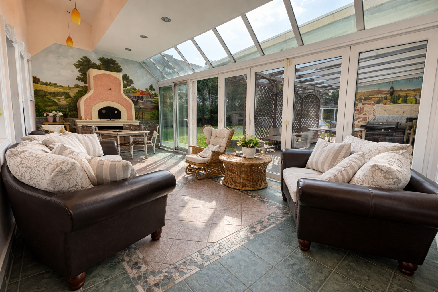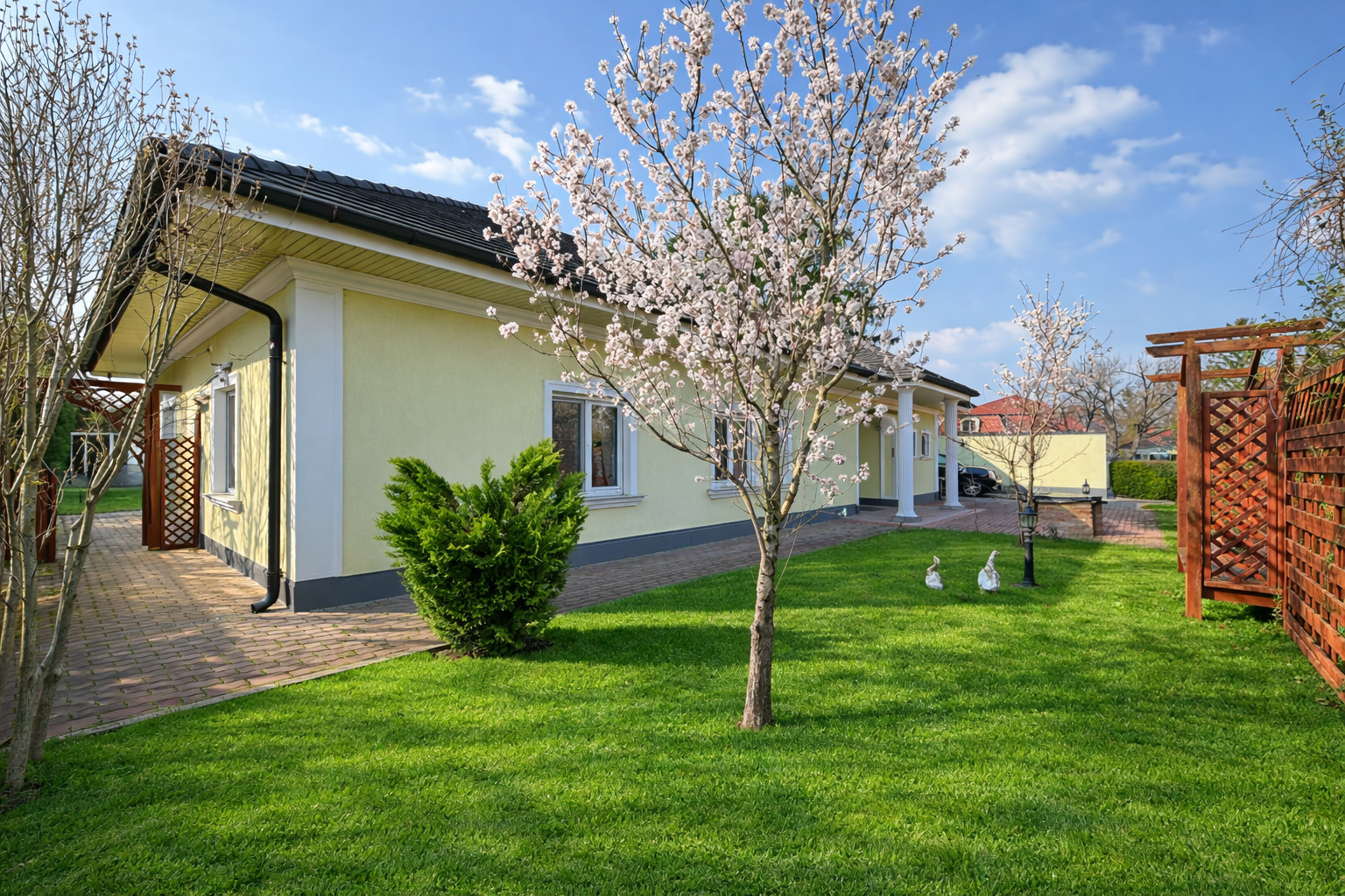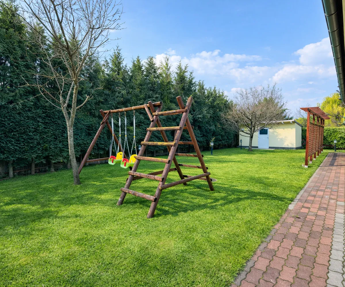 Auch im Außenbereich setzt sich das exklusive Lebensgefühl fort: Der gepflegte Garten mit automatischer Bewässerung, großzügige Terrassenflächen und ein überdachter Swimmingpool (8 × 4 m) laden zu entspannten Stunden und geselligen Abenden ein.