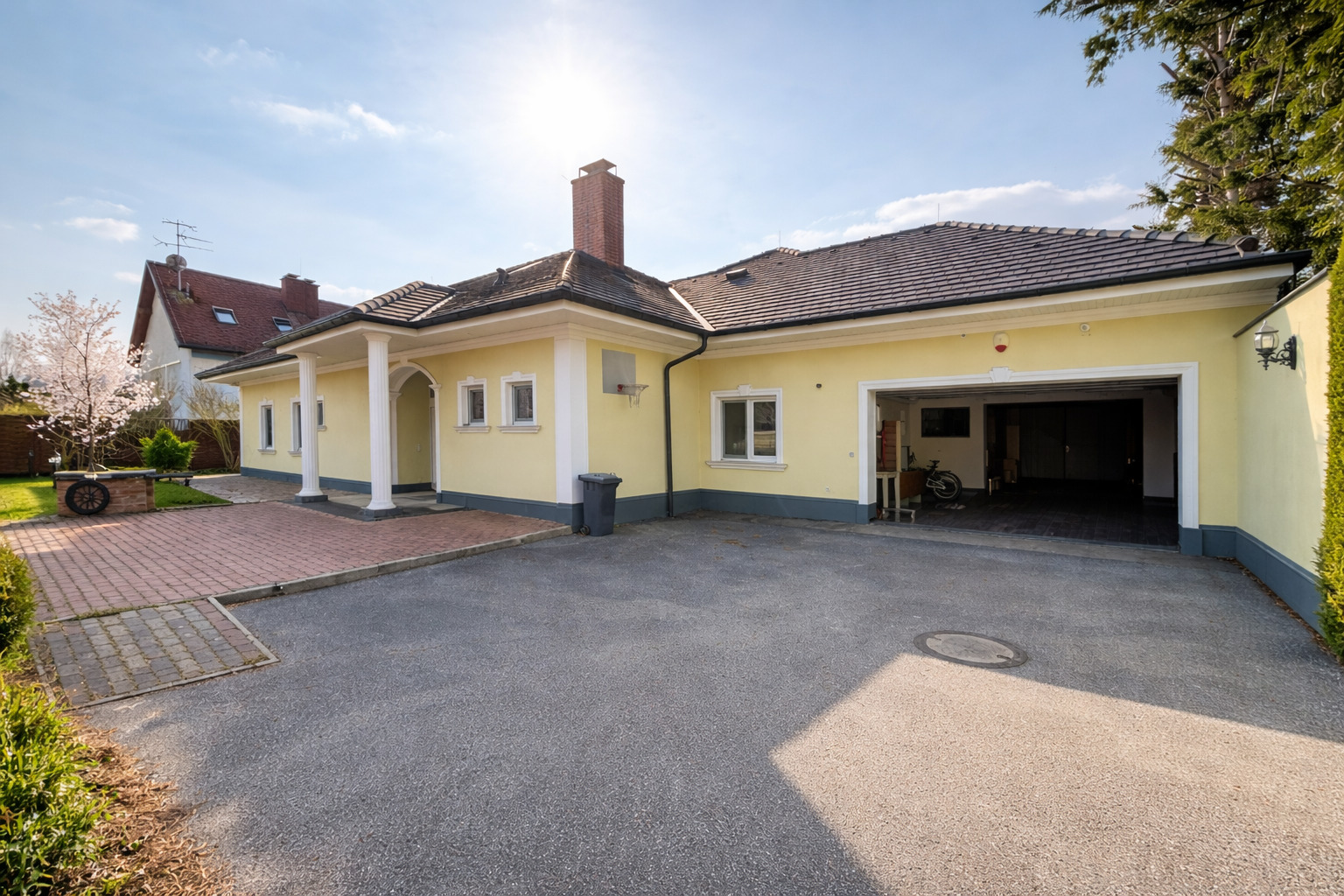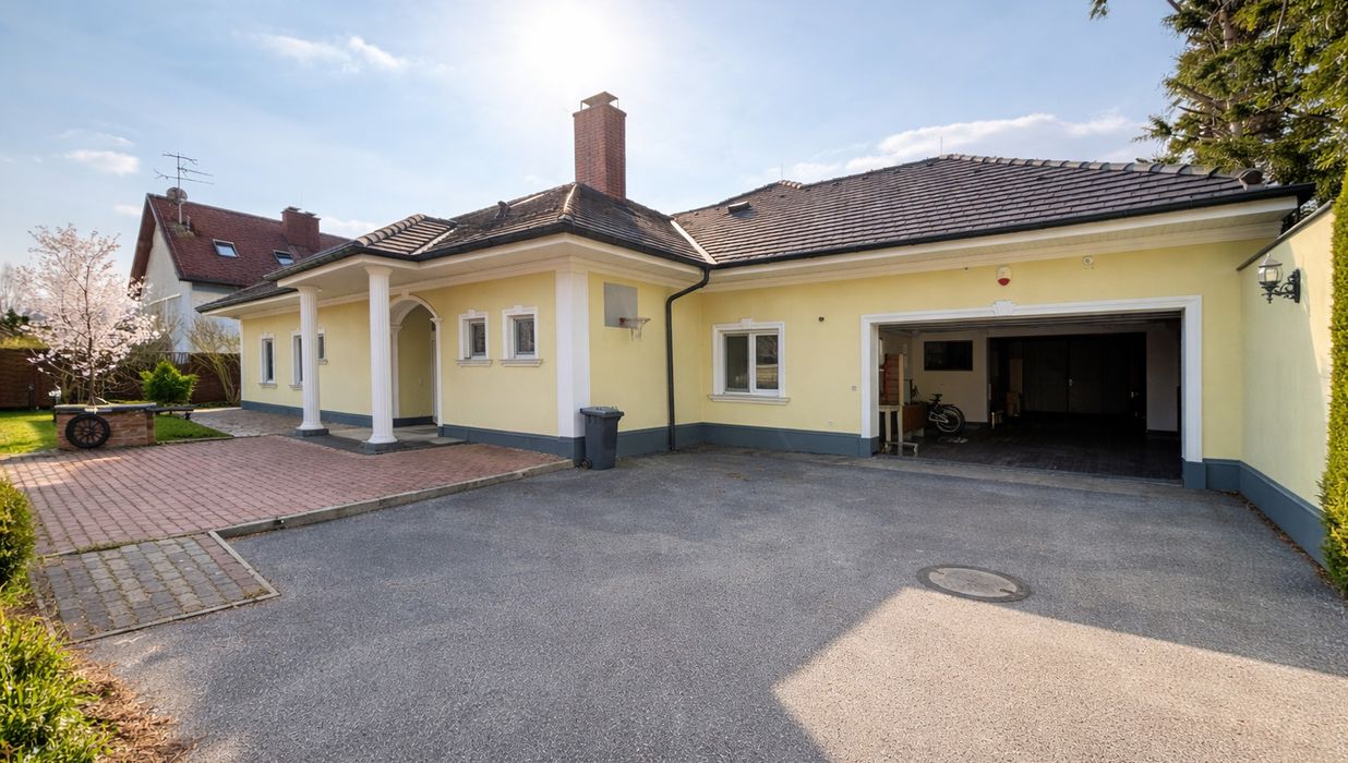 Bereits die lange, elektrisch gesicherte Zufahrt vermittelt ein Gefühl von Exklusivität. Eingebettet in ein gepflegtes, vollständig eingefriedetes Grundstück mit hoher Naturhecke genießen Sie hier absolute Privatsphäre. Die repräsentative Liegenschaft bietet rund 568 m² Wohnfläche , einen großzügigen Vorplatz mit mehreren Stellmöglichkeiten sowie eine integrierte Garage.