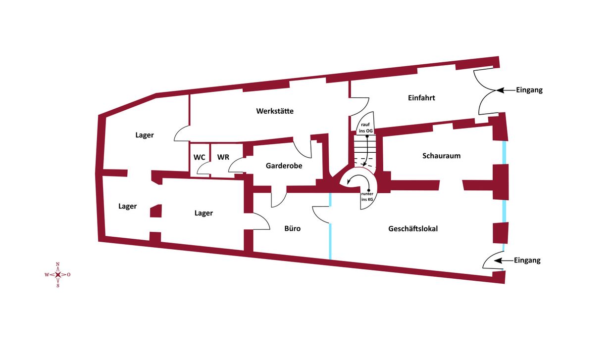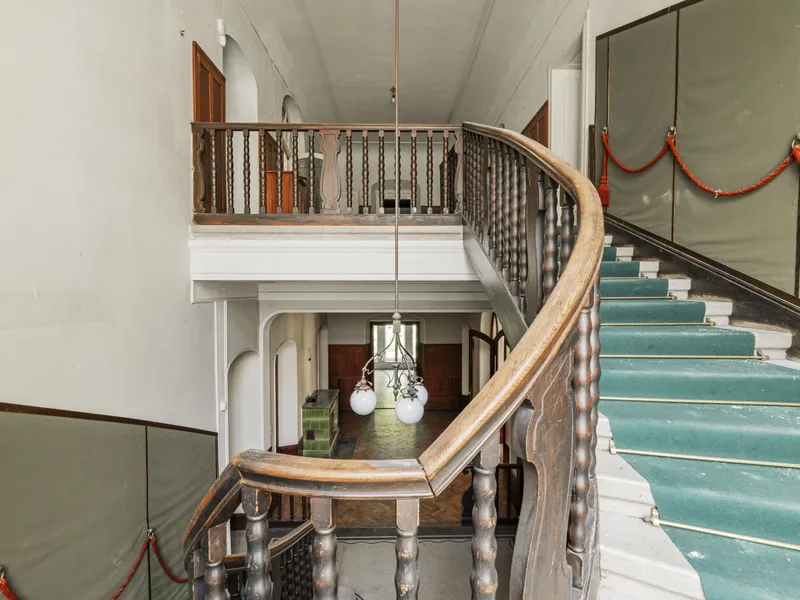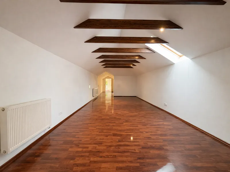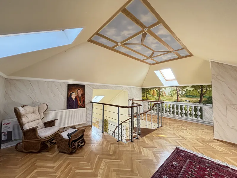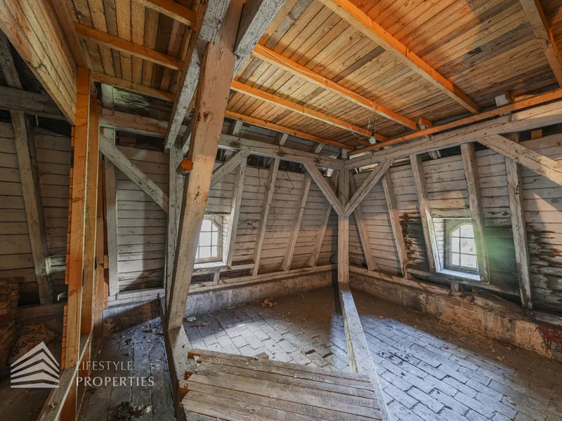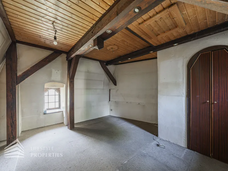 Im 1. und 2. Obergeschoss befinden sich jeweils großzügige Wohnflächen (oder Büroflächen) mit Bad und WC, im 1. OG zusätzlich mit uneinsehbarer Terrasse. Das Wohnzimmer im 2. OG überzeugt durch loftartigen Charakter. Das Dachgeschoss (errichtet ca. 1980) bietet weiteres Ausbaupotenzial. Die solide Bausubstanz sowie bis zu 80 cm dicke Außenmauern sorgen für ein angenehmes Wohnklima.