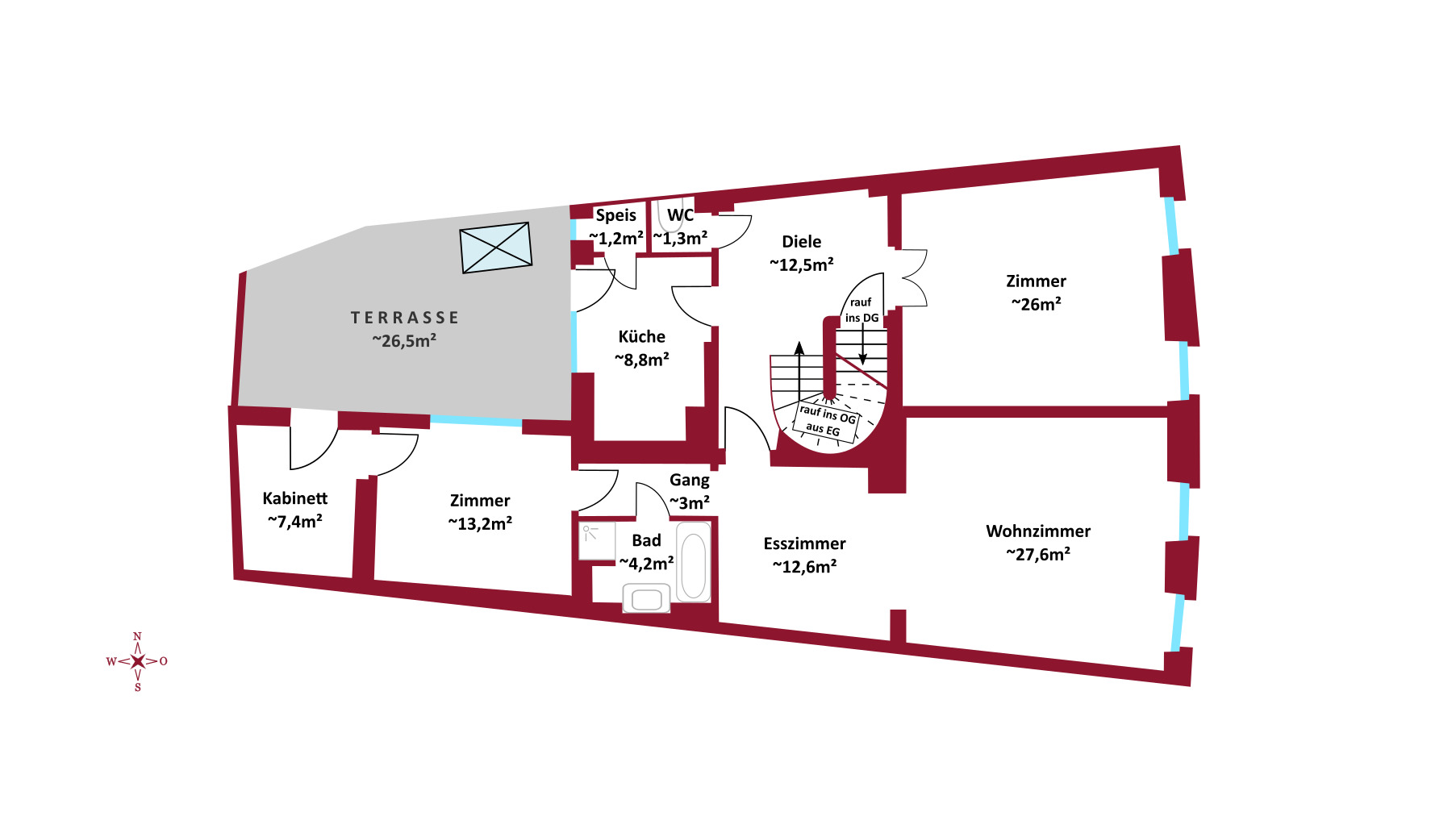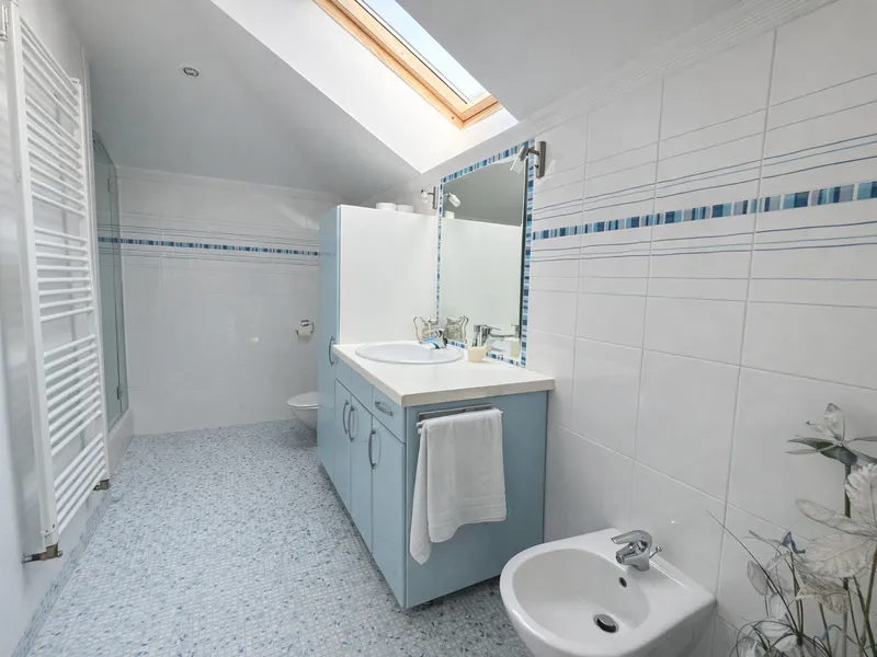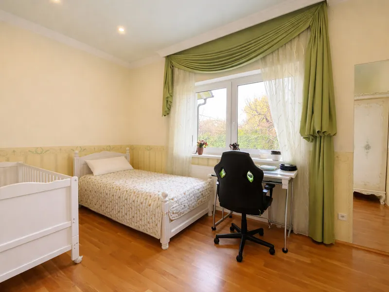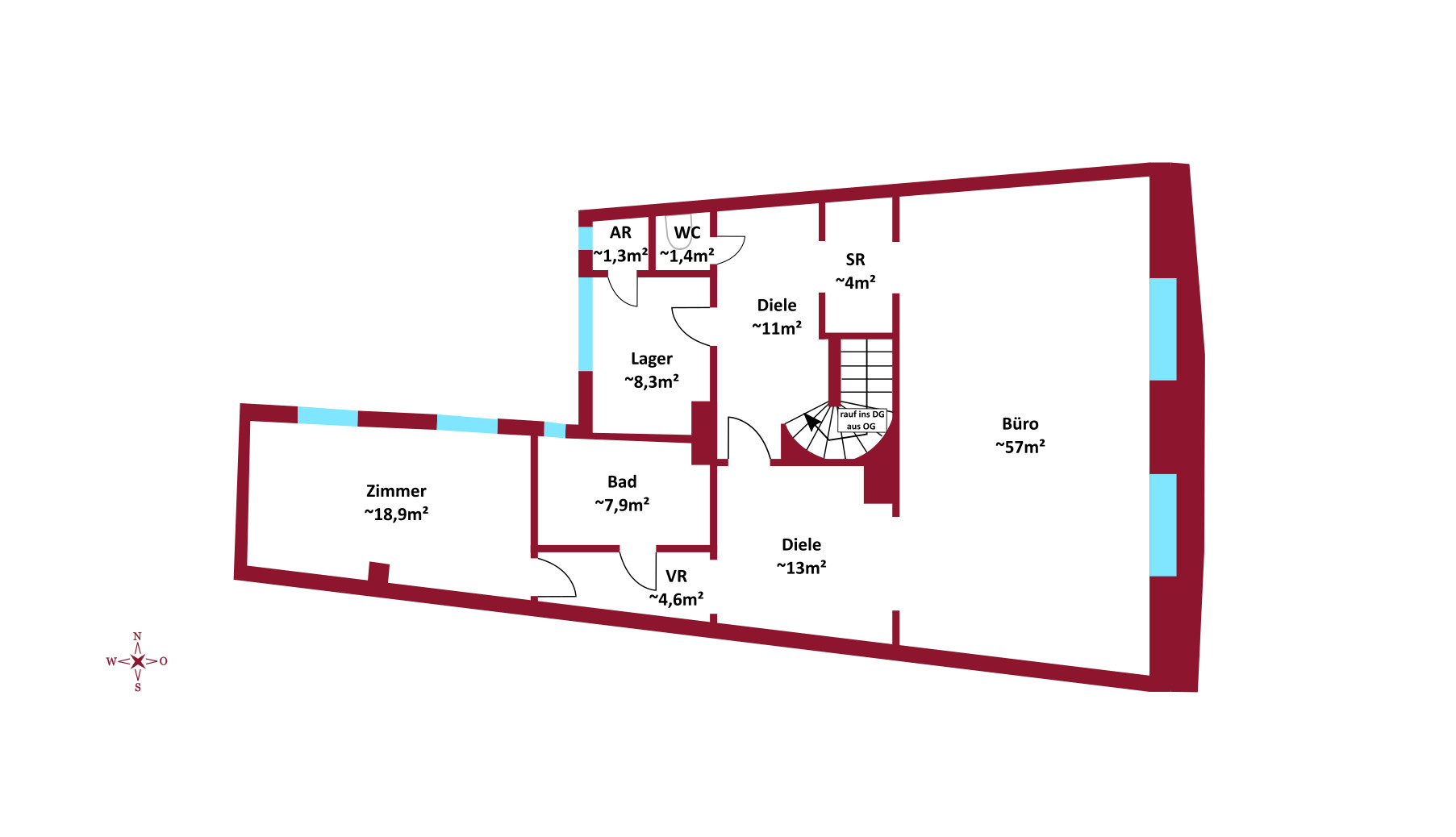 Im 1. und 2. Obergeschoss befinden sich jeweils großzügige Wohnflächen (oder Büroflächen) mit Bad und WC, im 1. OG zusätzlich mit uneinsehbarer Terrasse. Das Wohnzimmer im 2. OG überzeugt durch loftartigen Charakter. Das Dachgeschoss (errichtet ca. 1980) bietet weiteres Ausbaupotenzial. Die solide Bausubstanz sowie bis zu 80 cm dicke Außenmauern sorgen für ein angenehmes Wohnklima.