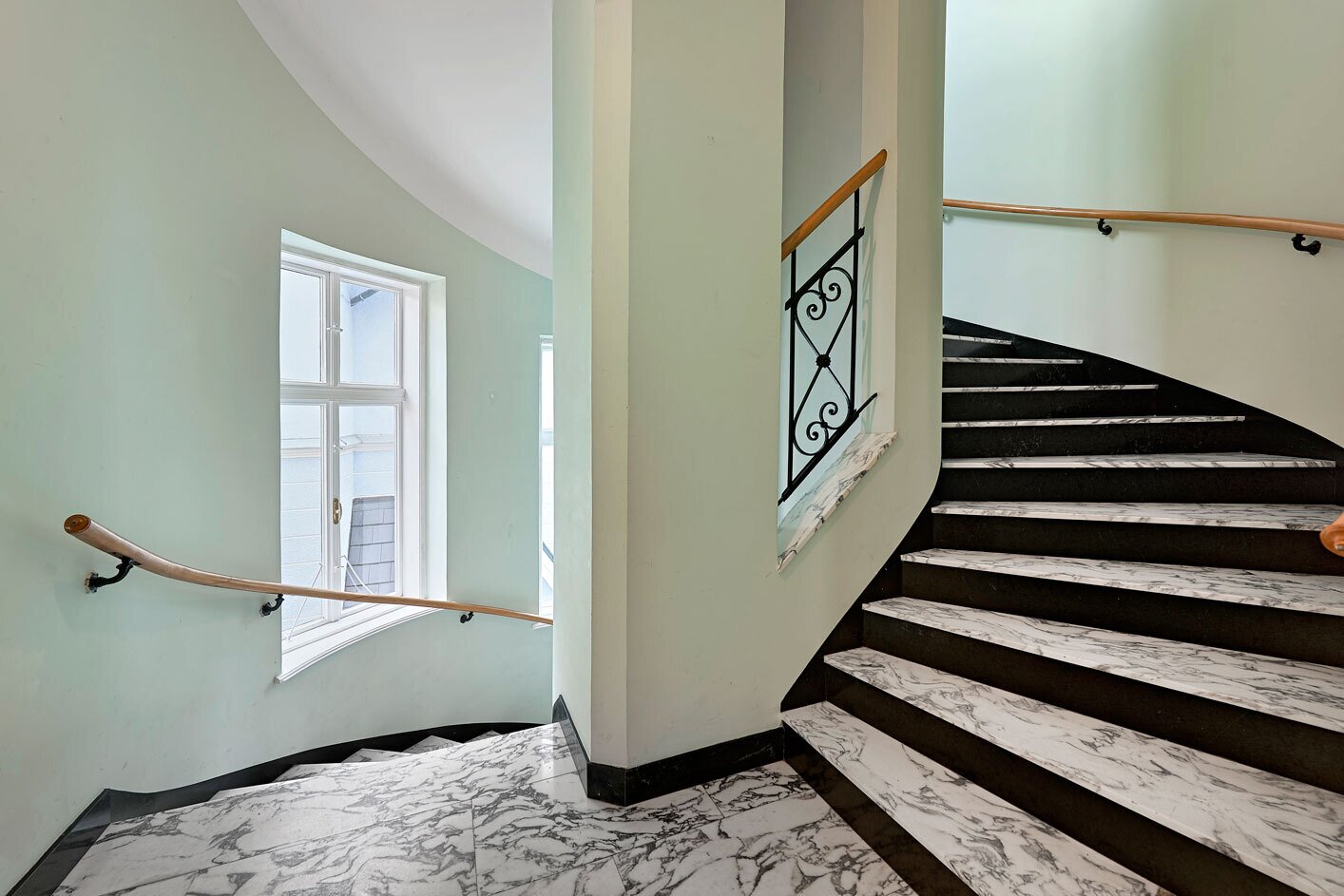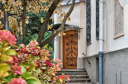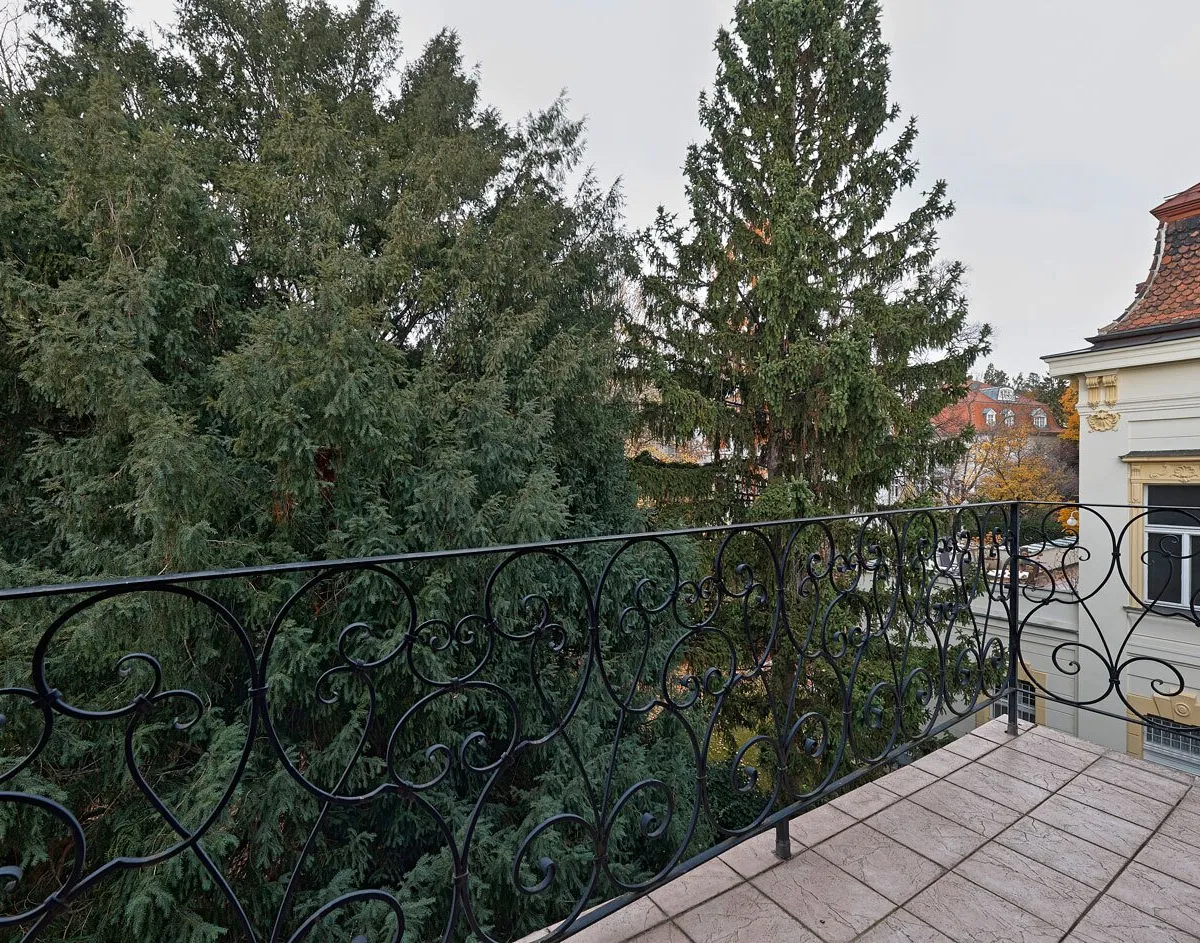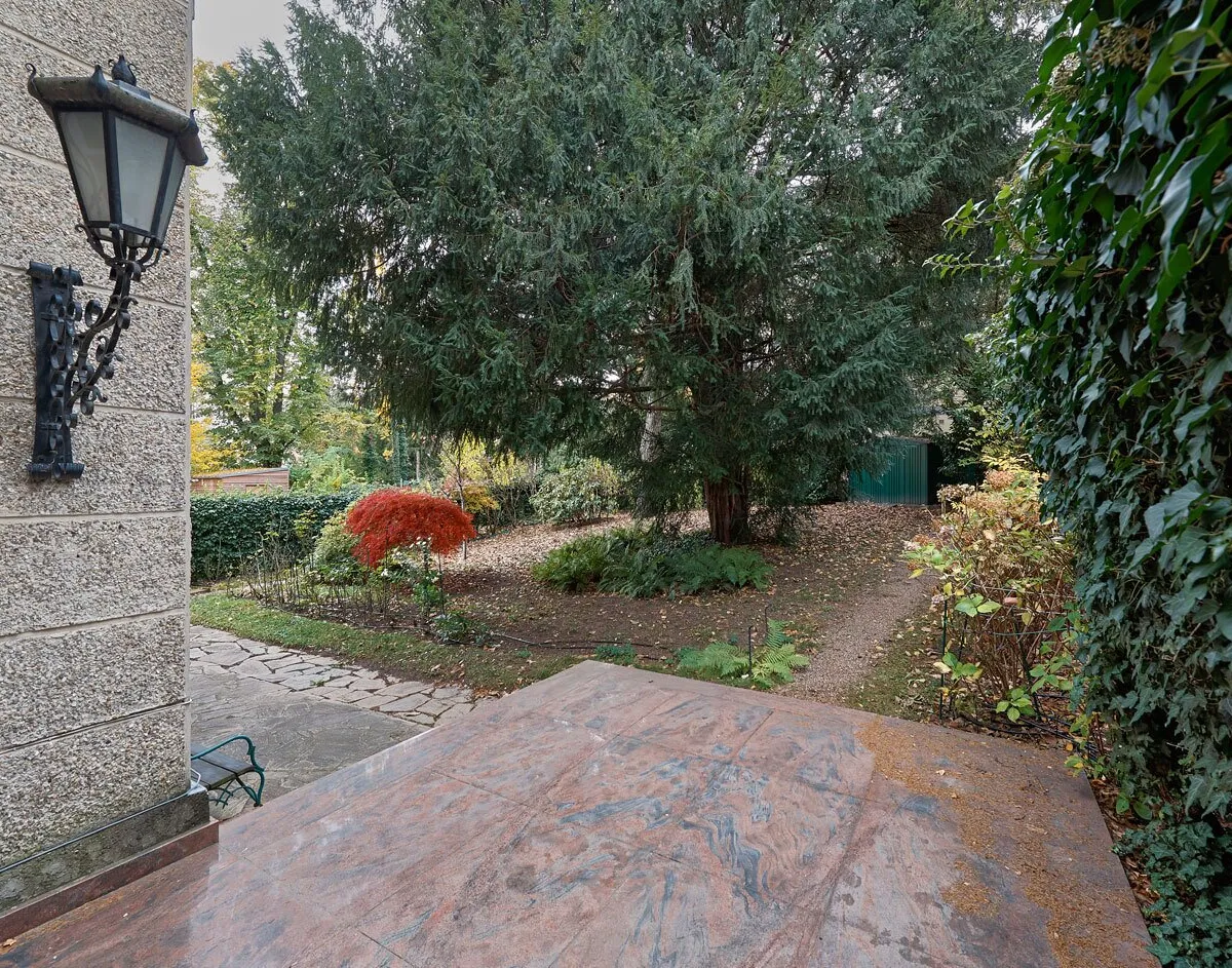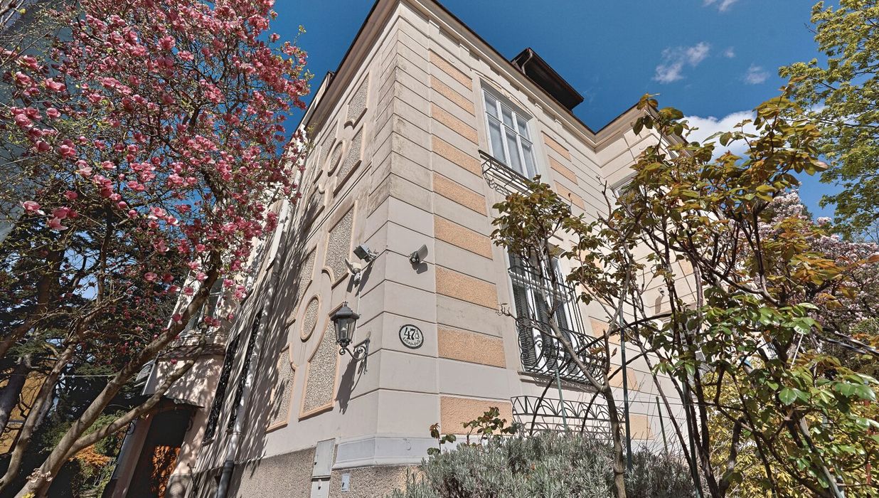 Zu den weiteren Stockwerken gelangt man über ein beeindruckendes Marmorstiegenhaus. Das Obergeschoss , zuletzt um 2005 saniert, präsentiert sich mit einem hellen, großzügigen Wohnsalon und vier weiteren Räumen, während das Dachgeschoss mit vier gemütlichen Zimmern und zwei Terrassen einen atemberaubenden Ausblick über die Baumkronen bietet. Die Villa verfügt über insgesamt vier Badezimmer, sieben WCs, eine erneuerte Gaszentralheizung, Klimaanlage in Teilen des Hauses, Sicherheitstüren sowie eine kleine Garage. Das Objekt ist außerdem vollständig unterkellert, inklusive Technikraum, Wirtschaftsbereich, zusätzlichem Badezimmer sowie reichlich Stauraum und praktischer Nutzfläche.
