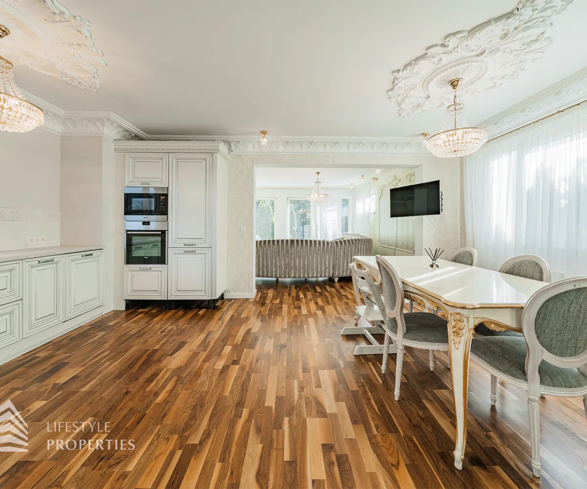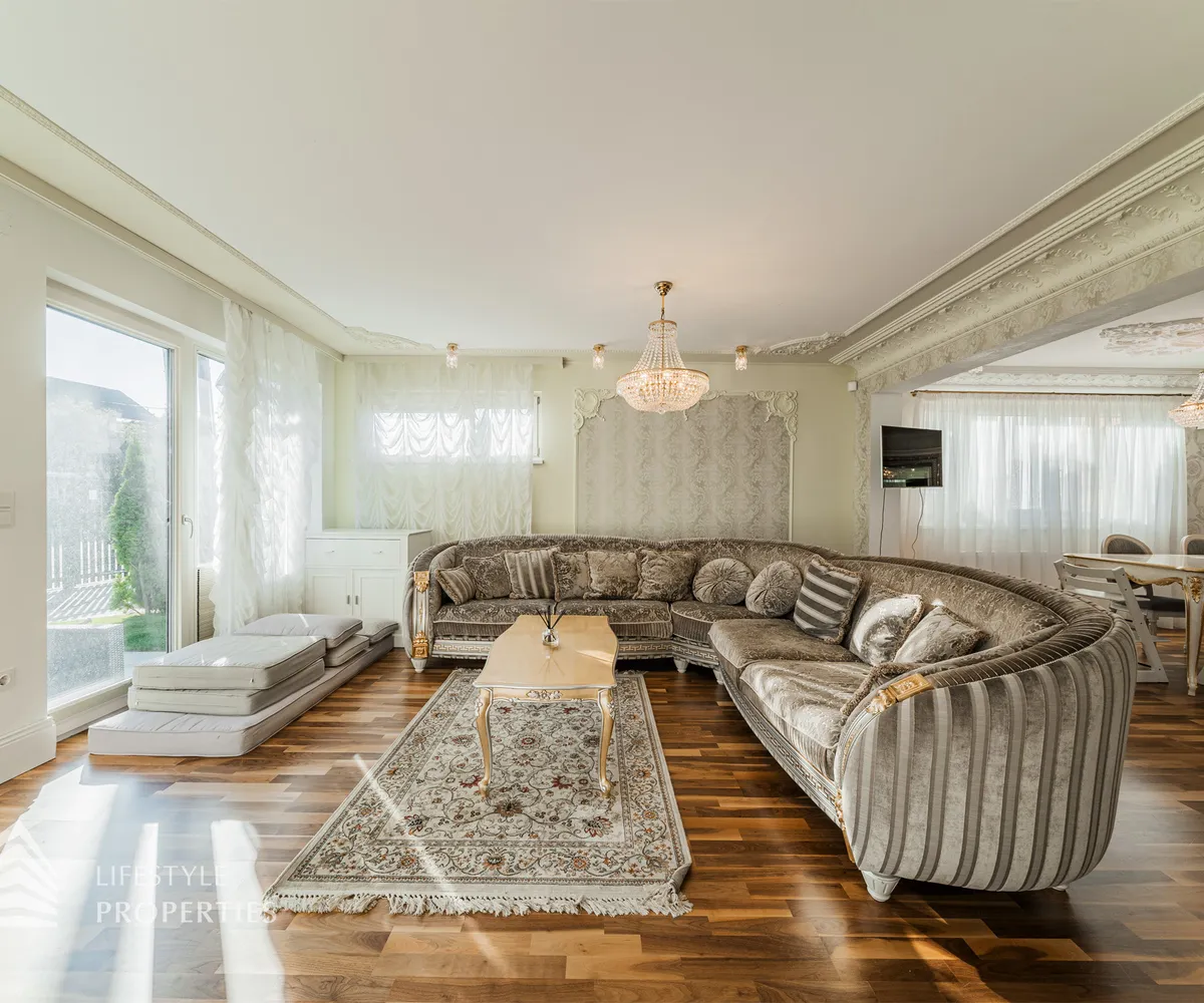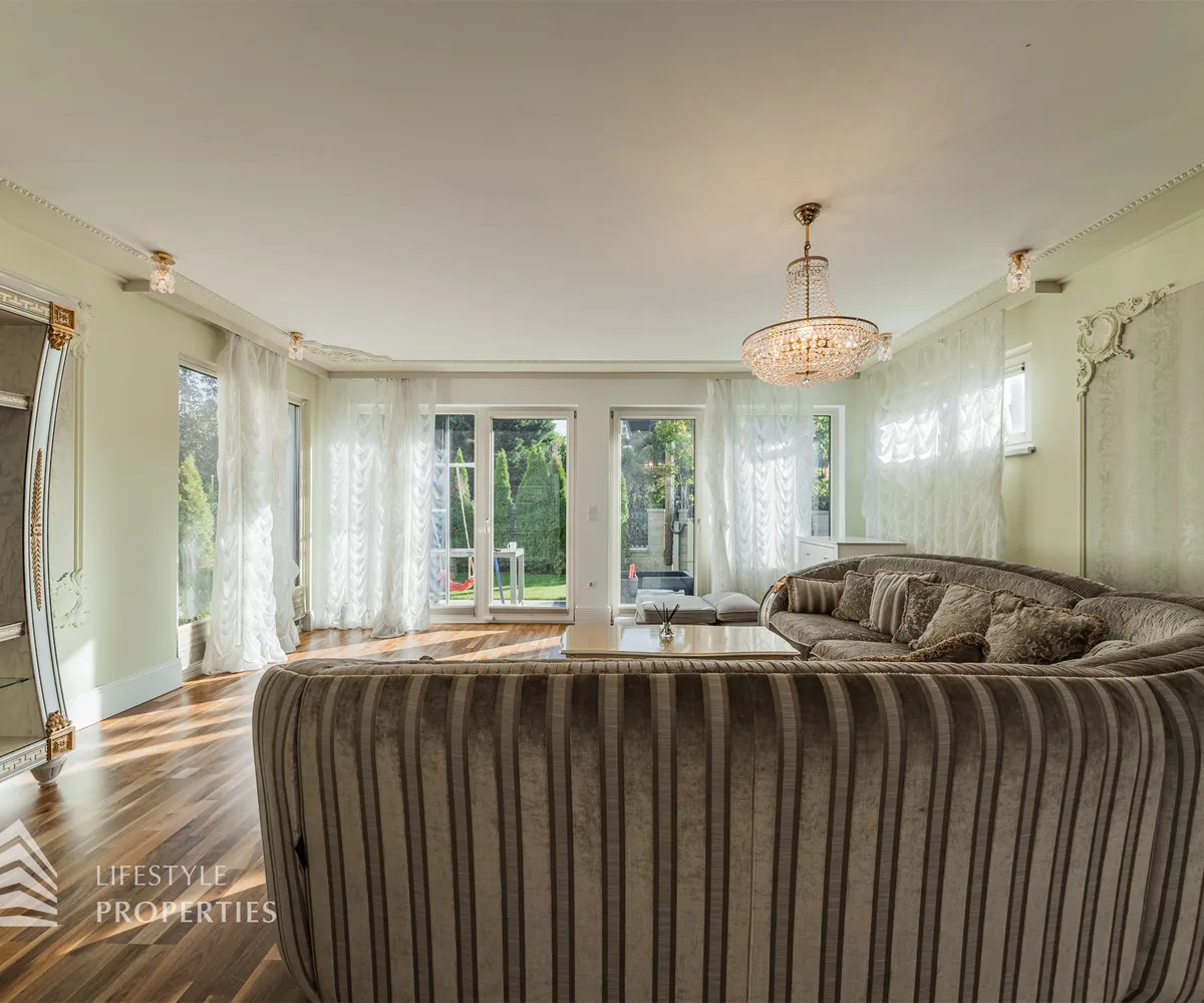 Sie betreten das Haus und befinden sich im geräumigen Vorraum, welcher mit einer wunderschönen Tapete ausgeschmückt ist. Von hier aus gelangen Sie zur ersten Toilette. Diese verfügt über einen traumhaften Kronleuchter und wurde mit stilvollen Fliesen ausgekleidet. Danach gelangen Sie direkt in das ca.26,82 m² großen Esszimmer mit Küche. Dort treffen Sie auf eine traumhafte Küche, welche mit modernsten Geräten ausgestattet ist und Ihnen viel Stauraum bietet. Des Weiteren verfügt das Esszimmer über einen wunderschönen, weißen Esstisch. Von dort aus gelangen Sie weiter in das ca. 27,78 m² große Wohnzimmer, welches durch die vielen Fenster mit Licht durchflutet wird und dadurch sehr hell und einladend erscheint. Sie treffen hier auf eine große Couchlandschaft, von welcher aus sie einen traumhaften Blick in den Garten genießen können. Über das Wohnzimmer erreichen Sie den Garten mit Terrasse.