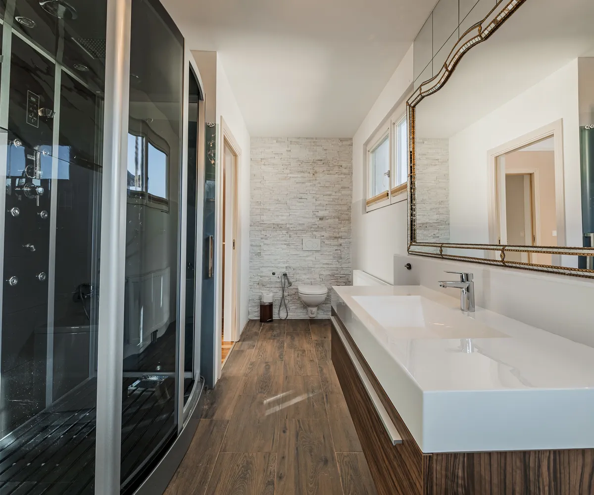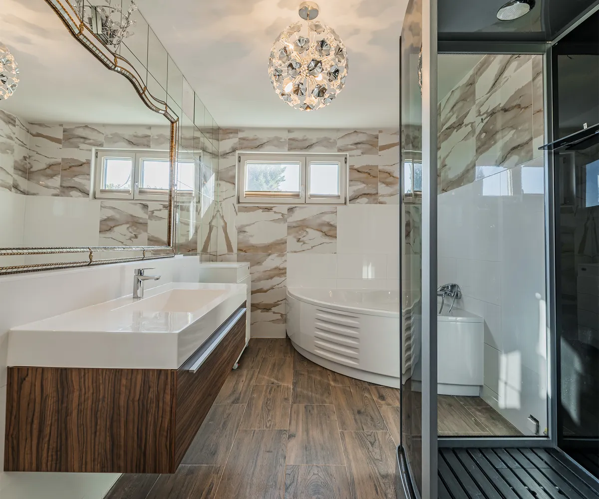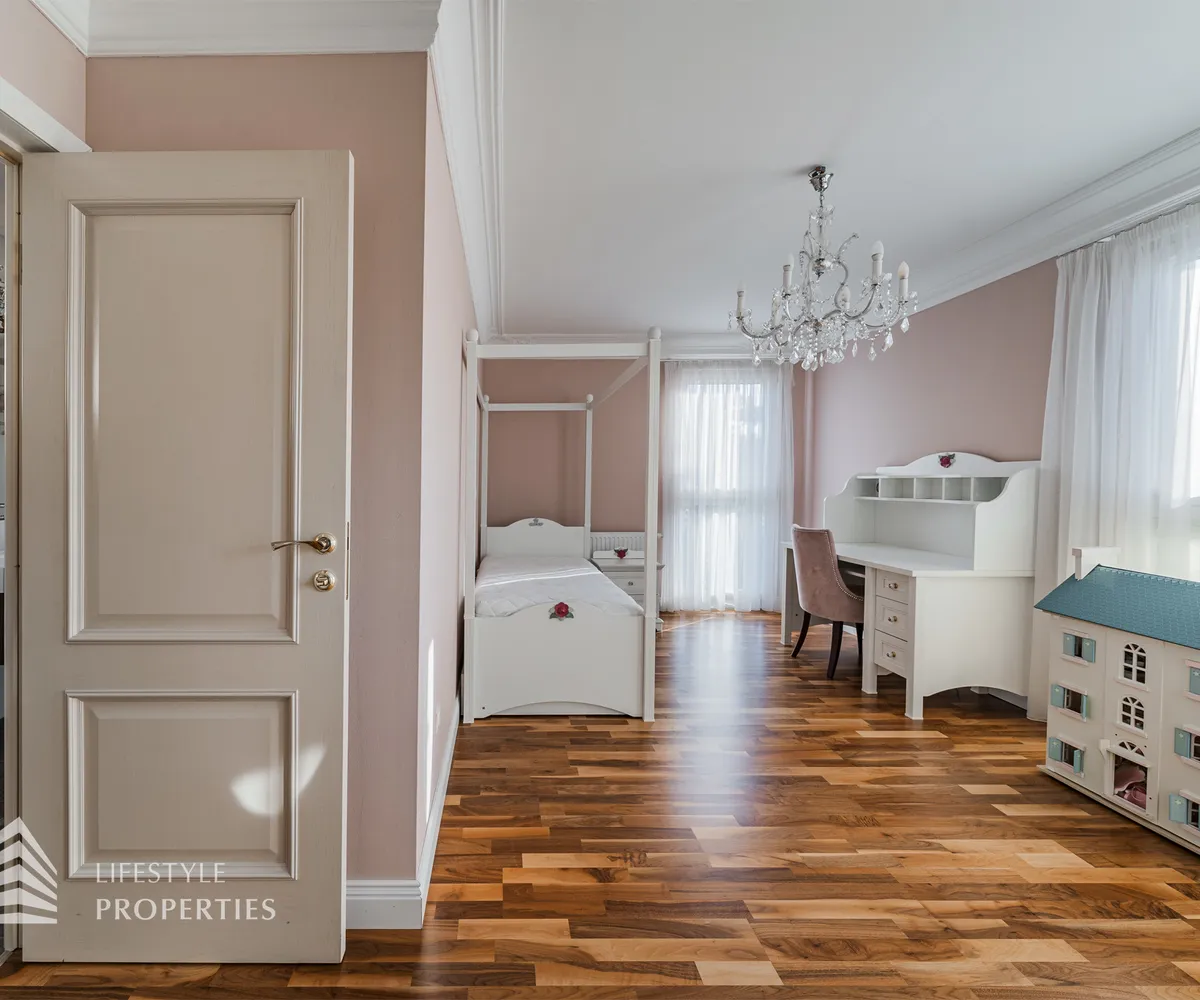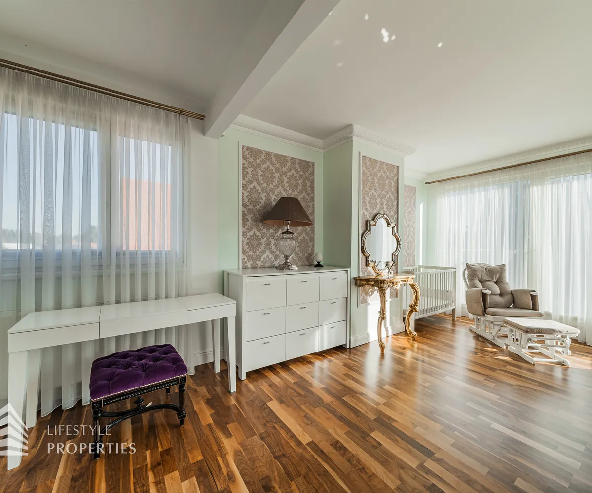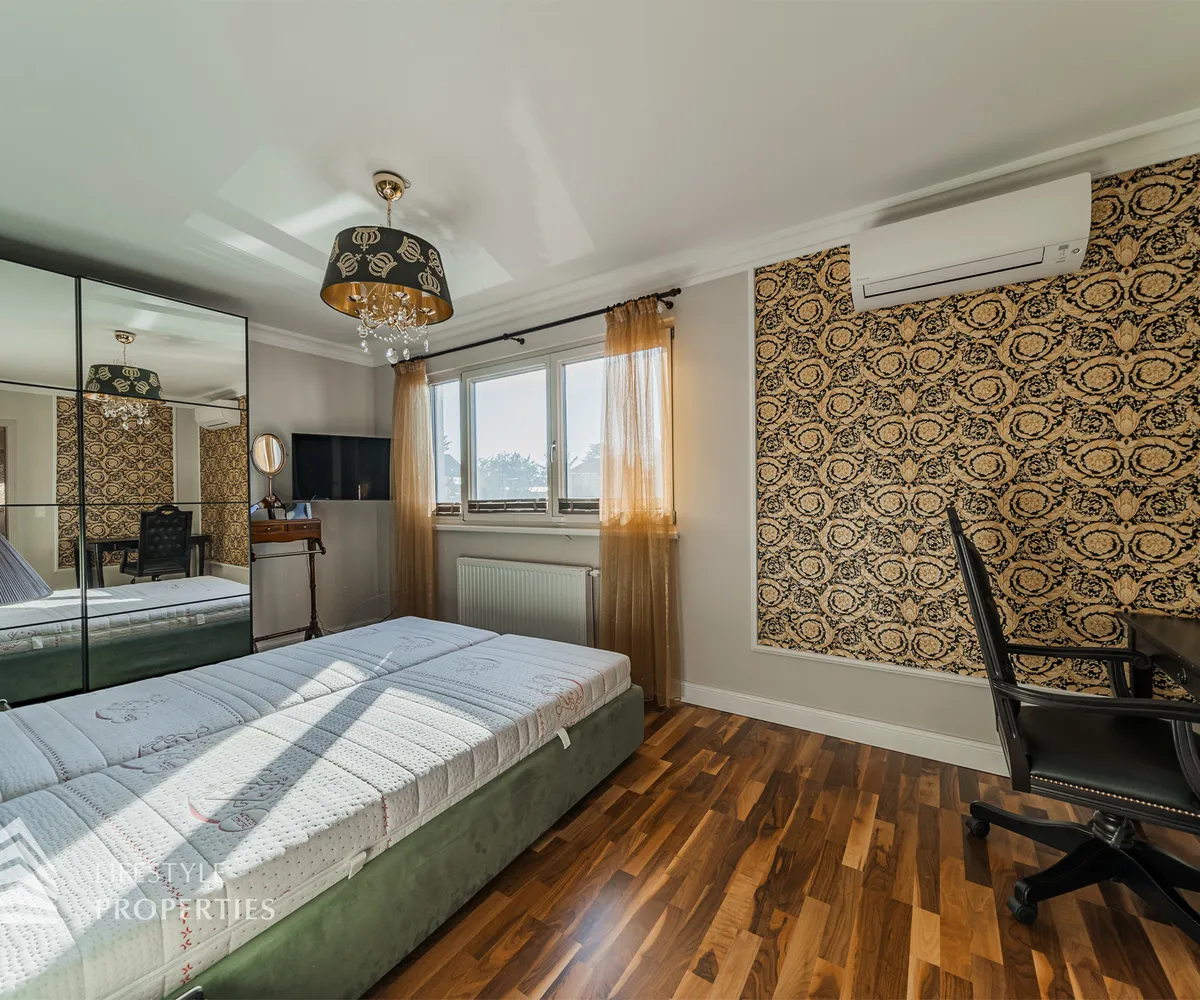 Über die Treppe, welche sie vom Vorraum aus erreichen, gelangen Sie direkt in das Obergeschoss. Dort treffen Sie auf zwei Zimmer, welche ca. 15,11 m² und 18,27 m² groß sind, sowie auf zwei Bäder, einen Schrankraum und einen Abstellraum. Über einen Gang treffen Sie auf das kleinere der beiden Zimmer. Das Zimmer dient idealerweise als Kinderzimmer, da es schon mit einem Kinderbett ausgestattet ist. Ein Schreibtisch, ein schöner Kleiderschrank und ein traumhafter Kronleuchter sind ebenfalls vorhanden. Sie gelangen danach in das erste wunderschöne Badezimmer, welches über eine Badewanne, eine schöne Dusche und einem großen Waschbecken verfügt. Das Besondere an diesem Badezimmer ist, dass die Dusche mit einer stilvollen Duschkabine ausgestattet ist. Das Badezimmer ist mit schönen Farben gestaltet und wirkt sehr einladend. Danach gelangen Sie in das nächste Zimmer, über ein schönes Doppelbett verfügt und durch die Fenster angenehm hell wirkt. Ausgestattet ist es ebenfalls mit einem schönen Schreibtisch und einem Kleiderschrank mit Spiegel. Hier treffen Sie auf ein eigenes Badezimmer, welches über eine Badewanne, einem Waschbecken und einer Toilette verfügt. Zudem ist das Badezimmer mit wunderschönen Fliesen verlegt worden, welches dem Raum einen unglaublichen Charme gewährt.