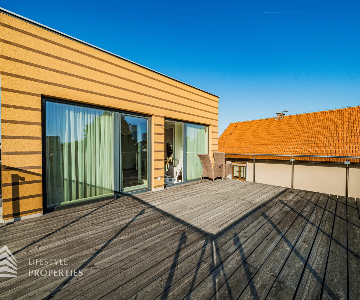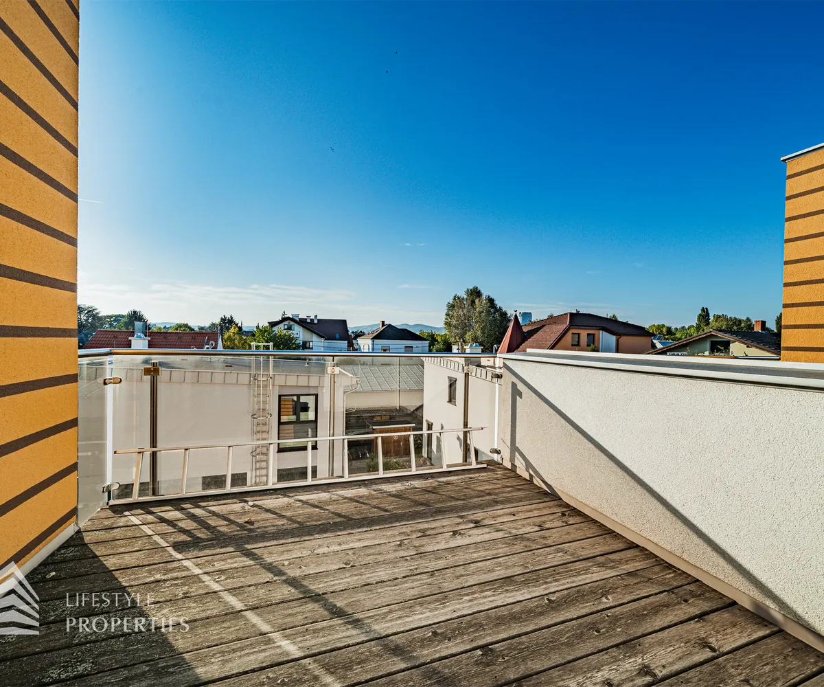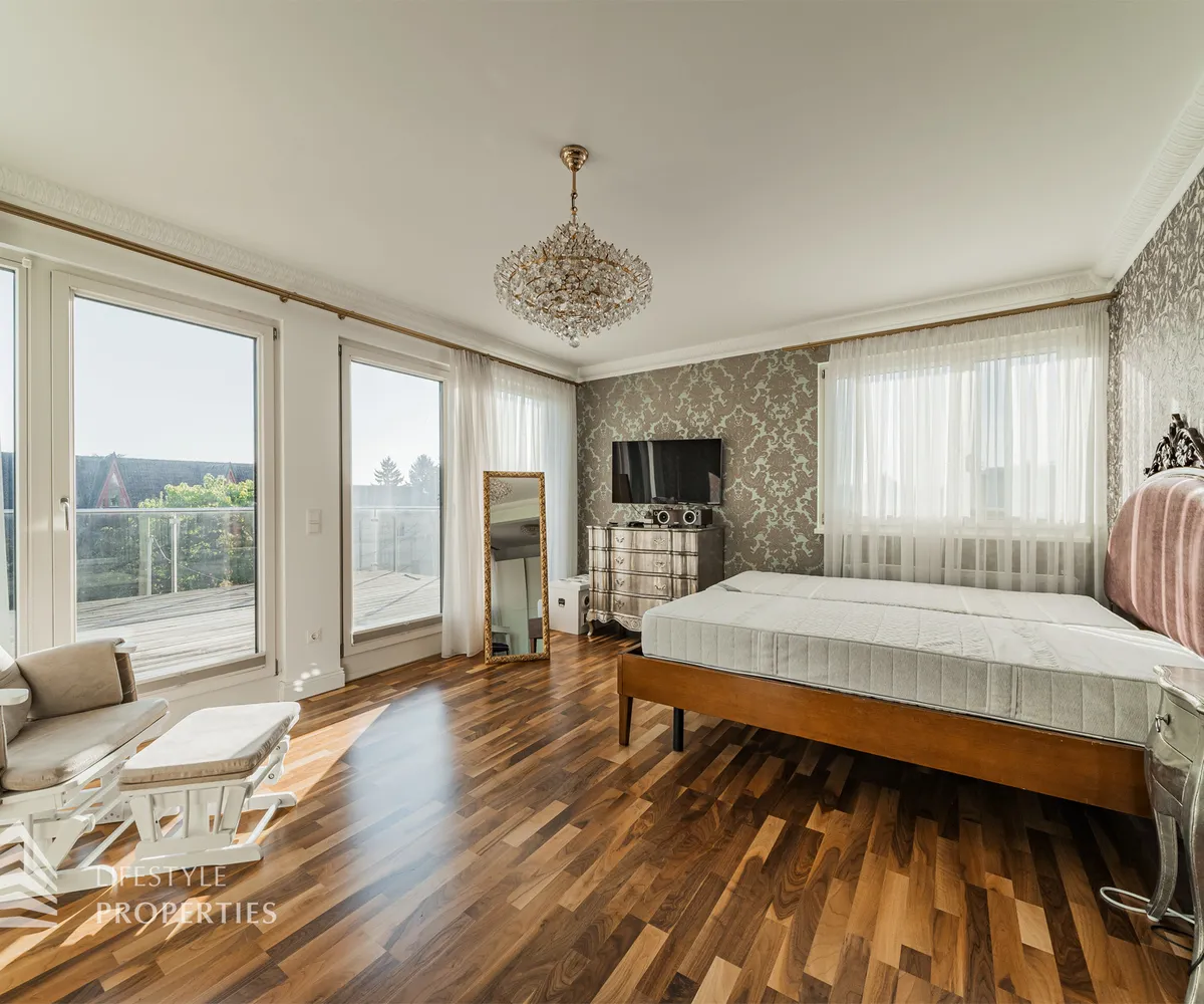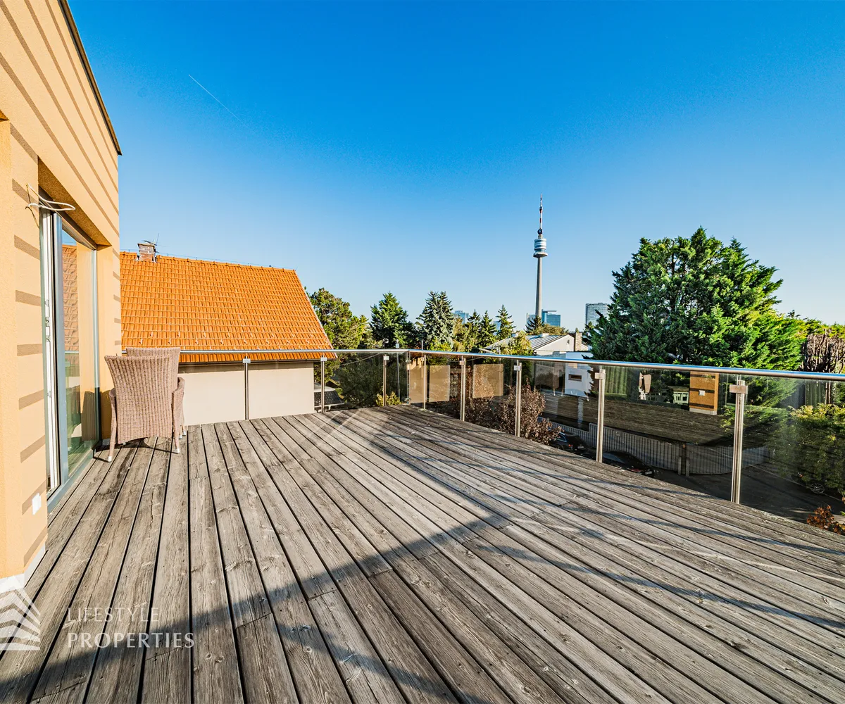 Über die Treppe hinauf gelangen Sie nun ins Dachgeschoss, wo sich auch das wunderschöne, ca. 28,78 m² große Schlafzimmer befindet. Wenn Sie das Zimmer betreten, werden Sie vom Charme dieses Zimmers begeistert sein. Der Raum hat einen direkten Zugang auf die ca. 23,58 m² große Terrasse. Die traumhafte Terrasse ist mit wunderschönen Terrassendielen verlegt worden und bietet viel Platz für eine gemütliche Sitzgelegenheit. Hier können Sie die frische Luft genießen und vom Alltag abschalten. Das Schlafzimmer verfügt über ein Doppelbett, einem eleganten Couchsessel und diverse andere Möbel. Der Raum ist angenehm lichtdurchflutet und bietet einen traumhaften Ausblick. Das Schlafzimmer besitzt außerdem auch über ein eigenes, wunderschönes Badezimmer. Dieses ist mit wunderschönen, dunklen Marmorfliesen ausgekleidet und besitzt eine Toilette, eine große Dusche, und ein stilvolles Waschbecken. Außerdem befindet sich im Dachgeschoss eine weitere Terrasse mit ca. 8,06 m². Im Keller angelangt, treffen Sie auf eine große Waschküche. Hier haben Sie genügend Platz, um diverse Dinge verstauen zu können. Die Lage und die Infrastruktur dieses Hauses könnten nicht besser sein! Die Alte Donau befindet sich nur wenige Minuten von Ihnen entfernt. Dort befinden sich wunderschöne Badestrände und Freibäder. Auch die sportlichen Aktivitäten kommen nicht zu kurz: Stand Up Paddling, Boot fahren, Surfen, Segeln usw. Auch die Anbindung an den öffentlichen Verkehr ist hervorragend. Die Bushaltestelle „Friedstraße“ (20 A), die U-Bahn-Station „Neue Donau“ (U6) und sämtliche Straßenbahnlinien befinden sich in unmittelbarer Nähe. Auch Volksschulen, Mittelschulen und Gymnasien sind in der Nähe auffindbar.