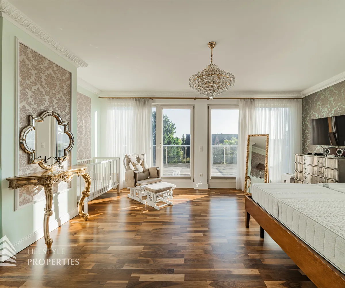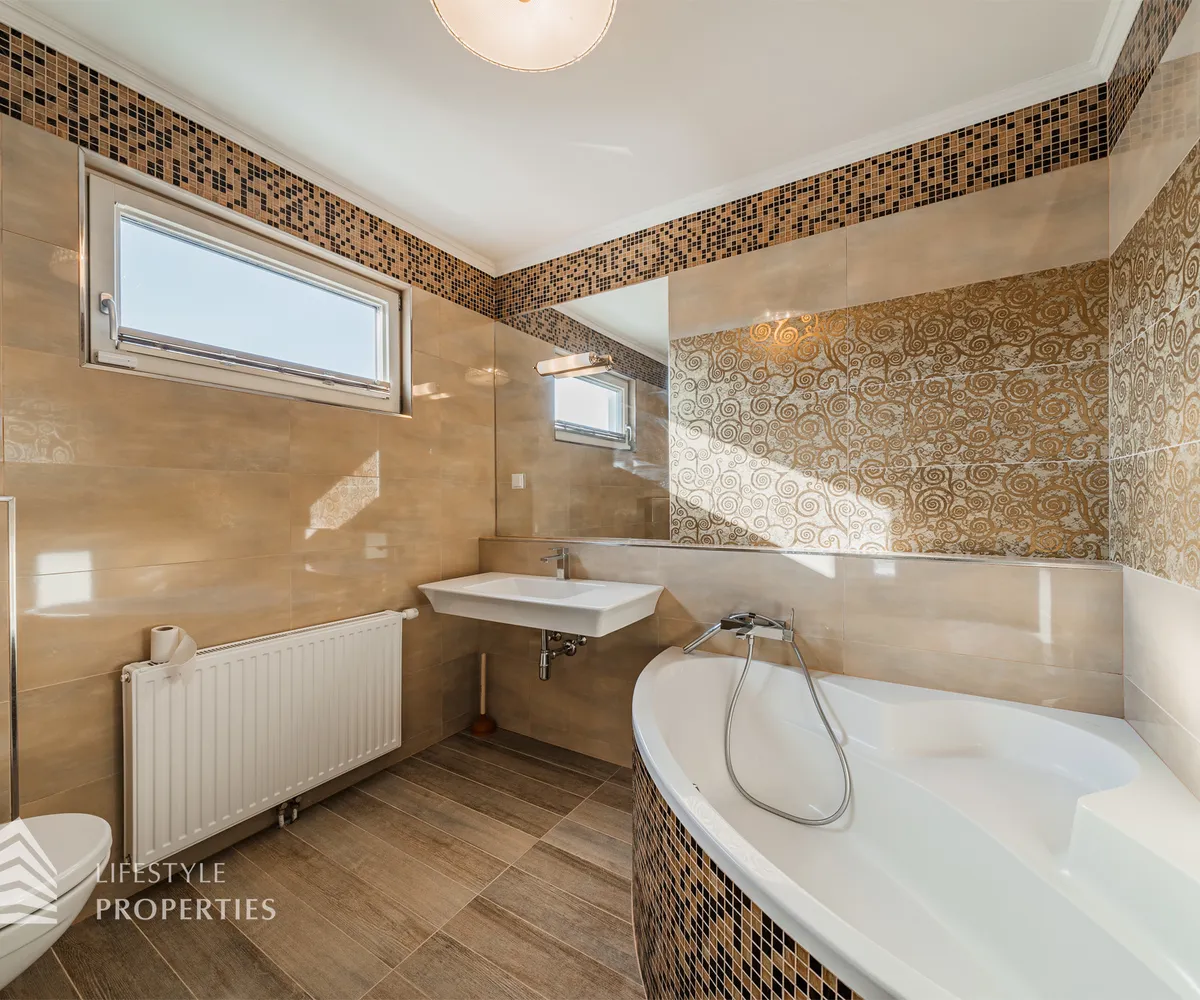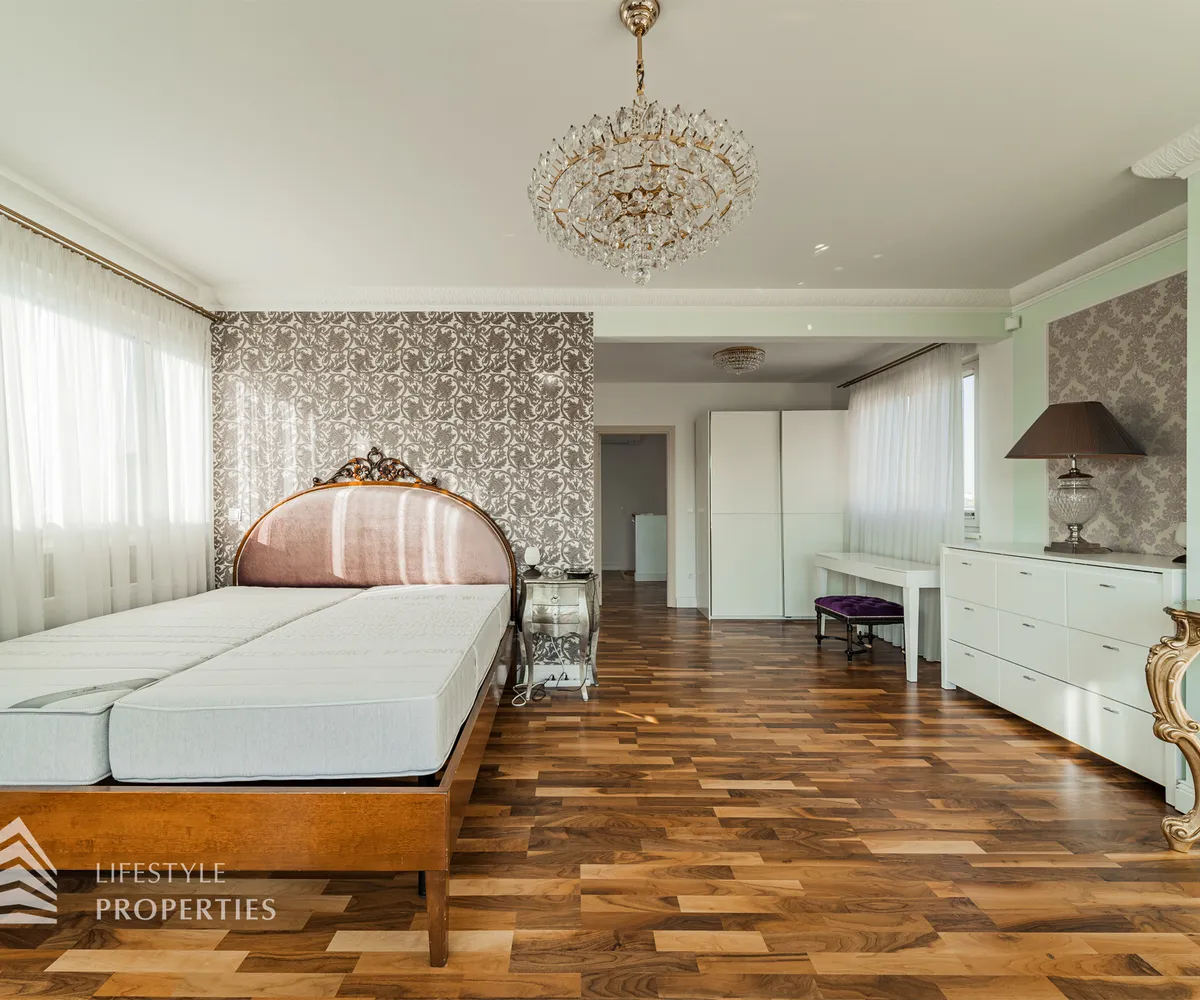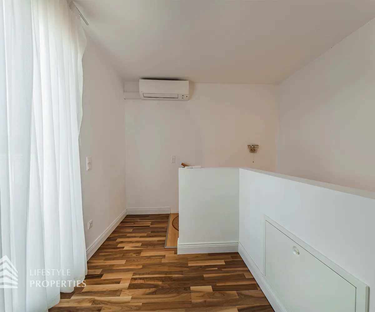 Über die Treppe hinauf gelangen Sie nun ins Dachgeschoss, wo sich auch das wunderschöne, ca. 28,78 m² große Schlafzimmer befindet. Wenn Sie das Zimmer betreten, werden Sie vom Charme dieses Zimmers begeistert sein. Der Raum hat einen direkten Zugang auf die ca. 23,58 m² große Terrasse. Die traumhafte Terrasse ist mit wunderschönen Terrassendielen verlegt worden und bietet viel Platz für eine gemütliche Sitzgelegenheit. Hier können Sie die frische Luft genießen und vom Alltag abschalten. Das Schlafzimmer verfügt über ein Doppelbett, einem eleganten Couchsessel und diverse andere Möbel. Der Raum ist angenehm lichtdurchflutet und bietet einen traumhaften Ausblick. Das Schlafzimmer besitzt außerdem auch über ein eigenes, wunderschönes Badezimmer. Dieses ist mit wunderschönen, dunklen Marmorfliesen ausgekleidet und besitzt eine Toilette, eine große Dusche, und ein stilvolles Waschbecken. Außerdem befindet sich im Dachgeschoss eine weitere Terrasse mit ca. 8,06 m². Im Keller angelangt, treffen Sie auf eine große Waschküche. Hier haben Sie genügend Platz, um diverse Dinge verstauen zu können. Die Lage und die Infrastruktur dieses Hauses könnten nicht besser sein! Die Alte Donau befindet sich nur wenige Minuten von Ihnen entfernt. Dort befinden sich wunderschöne Badestrände und Freibäder. Auch die sportlichen Aktivitäten kommen nicht zu kurz: Stand Up Paddling, Boot fahren, Surfen, Segeln usw. Auch die Anbindung an den öffentlichen Verkehr ist hervorragend. Die Bushaltestelle „Friedstraße“ (20 A), die U-Bahn-Station „Neue Donau“ (U6) und sämtliche Straßenbahnlinien befinden sich in unmittelbarer Nähe. Auch Volksschulen, Mittelschulen und Gymnasien sind in der Nähe auffindbar.