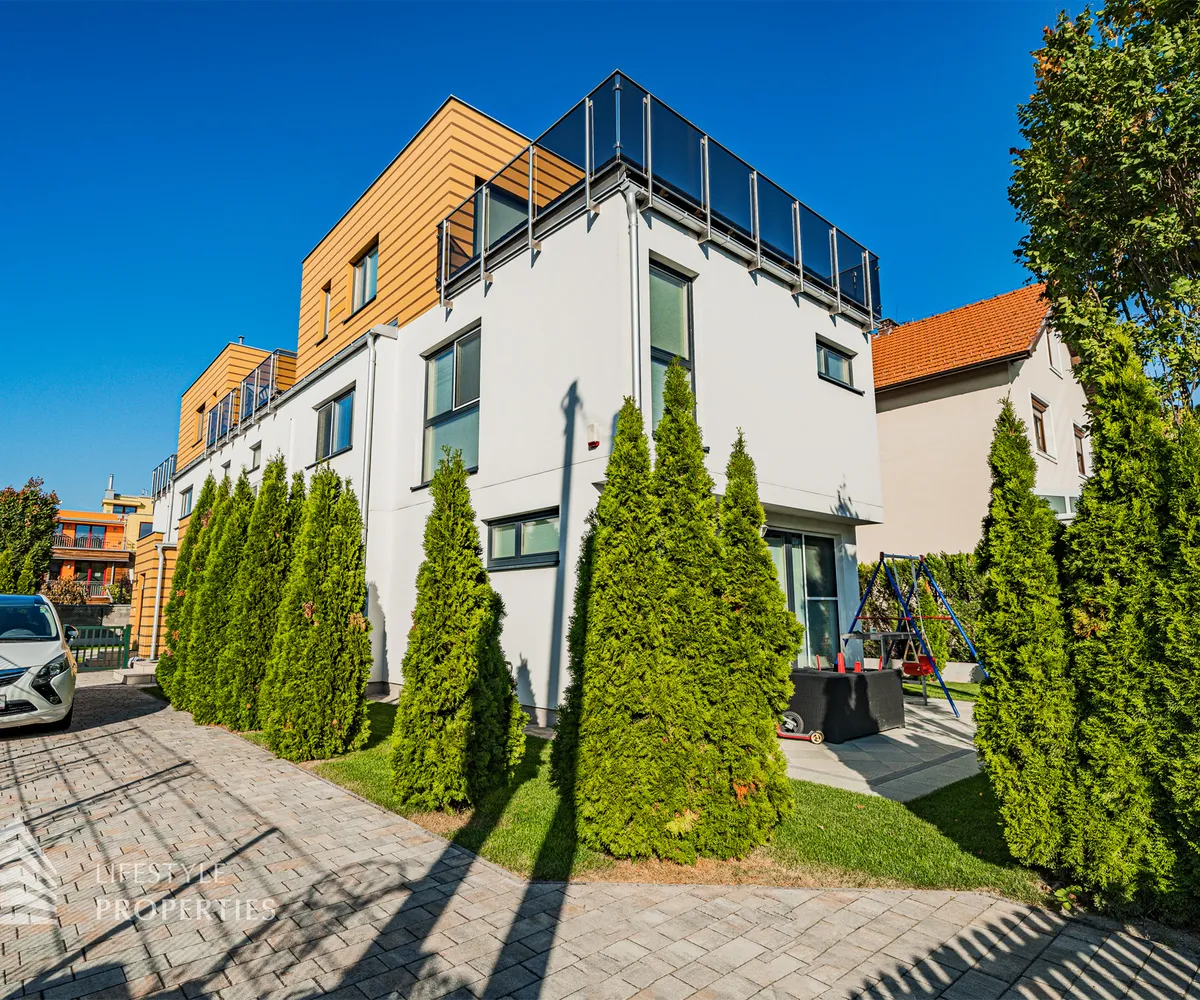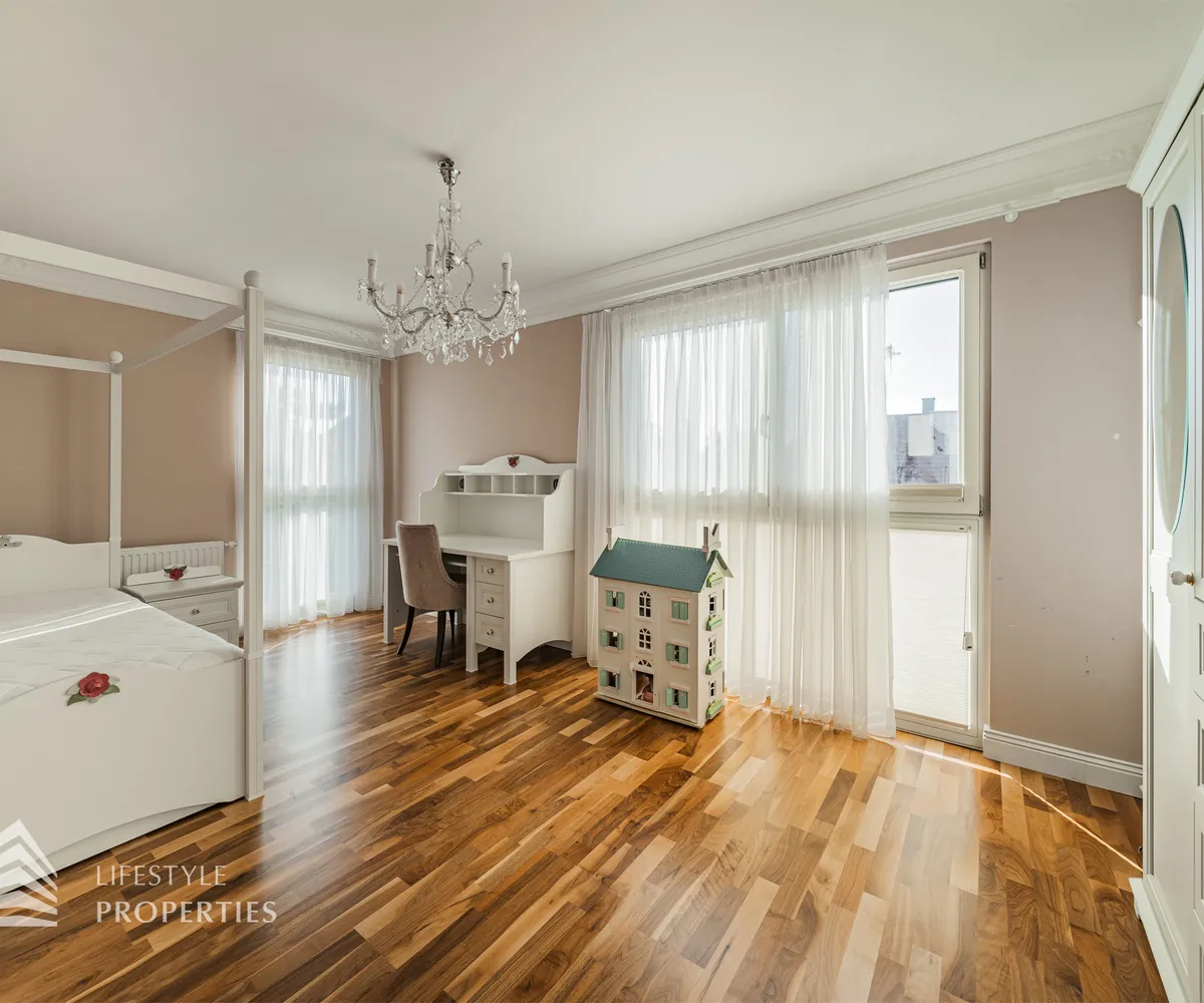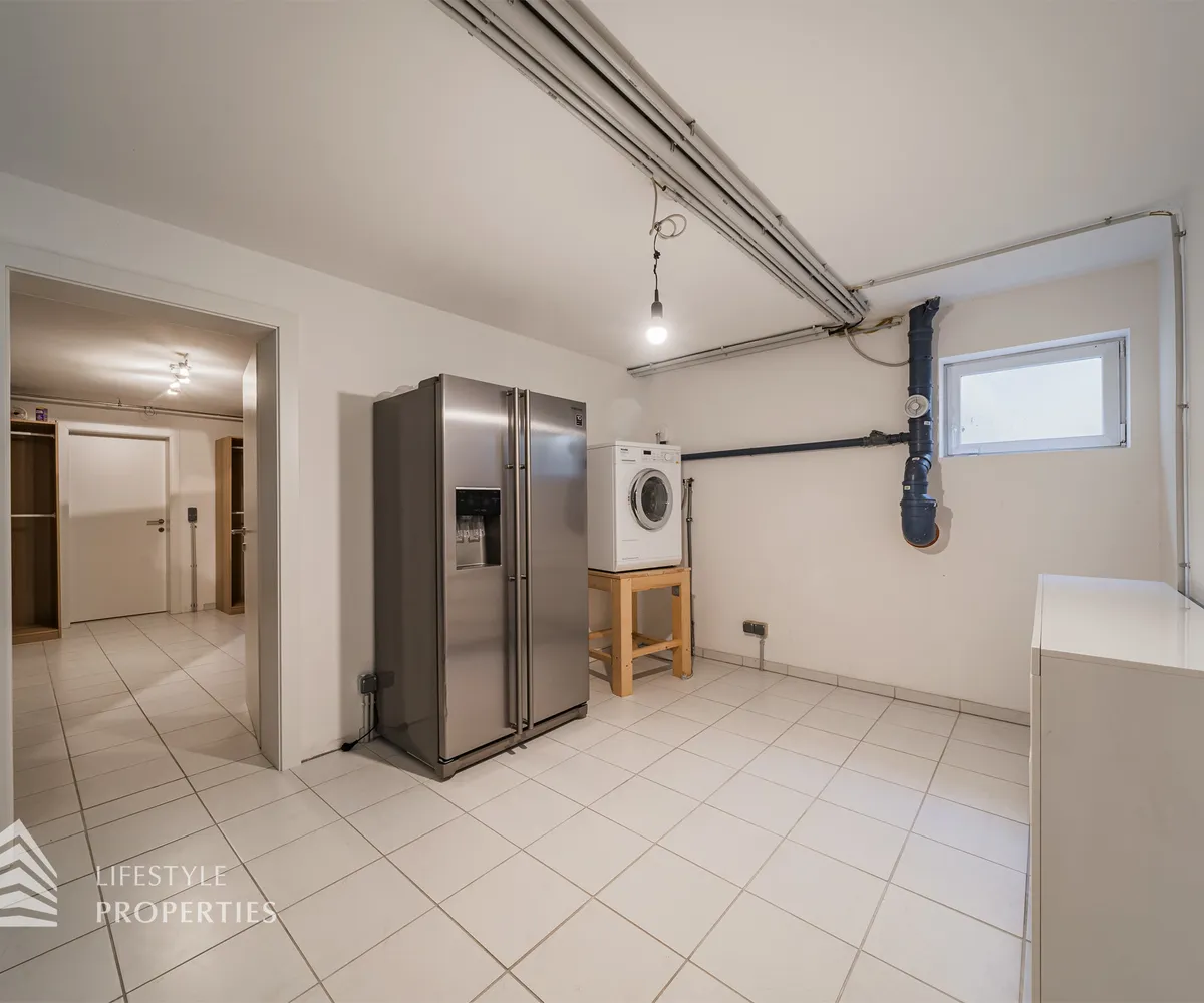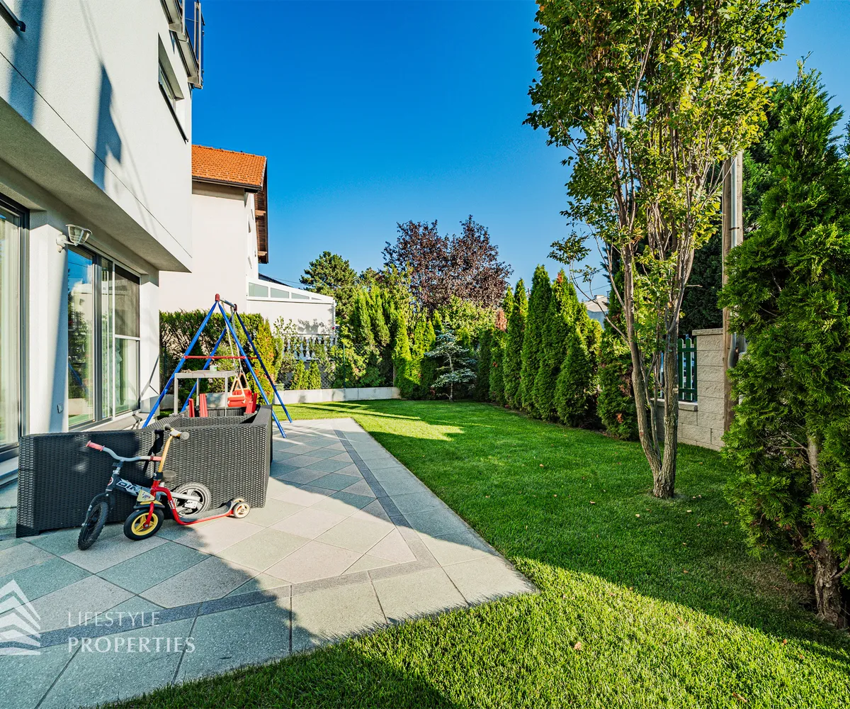 Über die Treppe hinauf gelangen Sie nun ins Dachgeschoss, wo sich auch das wunderschöne, ca. 28,78 m² große Schlafzimmer befindet. Wenn Sie das Zimmer betreten, werden Sie vom Charme dieses Zimmers begeistert sein. Der Raum hat einen direkten Zugang auf die ca. 23,58 m² große Terrasse. Die traumhafte Terrasse ist mit wunderschönen Terrassendielen verlegt worden und bietet viel Platz für eine gemütliche Sitzgelegenheit. Hier können Sie die frische Luft genießen und vom Alltag abschalten. Das Schlafzimmer verfügt über ein Doppelbett, einem eleganten Couchsessel und diverse andere Möbel. Der Raum ist angenehm lichtdurchflutet und bietet einen traumhaften Ausblick. Das Schlafzimmer besitzt außerdem auch über ein eigenes, wunderschönes Badezimmer. Dieses ist mit wunderschönen, dunklen Marmorfliesen ausgekleidet und besitzt eine Toilette, eine große Dusche, und ein stilvolles Waschbecken. Außerdem befindet sich im Dachgeschoss eine weitere Terrasse mit ca. 8,06 m². Im Keller angelangt, treffen Sie auf eine große Waschküche. Hier haben Sie genügend Platz, um diverse Dinge verstauen zu können. Die Lage und die Infrastruktur dieses Hauses könnten nicht besser sein! Die Alte Donau befindet sich nur wenige Minuten von Ihnen entfernt. Dort befinden sich wunderschöne Badestrände und Freibäder. Auch die sportlichen Aktivitäten kommen nicht zu kurz: Stand Up Paddling, Boot fahren, Surfen, Segeln usw. Auch die Anbindung an den öffentlichen Verkehr ist hervorragend. Die Bushaltestelle „Friedstraße“ (20 A), die U-Bahn-Station „Neue Donau“ (U6) und sämtliche Straßenbahnlinien befinden sich in unmittelbarer Nähe. Auch Volksschulen, Mittelschulen und Gymnasien sind in der Nähe auffindbar.