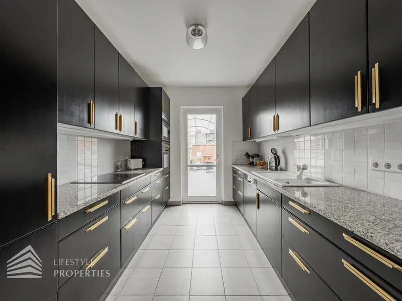 Die zweite, ca. 65,3 m² große Wohnung erstreckt sich über den hinteren, sehr ruhigen Hausteil des 1. Obergeschosses. Hier treffen Sie auf einen Vorraum, einen geräumigen Wohnraum mit Küche, ein Schlafzimmer, ein Badezimmer und eine Gästetoilette. Der ca. 8 m² große Vorraum, welcher mit schönen Fliesen ausgekleidet ist, führt Sie in den ca. 37, 6 m² großen, lichtdurchfluteten Wohnraum mit Küche. Dieser verfügt über einen Zugang zur schönen Dachterrasse. Das Schlafzimmer mit Blick auf die Terrasse befindet sich nebenan und erstreckt sich über eine Fläche von ca. 11,5 m². Das Badezimmer ist mit einer geräumigen Dusche sowie einer Toilette ausgestattet. Die Wohnung verfügt zusätzlich über eine Gästetoilette.