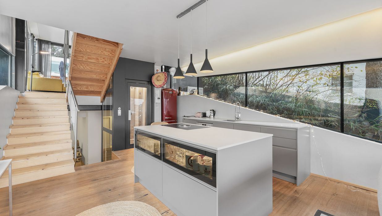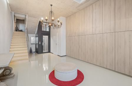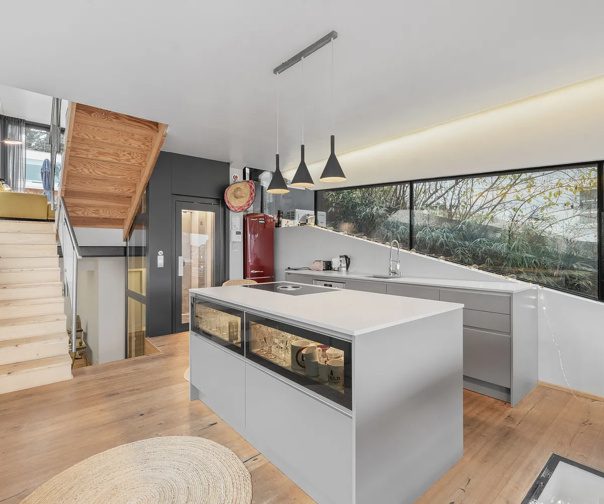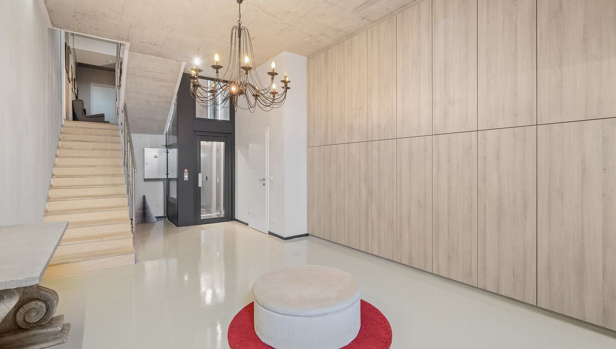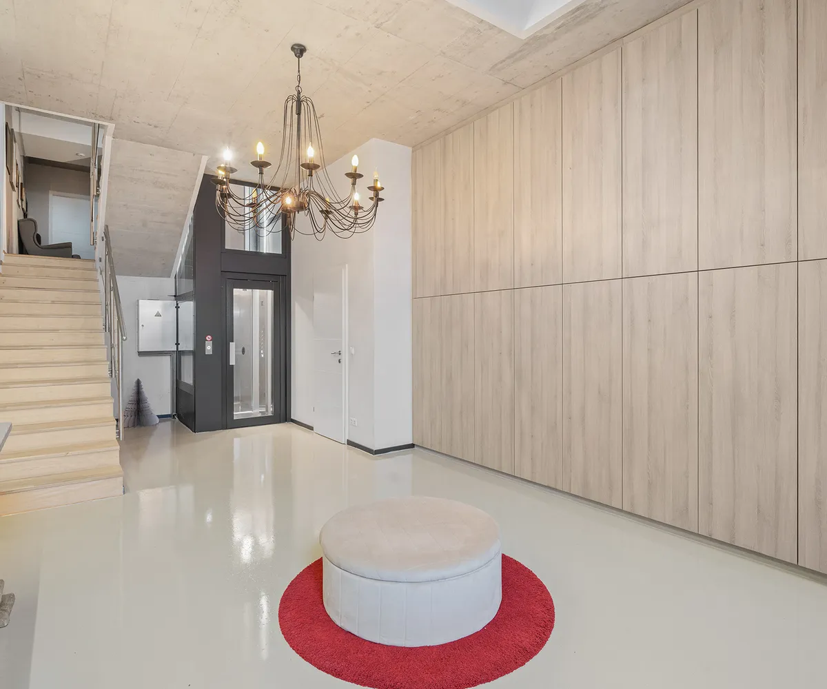 Ein Personenaufzug sorgt für besonderen Komfort und verbindet das Erdgeschoss mit den zentralen Wohnebenen – der Küche , dem Wohnbereich mit Kamin sowie zwei der drei Schlafzimmer/Büro . Damit ist ein bequemer Zugang zu den wichtigsten Wohnbereichen gewährleistet.