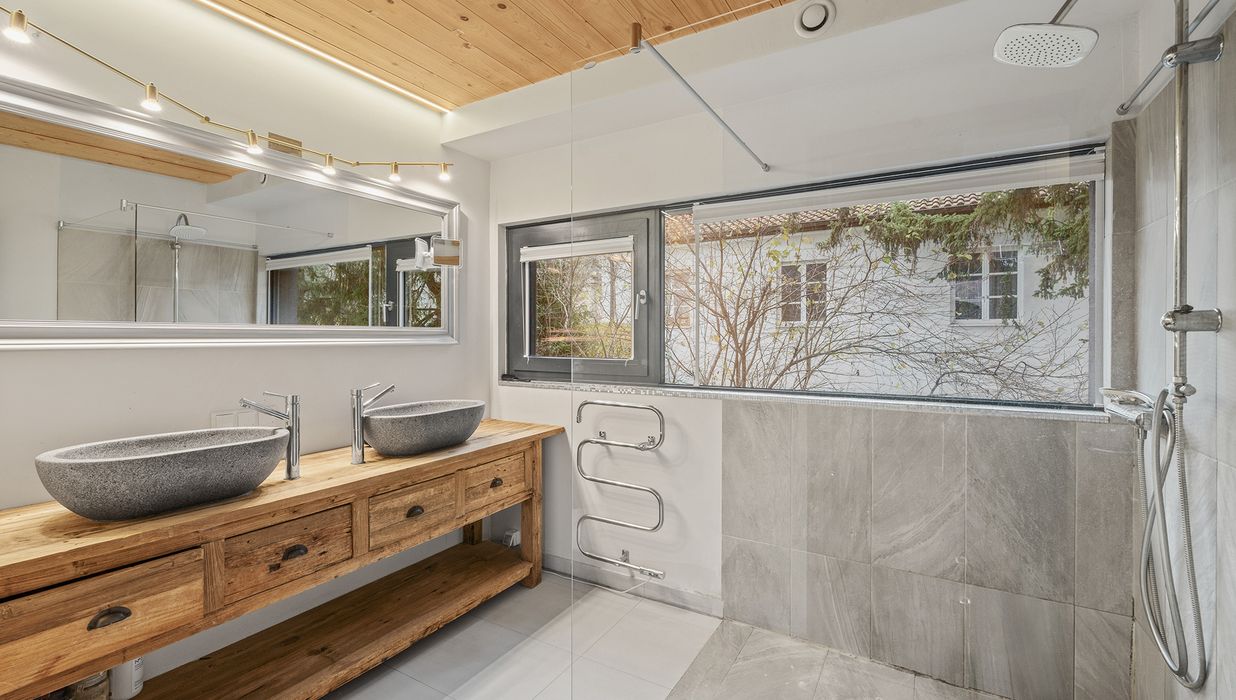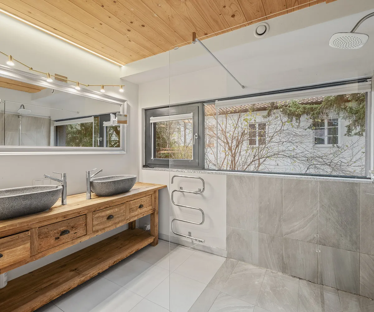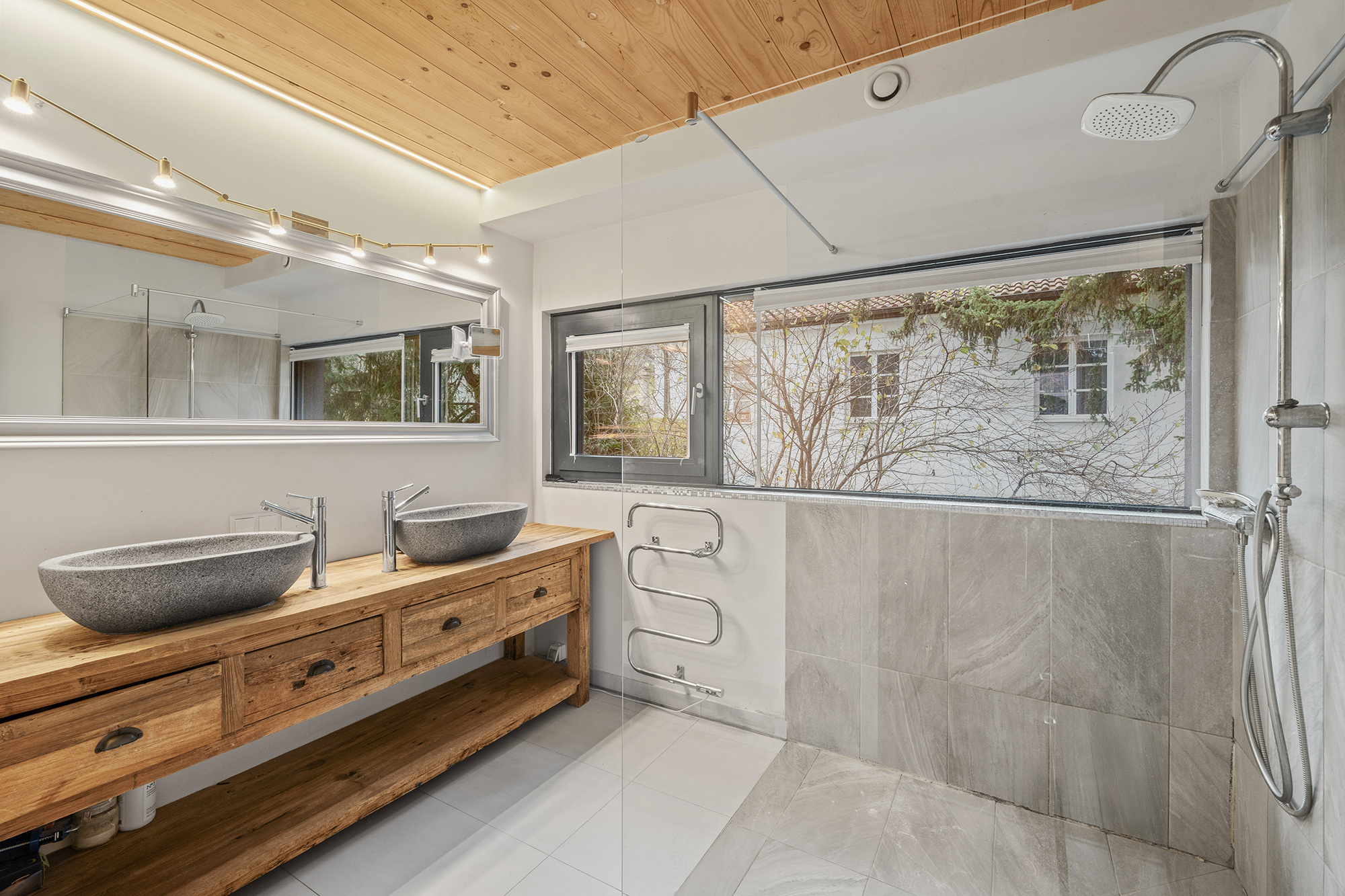 Hier befindet sich ein modernes Badezimmer mit ebenerdiger Dusche und Doppelwaschbecken , das höchsten Komfort bietet. Eine separate Toilette ergänzt diesen Bereich.