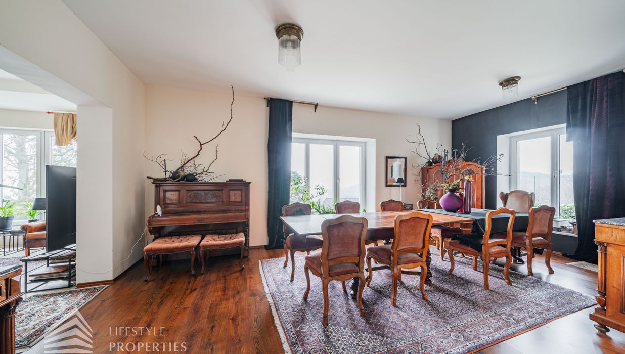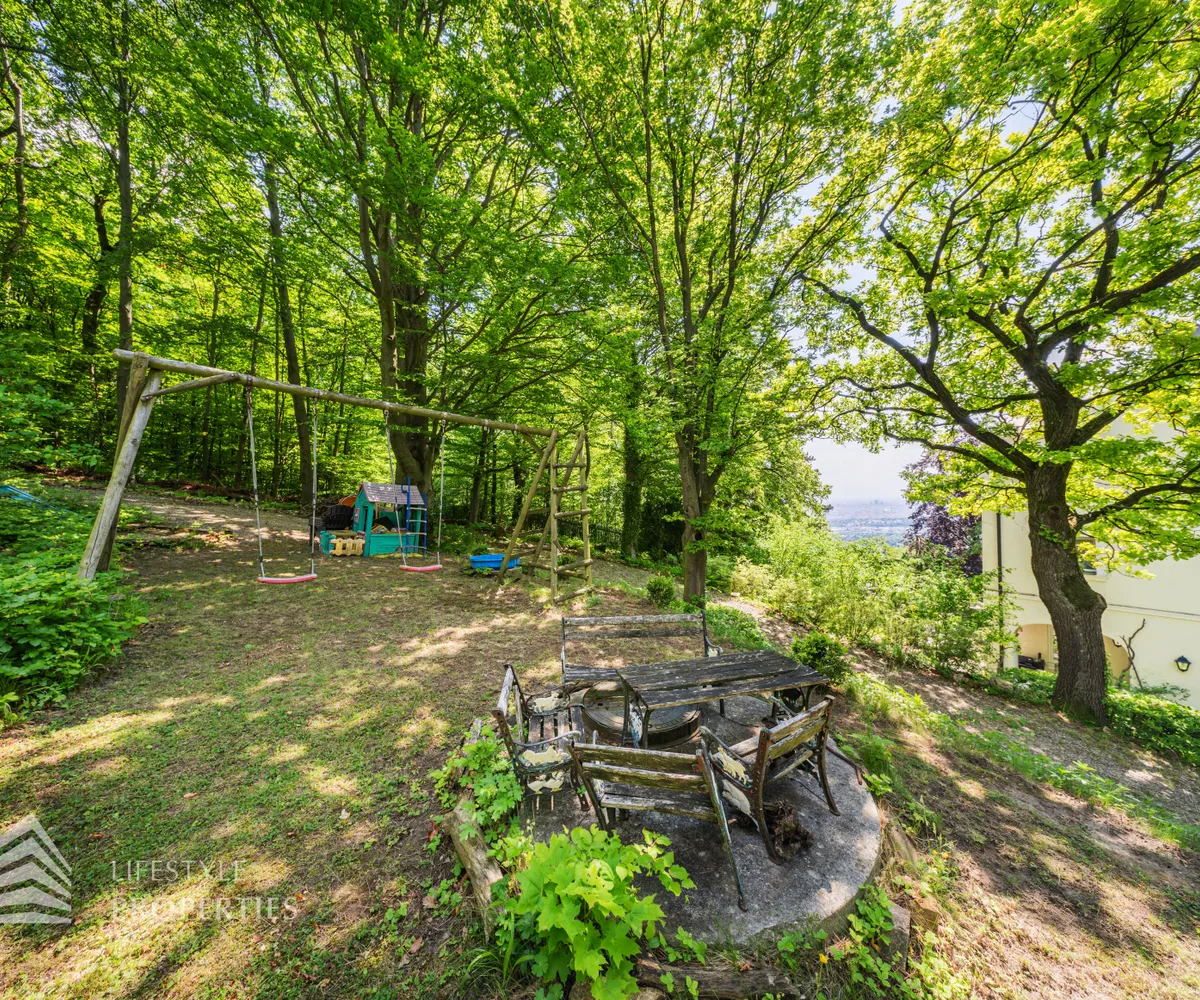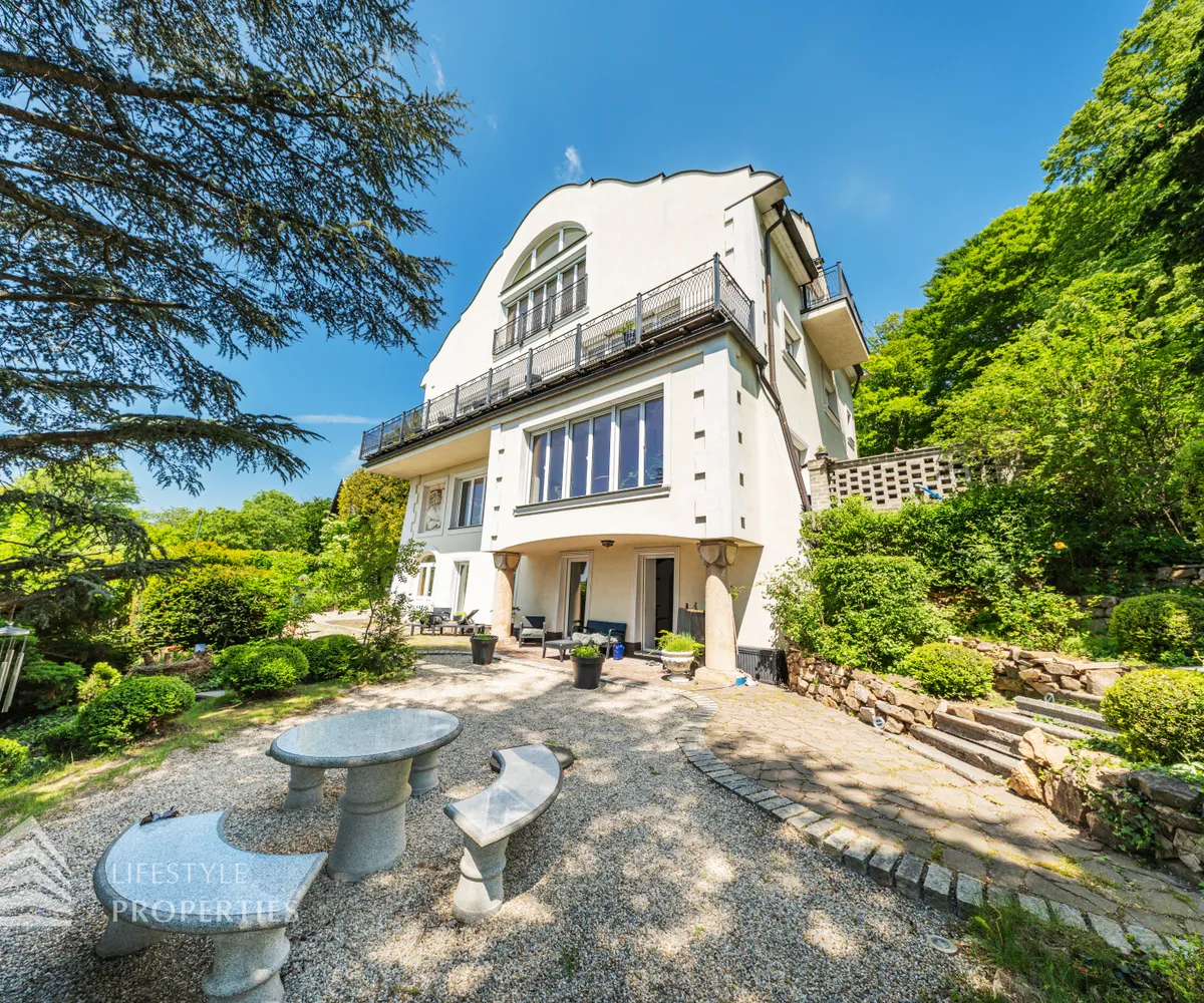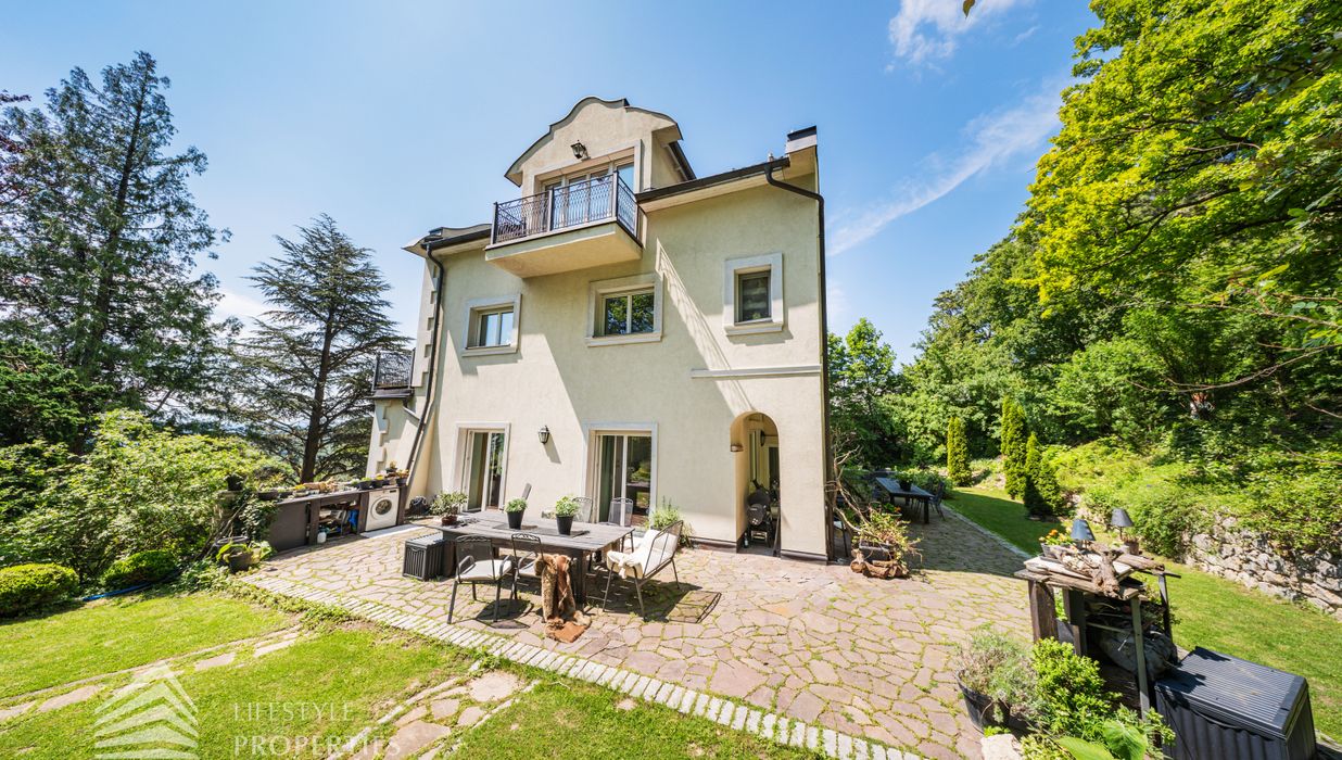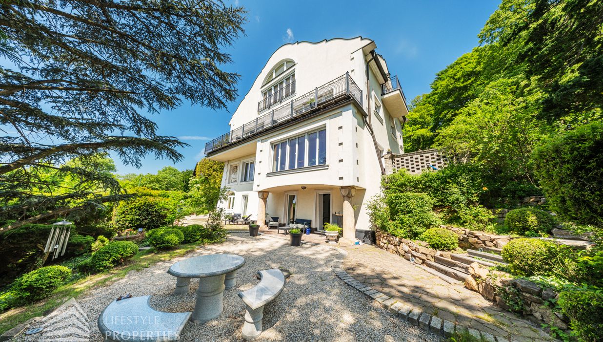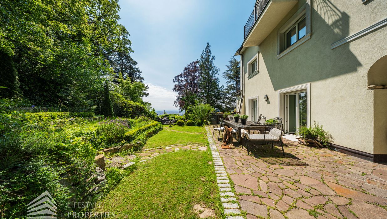 Das traumhafte Anwesen wurde im Jahr 1877 auf einem Grundstück mit einer unglaublichen Fläche von ca. 2.870 m² erbaut und befindet sich in absoluter Toplage von Döbling. Die Immobilie bietet eine Wohnfläche von ca. 327 m² und wurde im Jahr 2010 generalsaniert. Sie erstreckt sich über einen bewohnbaren, ebenerdigen Keller, ein Erdgeschoss, ein Obergeschoss und ein Dachgeschoss und teilt sich auf in acht Zimmer, vier Bäder, einen Fitnessraum, ein Abstellraum, zwei Schrankräume und ein Gäste-WC. In den Haupträumen treffen Sie auf hochwertigen Parkett sowie Marmor, die Nassräume sind gefliest. Zusätzlich verfügt das Anwesen über eine Garage mit Platz für drei Autos sowie über fünf Außenstellplätze. Die Highlights des Objekts sind zweifelsohne der weitläufige Garten und der atemberaubende Ausblick bis hin zum Schneeberg.
