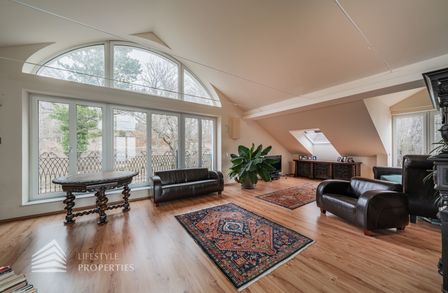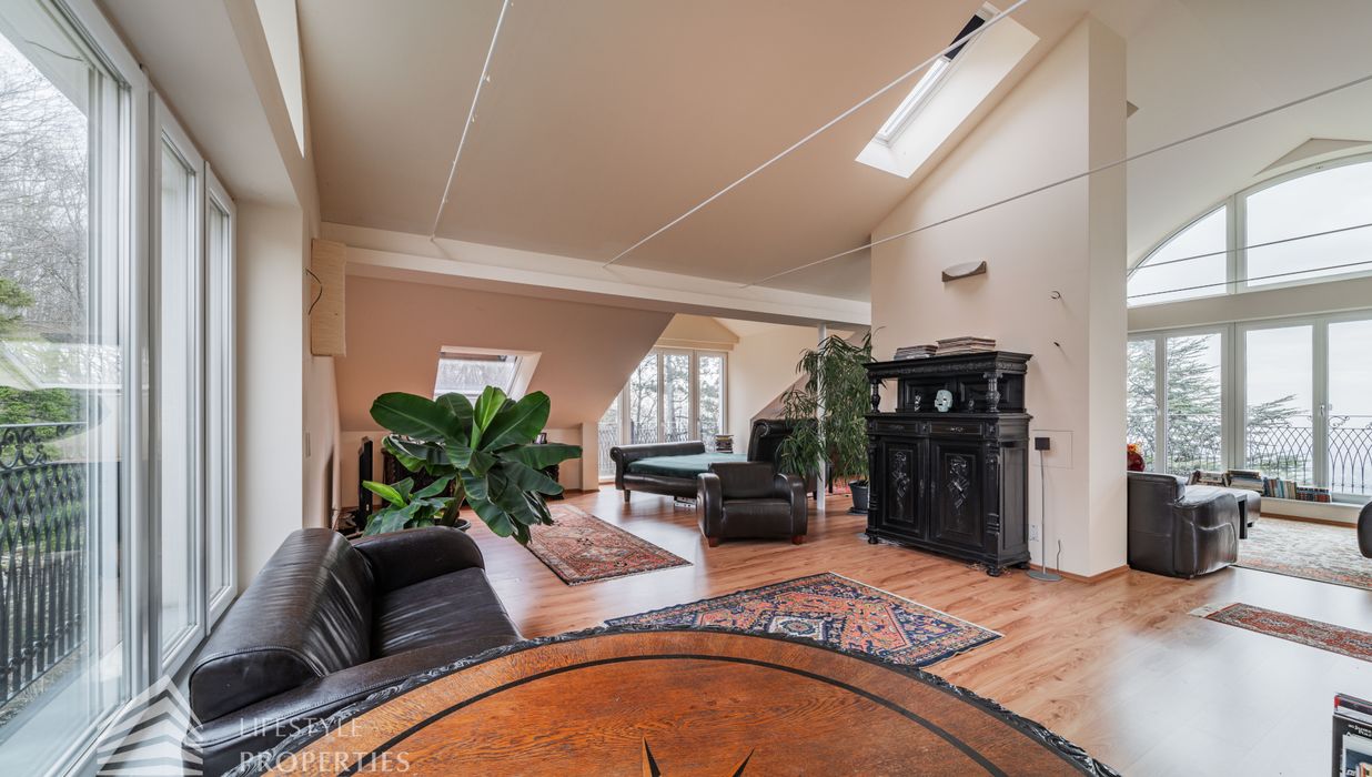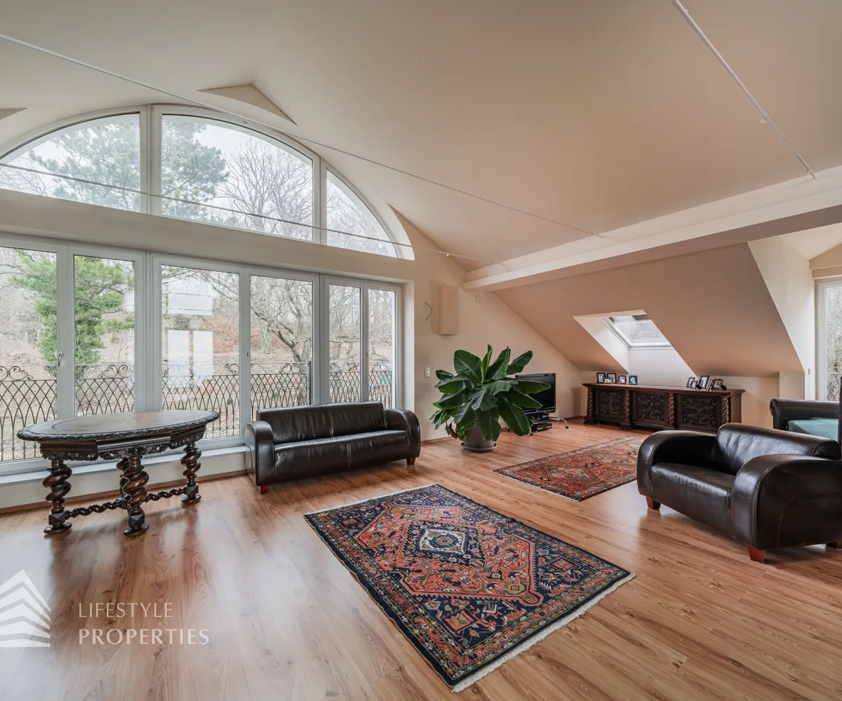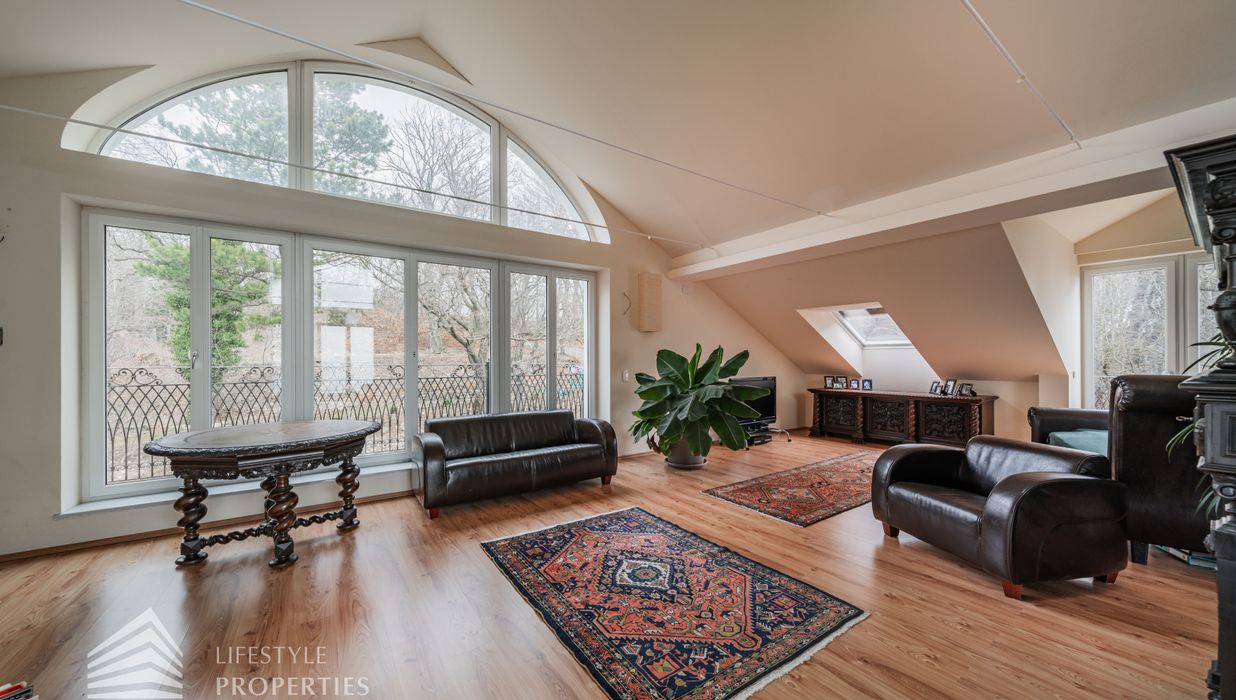 Das loftartige Dachgeschoss erstreckt sich über ca. 111 m², welches unzählige Gestaltungsmöglichkeiten bietet. Eine große Fensterfront bietet Ihnen einen einmaligen Ausblick und lässt den Raum sehr hell und einladend erscheinen. Separat befindet sich ein Badezimmer, welches derzeit über ein Waschbecken und eine Toilette verfügt. Hier gibt es die Möglichkeit, eine Badewanne anzuschließen. Wie in den Plänen ersichtlich, gibt es außerdem, die Möglichkeit einen Personenaufzug einbauen zu lassen. Die Immobilie verfügt über eine Klimaanlage, die Sie im Sommer angenehm kühlt. Beheizt wird die Immobile mittels Fußbodenheizung und Kamin im Erdgeschoss.
