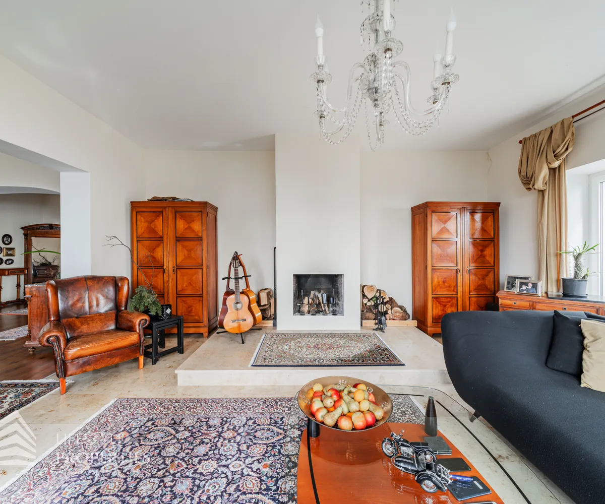 Über eine Treppe gelangen Sie in das Erdgeschoss der Villa. Dort treffen Sie auf ein Wohnzimmer, eine Küche, ein Esszimmer und ein Badezimmer. Die großen Fensterfronten durchfluten das Wohnzimmer mit viel Licht und lassen es sehr hell und einladend erscheinen. Der offene Kamin sorgt zudem für eine besonders gemütliche Atmosphäre. Der Raum bietet Ihnen viel Platz für eine Couchlandschaft sowie weitere Möbel. Das Esszimmer ist direkt mit dem Wohnzimmer verbunden und bietet viel Platz für einen großen Esstisch. Die großzügige Küche ist in schönem Weiß gehalten und mit modernen Geräten ausgestattet. Sie verfügt über viel Stauraum sowie über einen Ausgang auf die Terrasse. Das moderne Bad ist mit einer Dusche sowie einer Toilette ausgestattet.