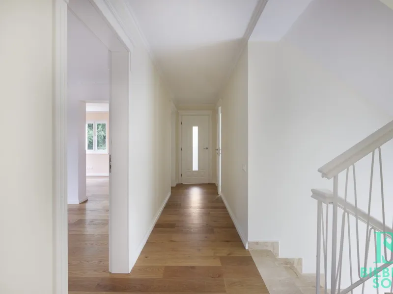 Die offen gehaltene Stiege führt in den 1. Stock, der mit wunderschönen Parkettböden ausgelegt ist und über drei Zimmer, einem Abstellraum und einem luxuriösen Bad mit Wanne, walk-in-Dusche und einem separaten WC ausgestattet ist.