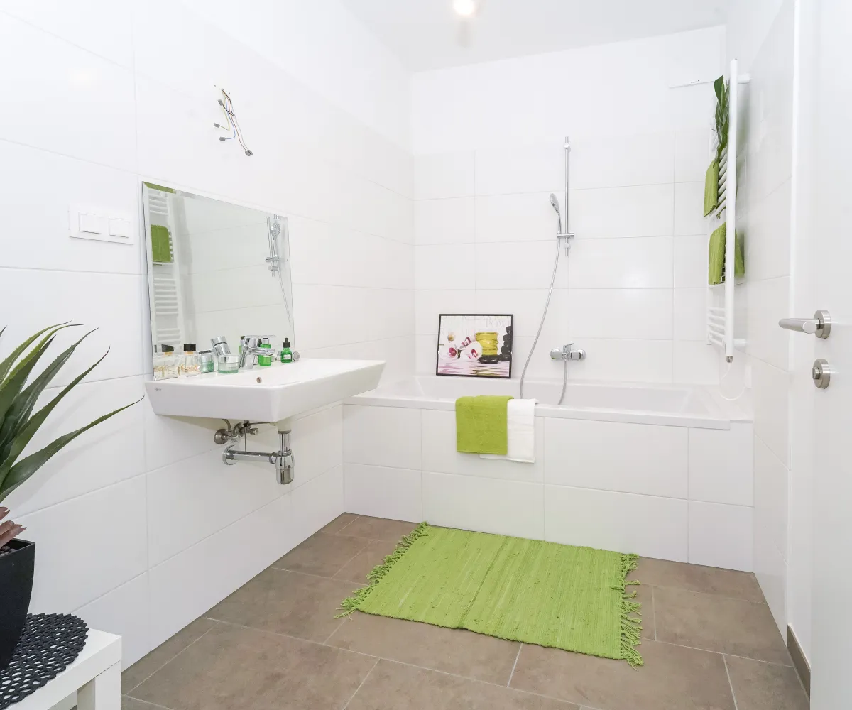 Jede Wohnung besticht durch die Verwendung erstklassiger Materialien: Edle Parkettböden verleihen den Wohnräumen Wärme und Eleganz, während in den stilvoll gestalteten Nassräumen hochwertiges Feinsteinzeug im Format 30 x 60 cm sowie sorgfältig ausgewählte Keramiken und Armaturen zum Einsatz kommen.