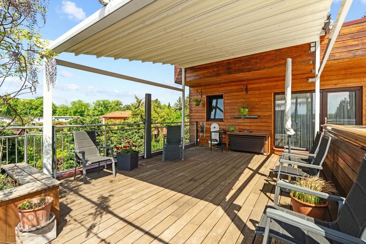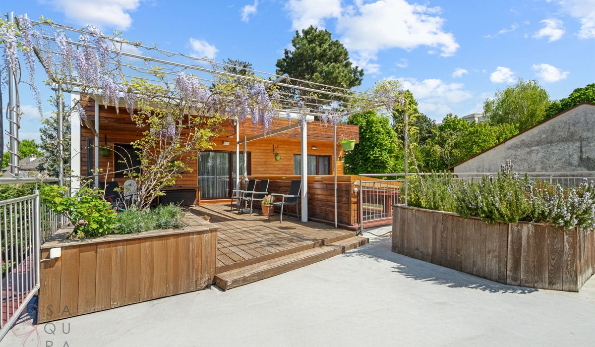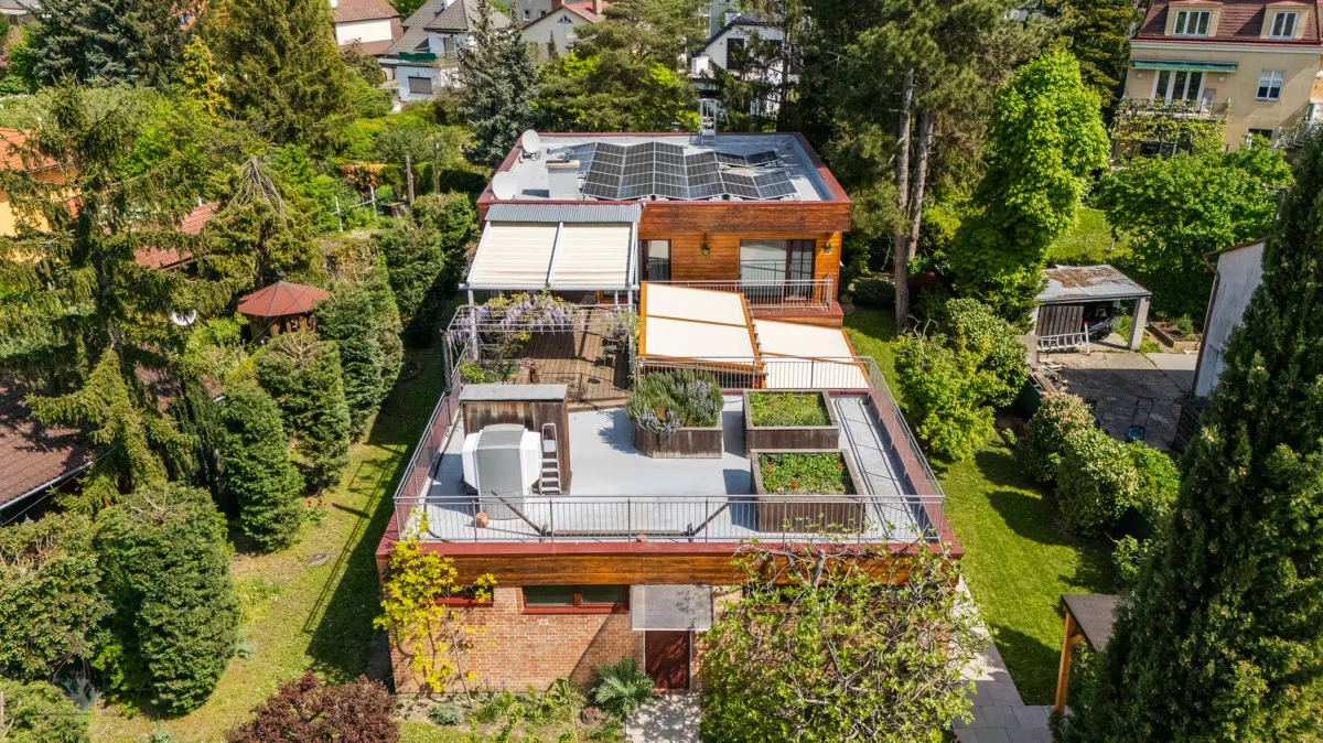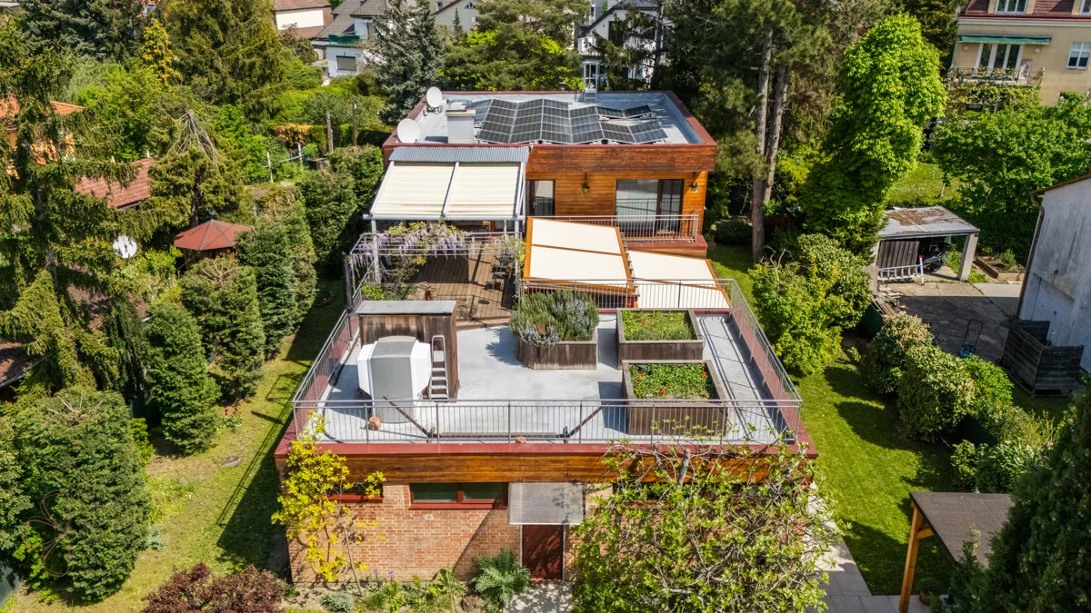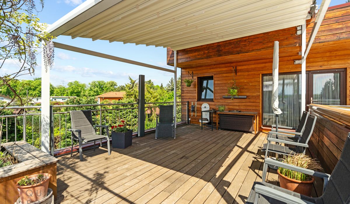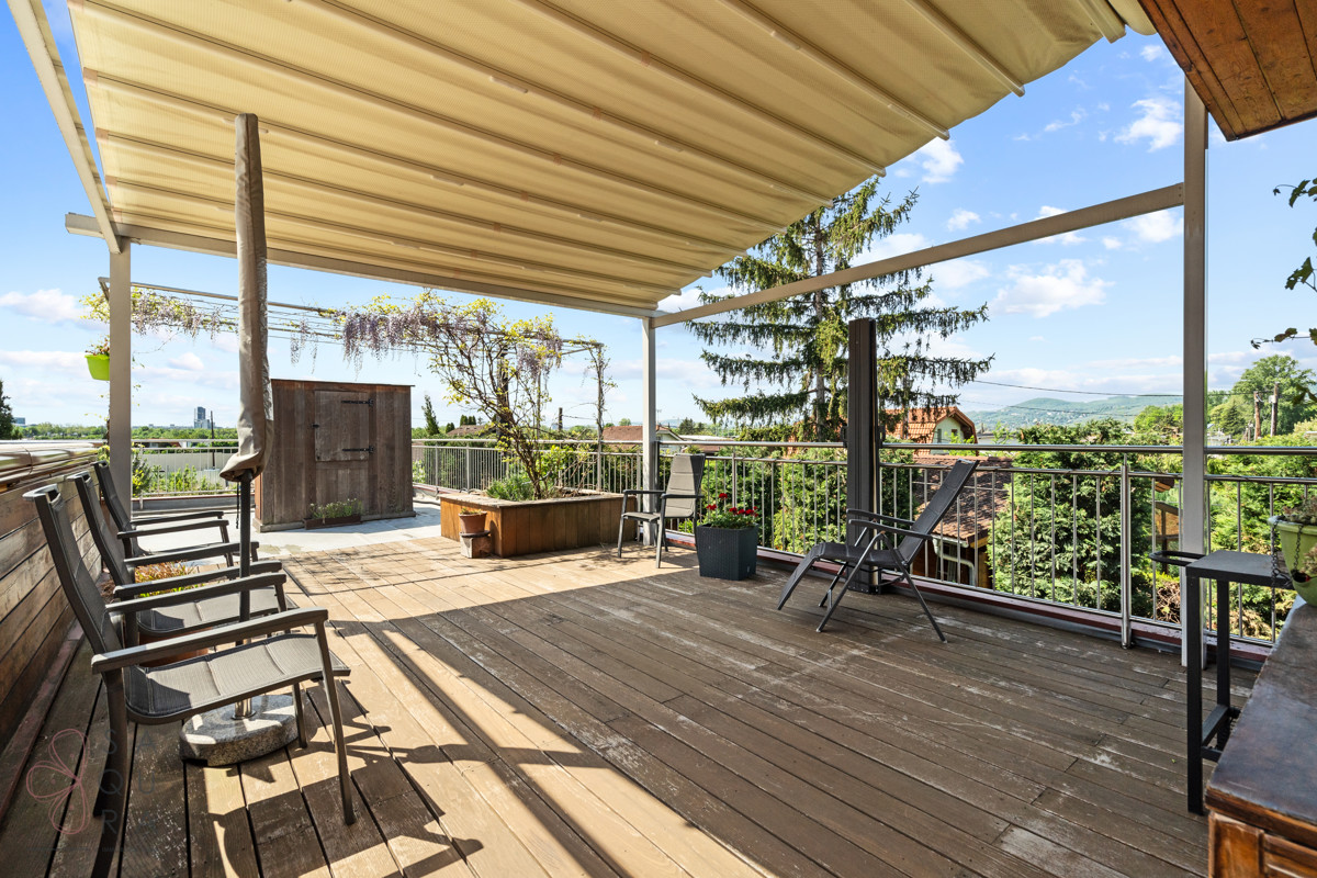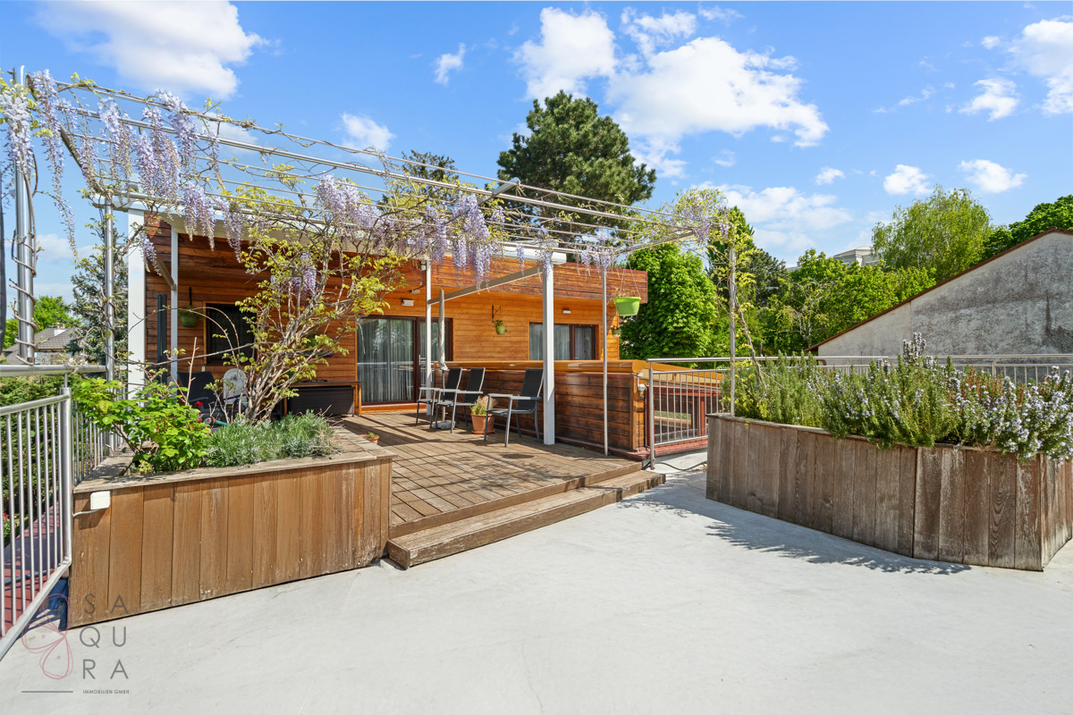 •Dachterrasse mit Blick ins Grüne (Kahlenberg) – mit Pergola & Glyzinen für natürlichen Schatten