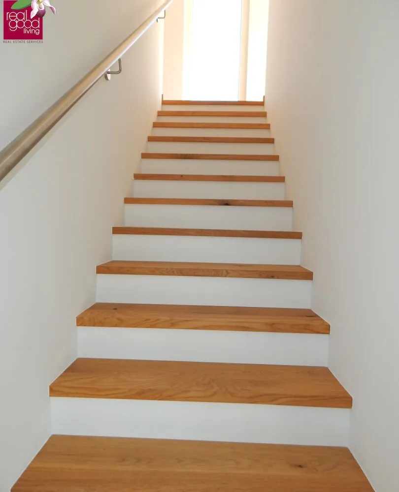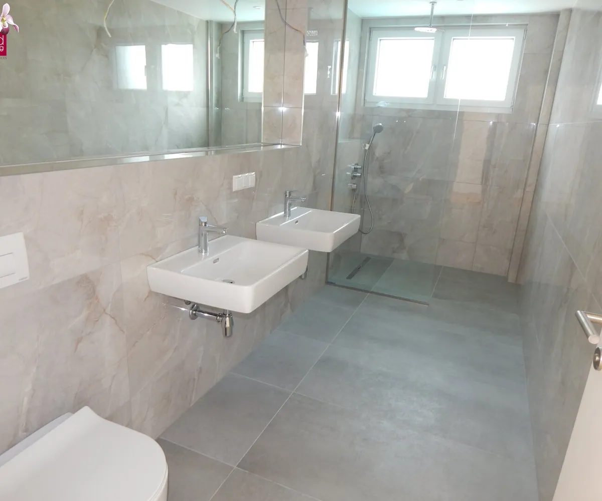 Fliesen in Nassräumen, Echtholzparkett in Wohn- & Schlafbereichen