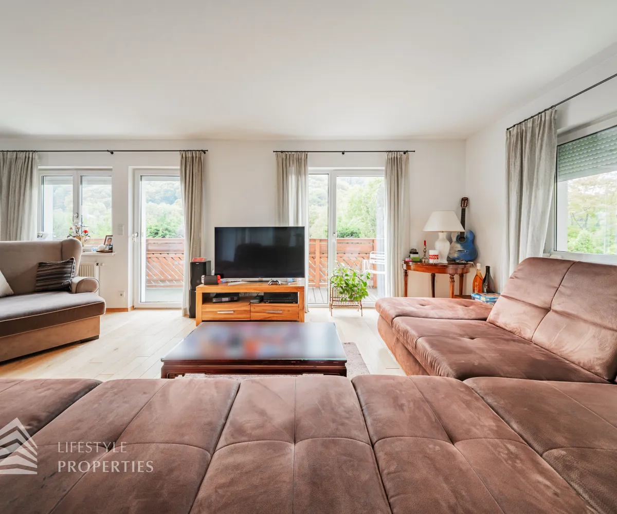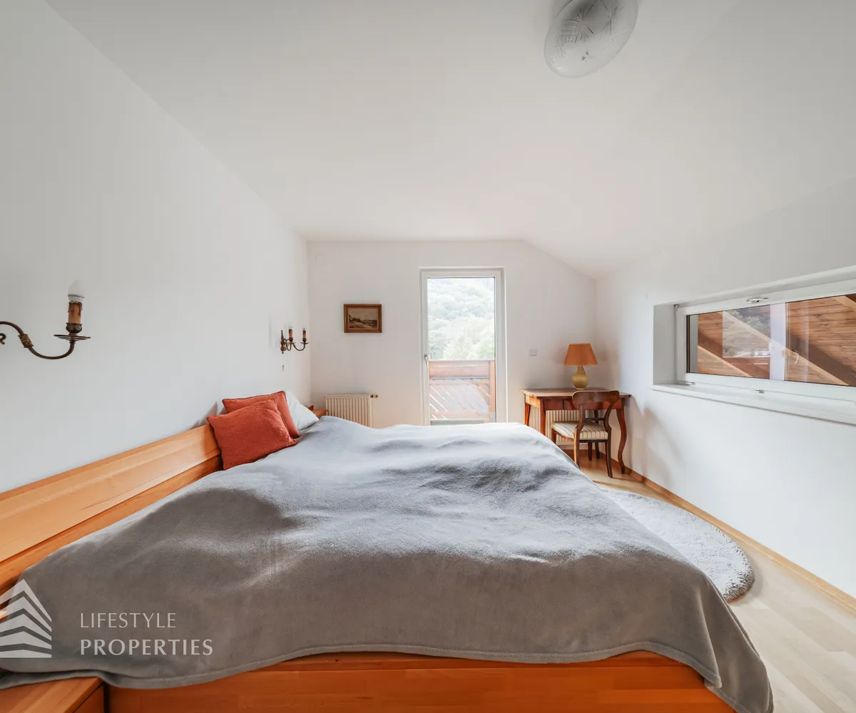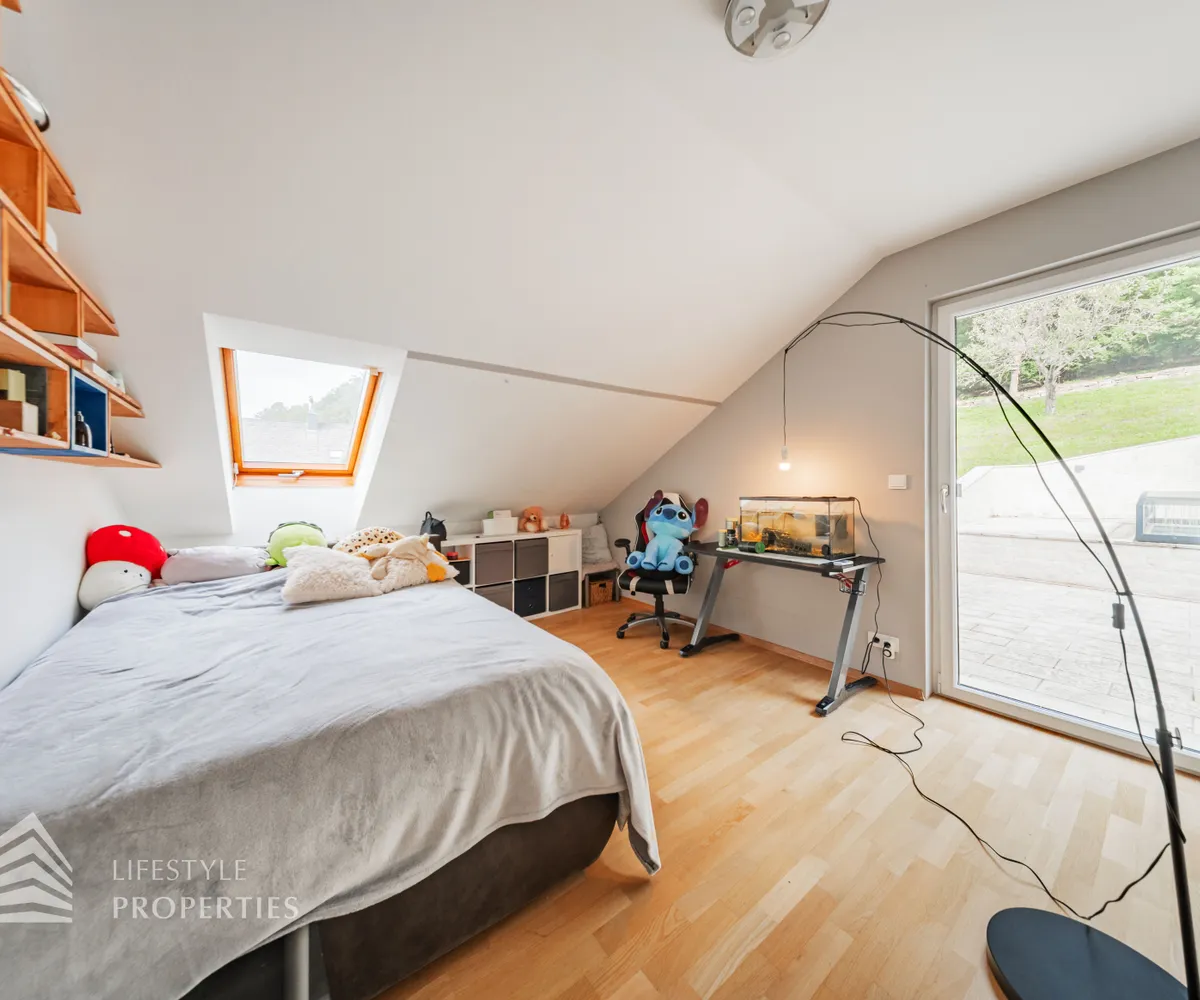 Im Obergeschoss befinden sich drei helle Schlafzimmer, zwei davon mit Zugang zu einer Terrasse, das dritte mit Zugang zum Balkon. Eine der Terrassen bietet einen traumhaften Blick auf den gepflegten Garten und den Waldrand. Ein großflächiges Wohnzimmer, ebenfalls mit Zugang zum Balkon, ist ebenso auf dem Geschoss zu finden. Ein zentrales Badezimmer, ein separates WC mit Fenster und mit Waschmaschinenanschluss , eine kleine Küche und eine Speisekammer bieten zusätzlichen Komfort für Familien oder Gäste.