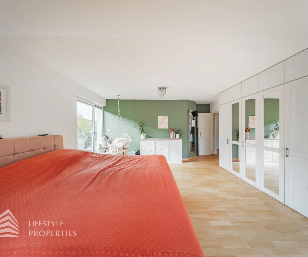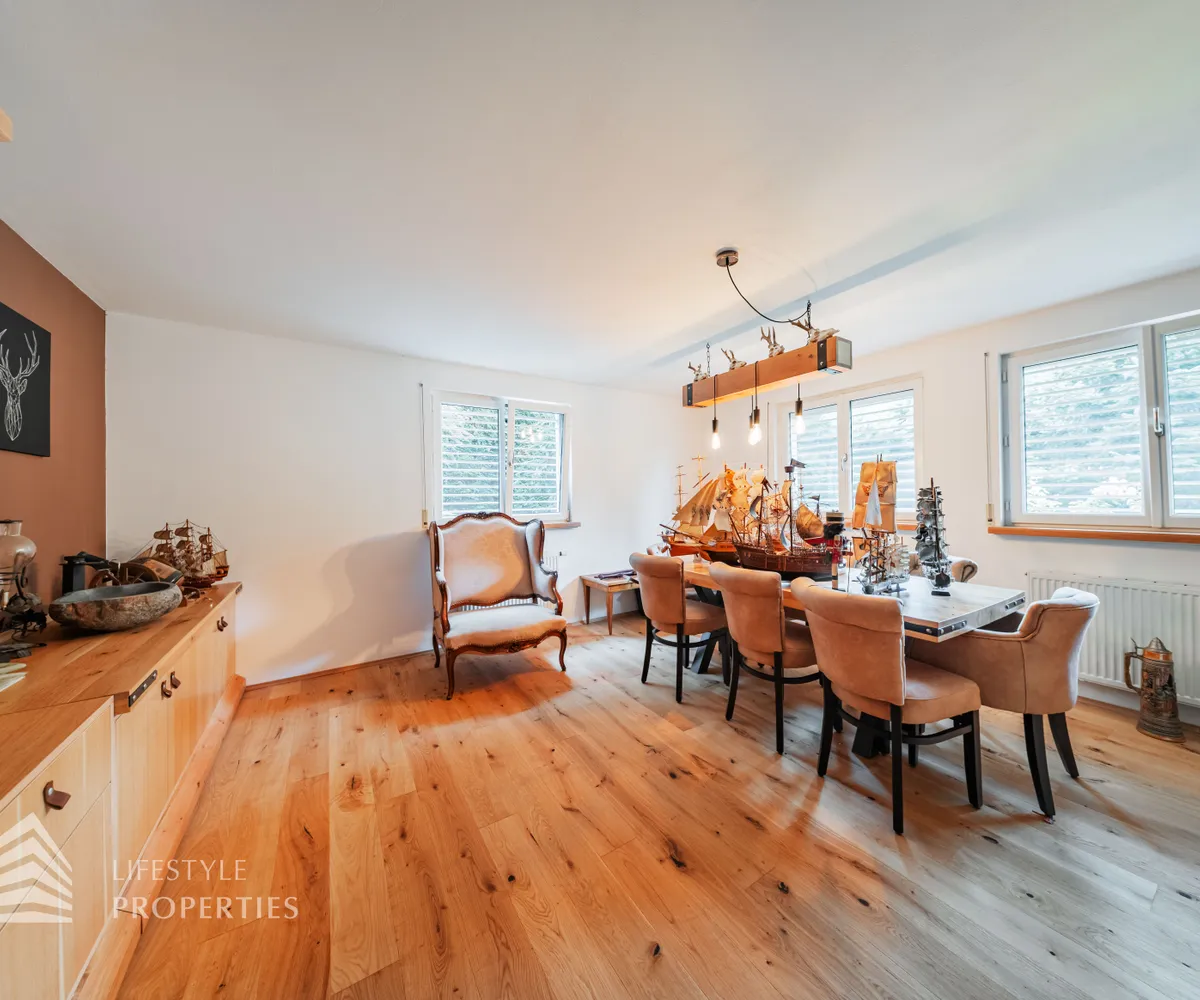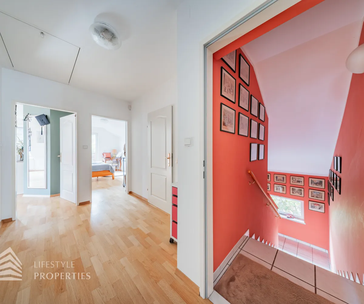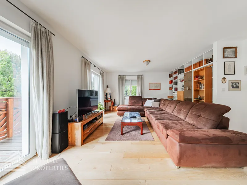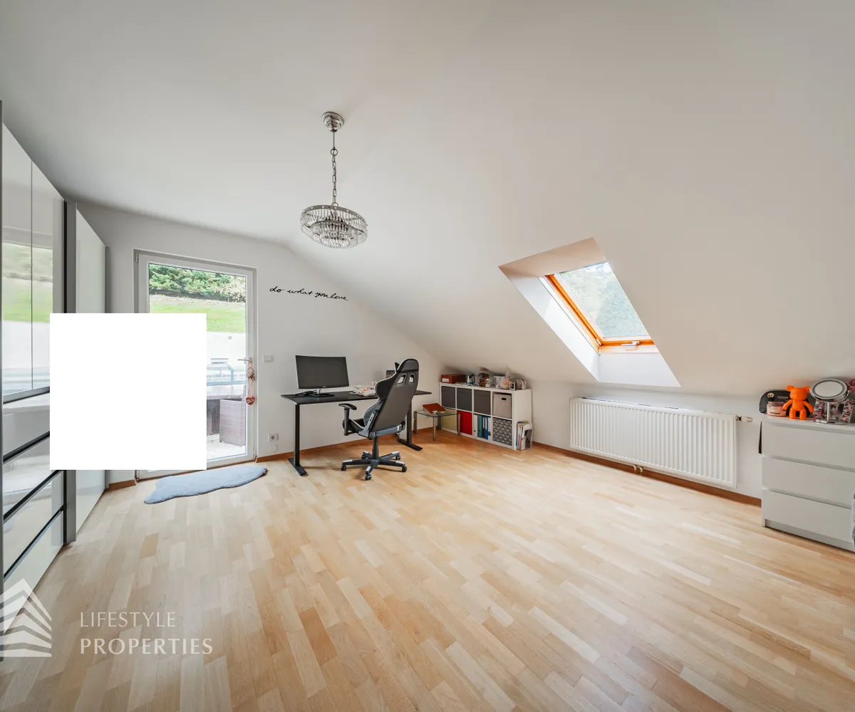 Die Villa mit einer Nutzfläche von ca. 348 m² vereint Luxus, Natur und Flexibilität auf einzigartige Weise. Eingebettet in ein ruhiges Grundstück von über ca. 1.098 m², bietet sie großzügige Räume, maßgefertigte Einbaumöbel, modernste Technik und absolute Privatsphäre, ein Zuhause, das höchsten Wohnkomfort und eleganten Lebensstil harmonisch verbindet. Das Haus unterteilt sich ein Kellergeschoss, ein Erdgeschoss und ein Dachgeschoss und bietet 7 Zimmer, 3 Bäder, 2 Küchen, eine Garage, einen Haustechnikraum, Kellerräume sowie mehrer Abstellräume. Technisch überzeugt die Villa durch eine Gasheizung kombiniert mit Fußbodenheizung und Radiatoren, einen 200-Liter-Warmwasserspeicher, hochwertige Internorm-Fenster, ergänzt durch Velux-Dachfenster, elektrische Außenrollläden an den Terrassentüren und manuelle Rollos an den übrigen Fenstern. Eine Alarmanlage schützt das gesamte Haus. Maßgefertigte Einbaumöbel nach Wunsch sind im Kaufpreis enthalten; ein Teil des weiteren hochwertigen Inventars kann ebenfalls übernommen werden. Die hochwertigen Böden aus Parkett, Fliesen und Naturstein verleihen dem Haus zeitlose Eleganz.