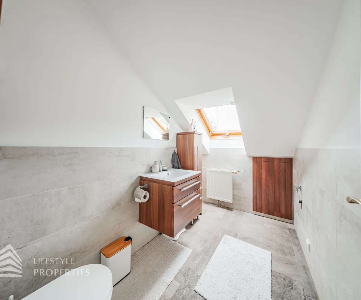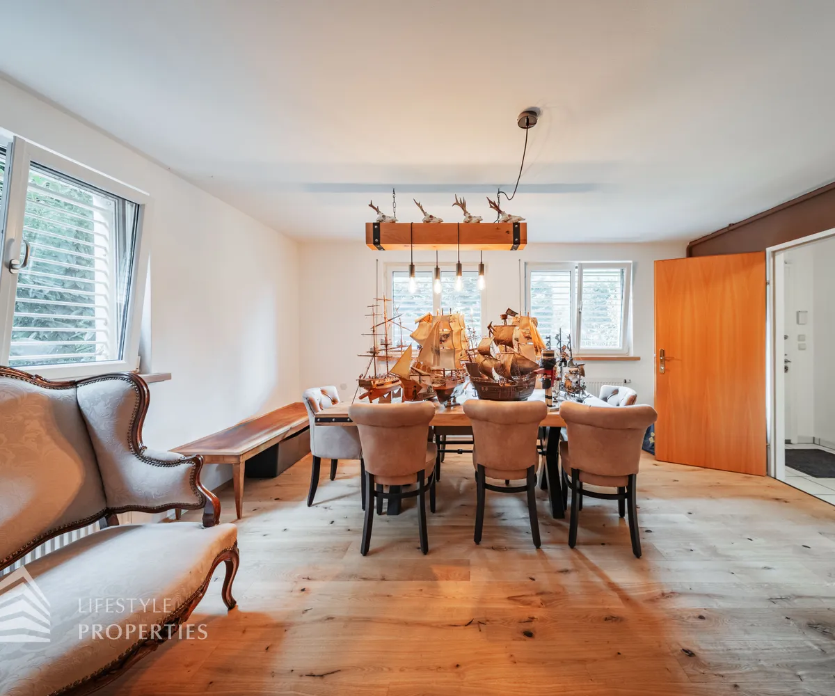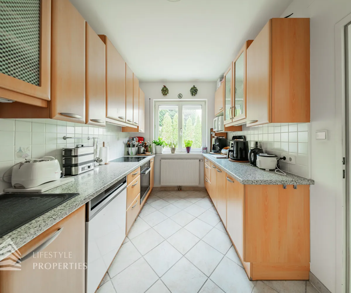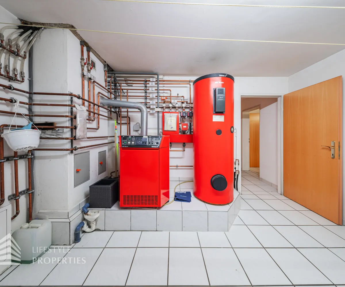 Die Villa mit einer Nutzfläche von ca. 348 m² vereint Luxus, Natur und Flexibilität auf einzigartige Weise. Eingebettet in ein ruhiges Grundstück von über ca. 1.098 m², bietet sie großzügige Räume, maßgefertigte Einbaumöbel, modernste Technik und absolute Privatsphäre, ein Zuhause, das höchsten Wohnkomfort und eleganten Lebensstil harmonisch verbindet. Das Haus unterteilt sich ein Kellergeschoss, ein Erdgeschoss und ein Dachgeschoss und bietet 7 Zimmer, 3 Bäder, 2 Küchen, eine Garage, einen Haustechnikraum, Kellerräume sowie mehrer Abstellräume. Technisch überzeugt die Villa durch eine Gasheizung kombiniert mit Fußbodenheizung und Radiatoren, einen 200-Liter-Warmwasserspeicher, hochwertige Internorm-Fenster, ergänzt durch Velux-Dachfenster, elektrische Außenrollläden an den Terrassentüren und manuelle Rollos an den übrigen Fenstern. Eine Alarmanlage schützt das gesamte Haus. Maßgefertigte Einbaumöbel nach Wunsch sind im Kaufpreis enthalten; ein Teil des weiteren hochwertigen Inventars kann ebenfalls übernommen werden. Die hochwertigen Böden aus Parkett, Fliesen und Naturstein verleihen dem Haus zeitlose Eleganz.