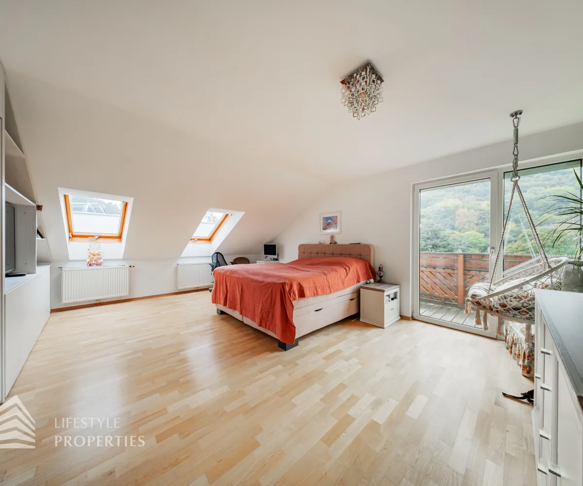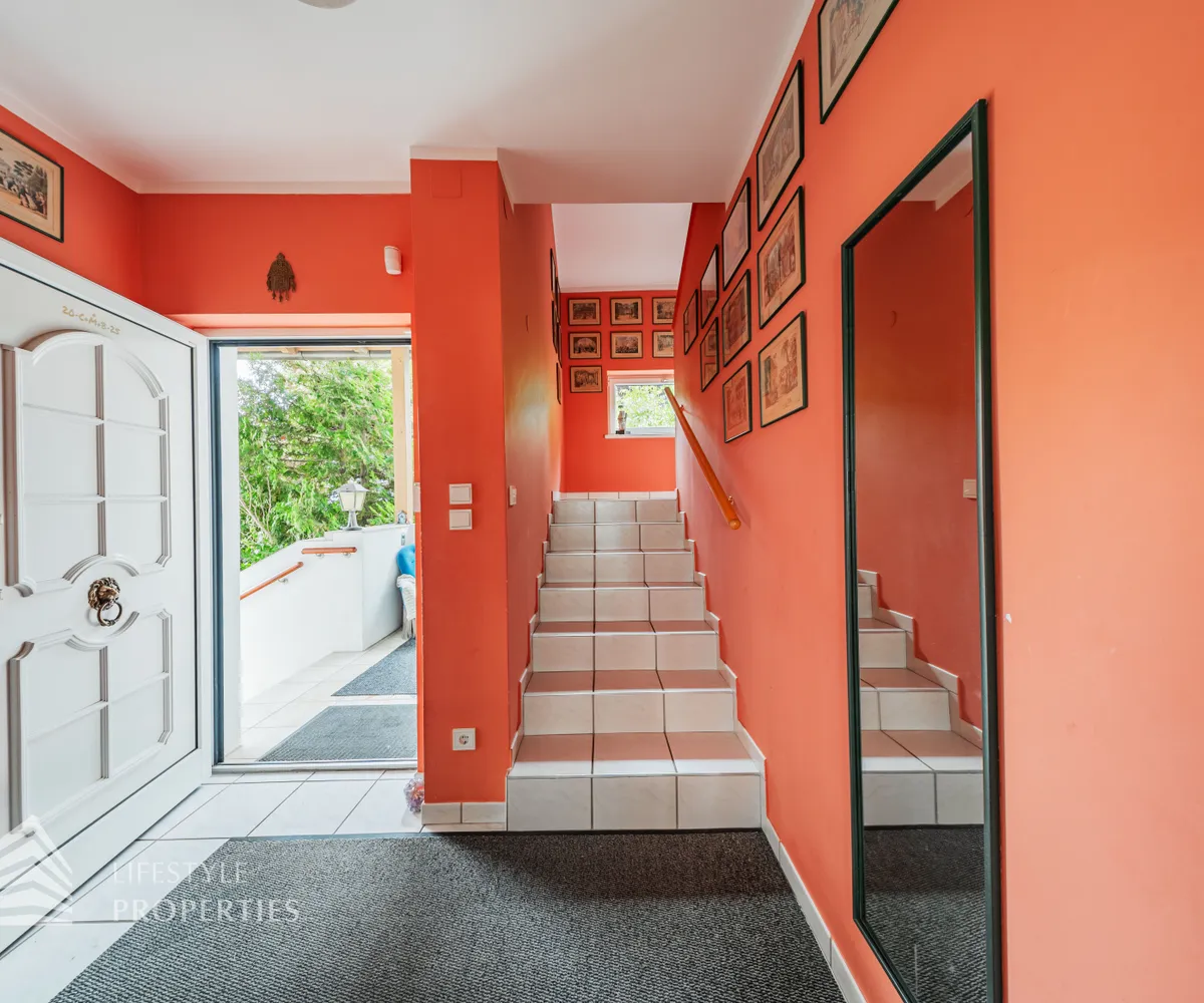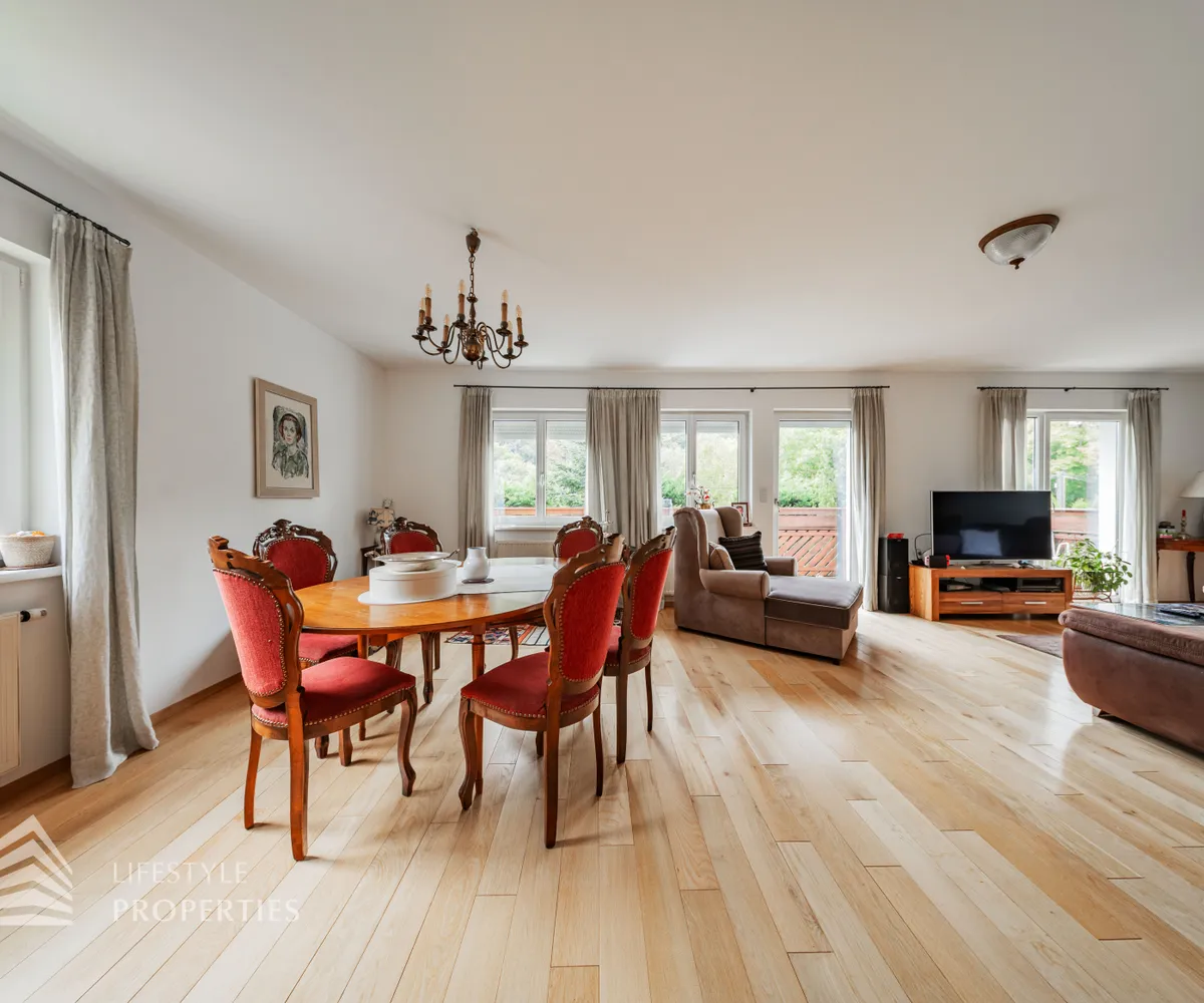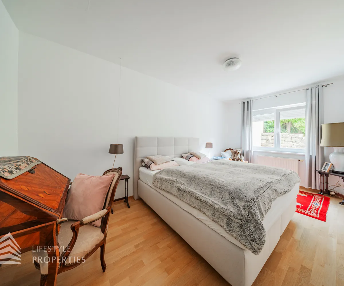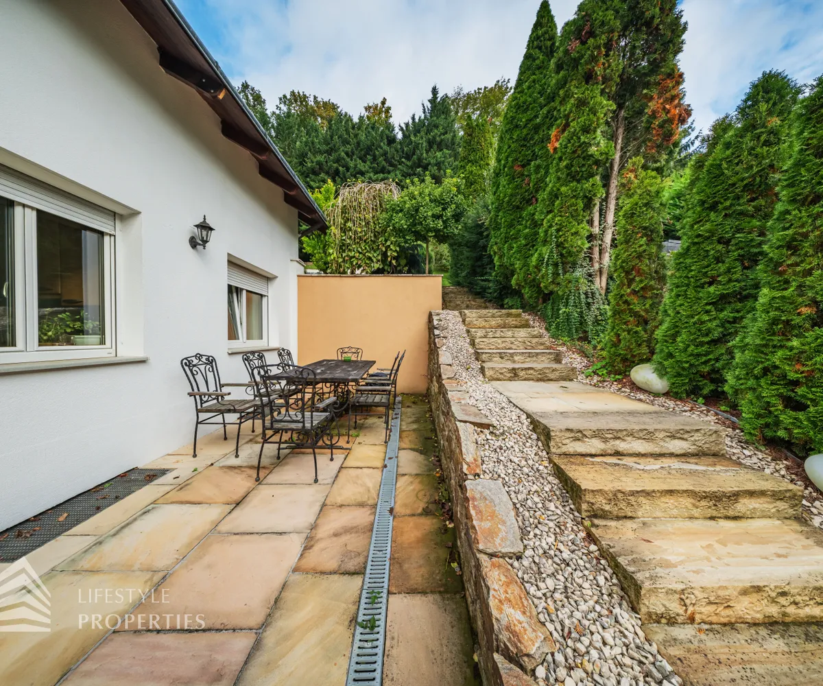 Die Villa mit einer Nutzfläche von ca. 348 m² vereint Luxus, Natur und Flexibilität auf einzigartige Weise. Eingebettet in ein ruhiges Grundstück von über ca. 1.098 m², bietet sie großzügige Räume, maßgefertigte Einbaumöbel, modernste Technik und absolute Privatsphäre, ein Zuhause, das höchsten Wohnkomfort und eleganten Lebensstil harmonisch verbindet. Das Haus unterteilt sich ein Kellergeschoss, ein Erdgeschoss und ein Dachgeschoss und bietet 7 Zimmer, 3 Bäder, 2 Küchen, eine Garage, einen Haustechnikraum, Kellerräume sowie mehrer Abstellräume. Technisch überzeugt die Villa durch eine Gasheizung kombiniert mit Fußbodenheizung und Radiatoren, einen 200-Liter-Warmwasserspeicher, hochwertige Internorm-Fenster, ergänzt durch Velux-Dachfenster, elektrische Außenrollläden an den Terrassentüren und manuelle Rollos an den übrigen Fenstern. Eine Alarmanlage schützt das gesamte Haus. Maßgefertigte Einbaumöbel nach Wunsch sind im Kaufpreis enthalten; ein Teil des weiteren hochwertigen Inventars kann ebenfalls übernommen werden. Die hochwertigen Böden aus Parkett, Fliesen und Naturstein verleihen dem Haus zeitlose Eleganz.