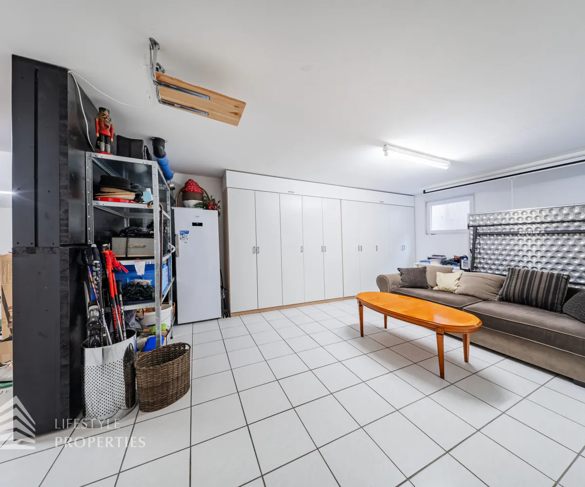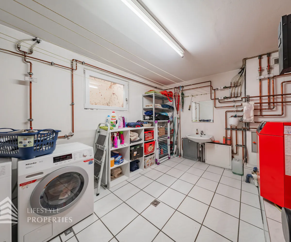 Im Untergeschoss befinden sich eine Garage mit elektrischem Tor und direktem Zugang ins Haus, ein großzügiger Partyraum, ein teilweise abgetrennter Fitnessbereich sowie ein behaglicher Raum mit stilvollem Ambiente – ideal zum Entspannen, für private Momente oder auch als Cigar-Lounge nutzbar. Zusätzlich ist ein vorbereiteter Raum für eine Sauna mit vorhandenem Abgasanschluss vorhanden, ergänzt durch ein Duschbad und ein separates WC. Drei Abstellräume sowie ein Heiz- und Technikraum mit integriertem Waschbereich runden diese Ebene ab. Über eine Sicherheitstür führt der Ausgang direkt auf Straßenniveau in den Eingangsbereich des Grundstücks.