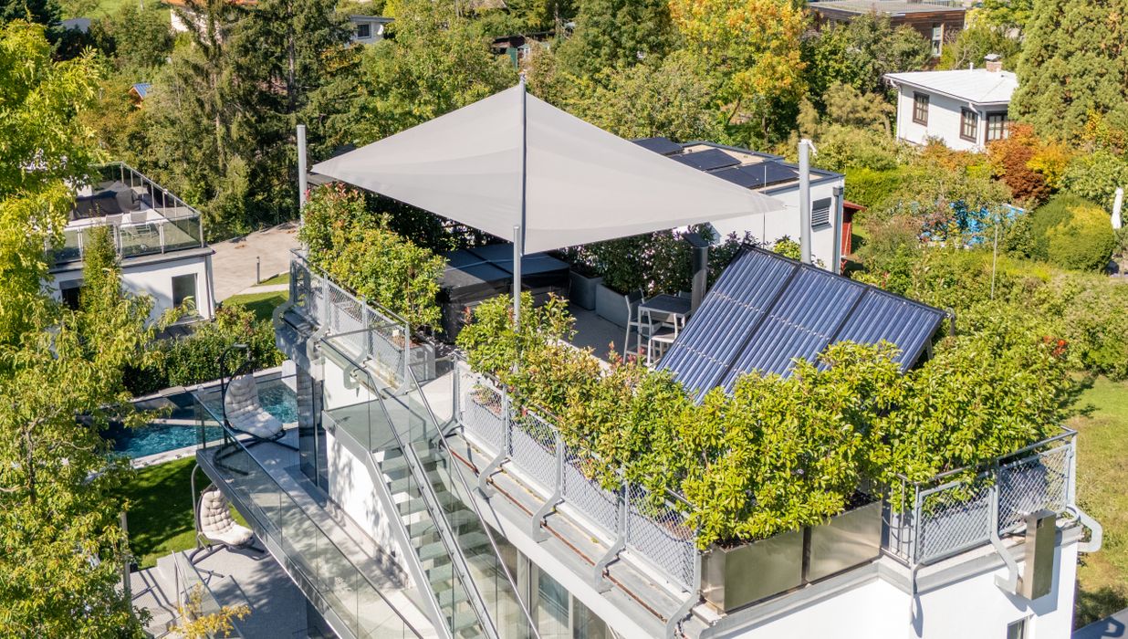 Die Immobilie ist mit einer energiesparenden Wärmepumpe und einer Solaranlage ausgestattet, die ein besonders ressourceneffizientes Wohnen ermöglichen. Pufferspeicher sorgen dafür, dass die Sonnenenergie optimal genutzt wird. Für höchsten Komfort sorgen Fußboden- und Deckenkühlung , die eine gleichmäßige und angenehme Verteilung von Wärme und Kälte in allen Räumen gewährleisten. Bodentiefe, dreifach verglaste Fenster sind mit elektrischen Raffstores ausgestattet und verbinden Ästhetik mit Funktionalität. Die durchdachte Ambientebeleuchtung im Innen- und Außenbereich rundet die exklusive Wohnatmosphäre ab. Der hochmoderne Pool überzeugt durch minimalistisches Design und zehn unterschiedliche Funktionen, während der Whirlpool Platz für vier Personen bietet und höchsten Entspannungswert garantiert. Alle Terrassenflächen sind mit hochwertigen Steinteppich ausgestattet. Das gesamte Haus mit maßgefertigten Tischlerschränken bietet großzügigen Stauraum bei klarer Linienführung.
