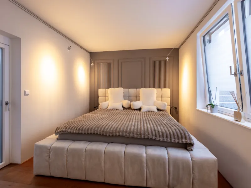 Im Erdgeschoss befindet sich die großzügige, lichtdurchflutete Wohnbereich , ausgestattet mit einer maßgefertigten Tischlerküche und angrenzender Speis. Bodentiefe Glasfronten eröffnen den direkten Zugang zur sonnigen Terrasse und dem eleganten Pool, ein Gäste-WC komplettiert diese Ebene. Im ersten Obergeschoss erwarten Sie zwei Schlafzimmer mit Zugang zu einem Balkon, ein Schrankraum sowie ein Badezimmer mit WC – perfekte Rückzugsbereiche für Ruhe und Komfort. Der vollwertig ausgebaute Wohnkeller bietet ein weiteres Schlafzimmer mit Garderobenraum und Zugang zum Garten, ein Badezimmer mit WC, e inen praktischen Abstellraum sowie einen separaten Raum mit Saunaanschluss. Die uneinsichtige, weitläufige Dachterrasse mit Whirlpool eröffnet einen unvergleichbaren Panoramablick über die Weinberge und die Umgebung.