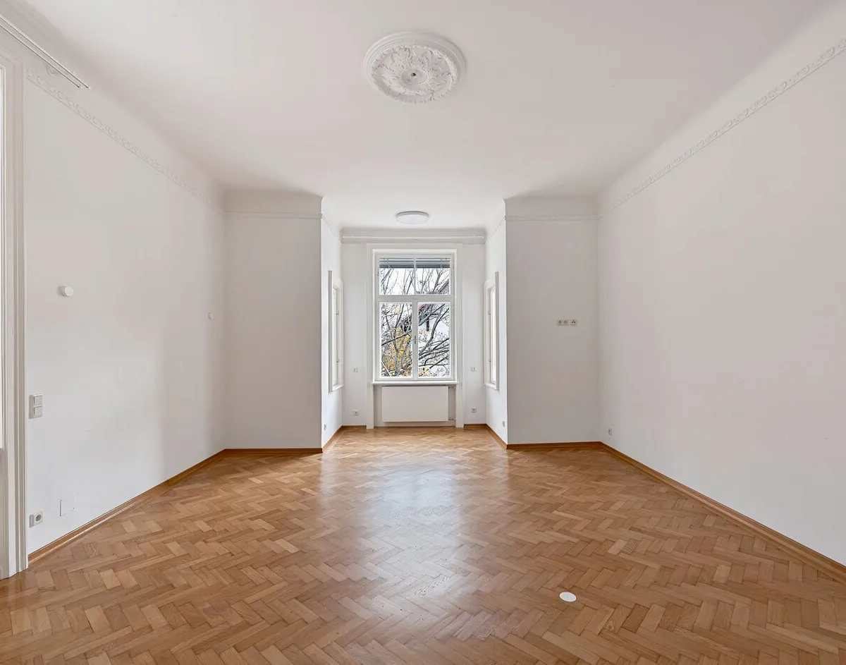 Die Villa beeindruckt bereits im Erdgeschoss mit zwei repräsentativen Salons und stilvollen Altbaudetails. Kunstvolle Stuckelemente und hohe Fenster mit charakteristischen Rahmen unterstreichen das besondere Ambiente dieser Immobilie. Drei weitere Zimmer, eine Küche, ein Badezimmer sowie eine separate Toilette runden diese Ebene ab. Über eine verglaste Doppeltüre gelangt man direkt in den gepflegten Privatgarten mit ca. 300 m² – eine grüne Oase der Ruhe mitten in der Stadt.