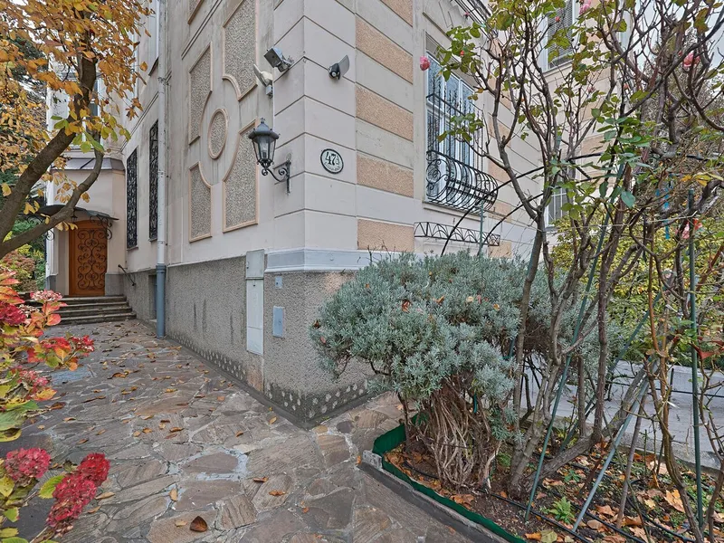 Zu den weiteren Stockwerken gelangt man über ein beeindruckendes Marmorstiegenhaus. Das Obergeschoss , zuletzt um 2005 saniert, präsentiert sich mit einem hellen, großzügigen Wohnsalon und vier weiteren Räumen, während das Dachgeschoss mit vier gemütlichen Zimmern und zwei Terrassen einen atemberaubenden Ausblick über die Baumkronen bietet. Die Villa verfügt über insgesamt vier Badezimmer, sieben WCs, eine erneuerte Gaszentralheizung, Klimaanlage in Teilen des Hauses, Sicherheitstüren sowie eine kleine Garage. Das Objekt ist außerdem vollständig unterkellert, inklusive Technikraum, Wirtschaftsbereich, zusätzlichem Badezimmer sowie reichlich Stauraum und praktischer Nutzfläche.