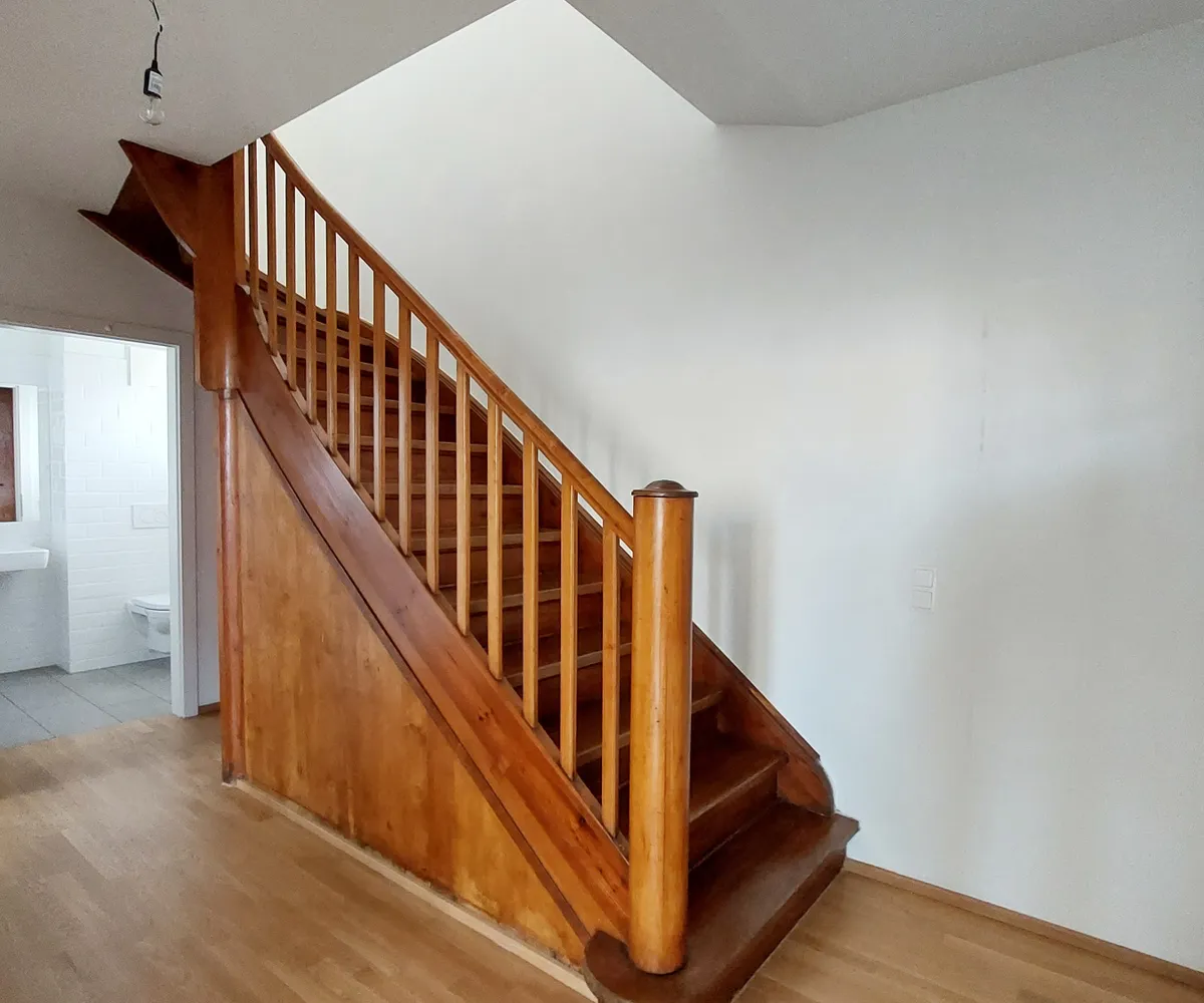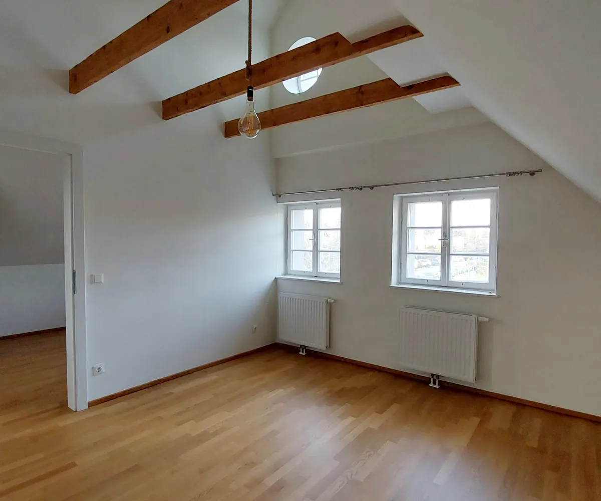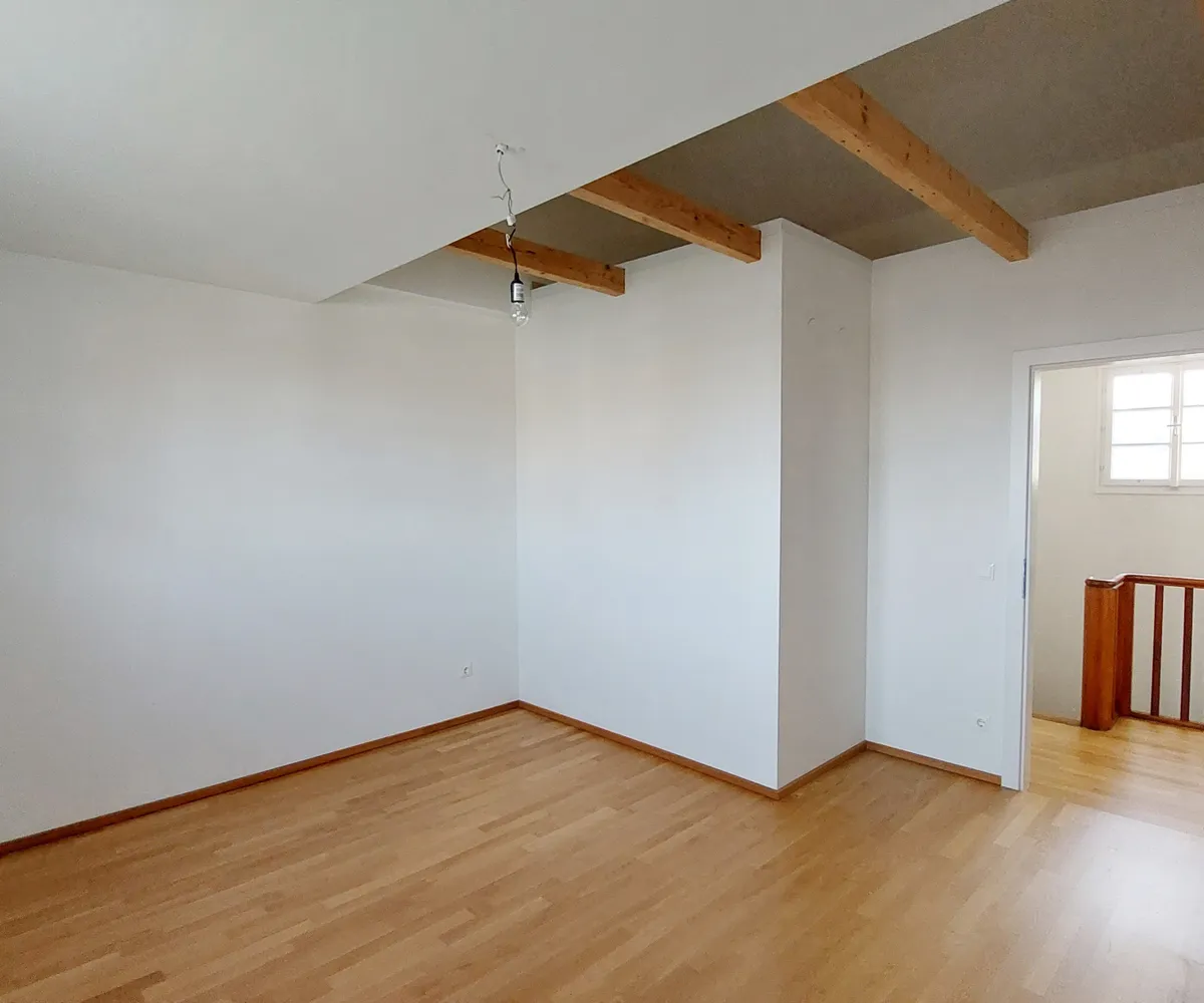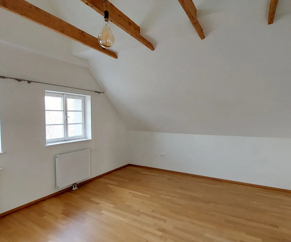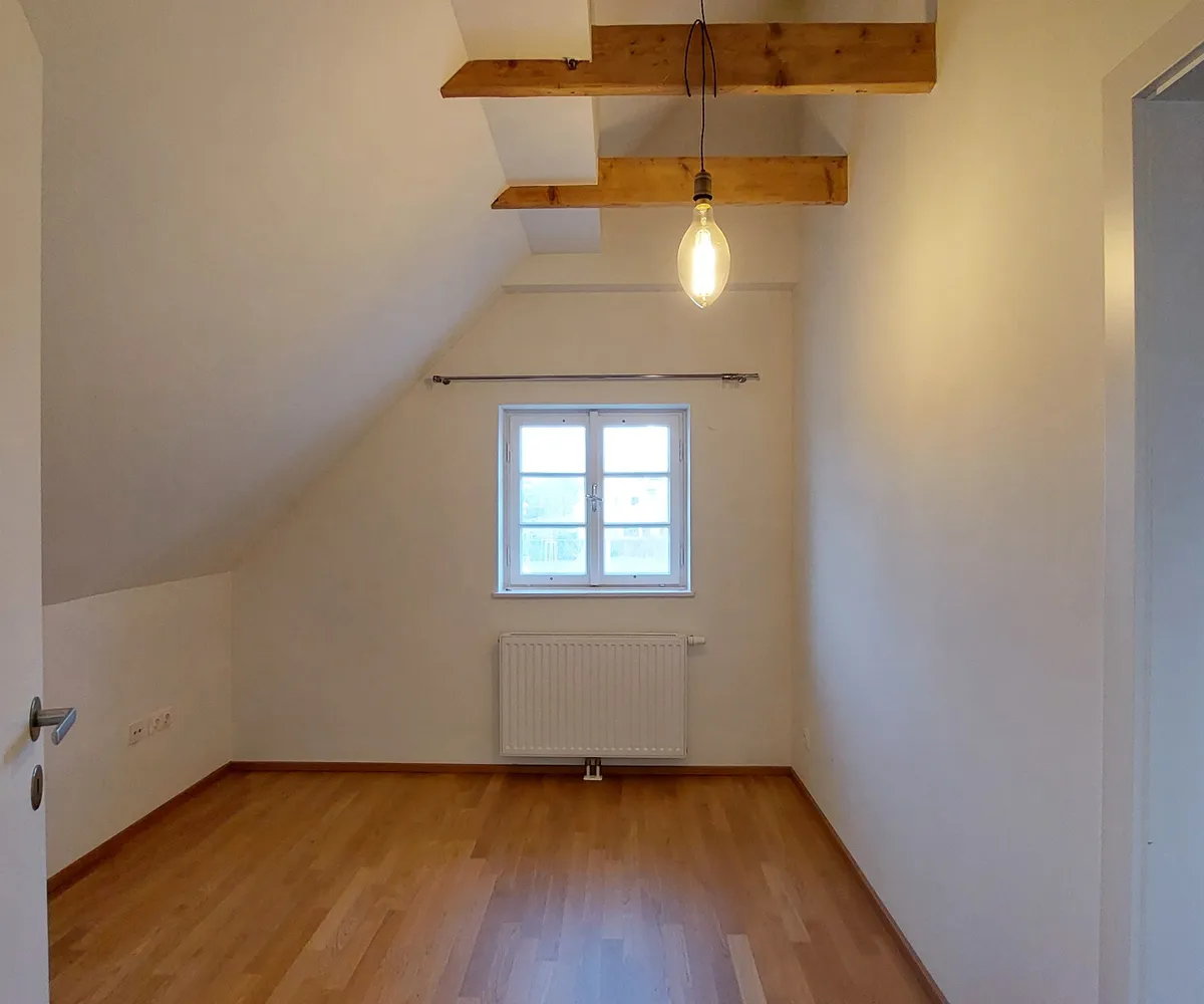 Im 1. Obergeschoß befinden sich drei Schlafzimmer (eines davon als Durchgangszimmer ausgeführt) mit charmanten Dachbalken, sowie ein Badezimmer mit Badewanne, Doppelwaschbecken und WC.