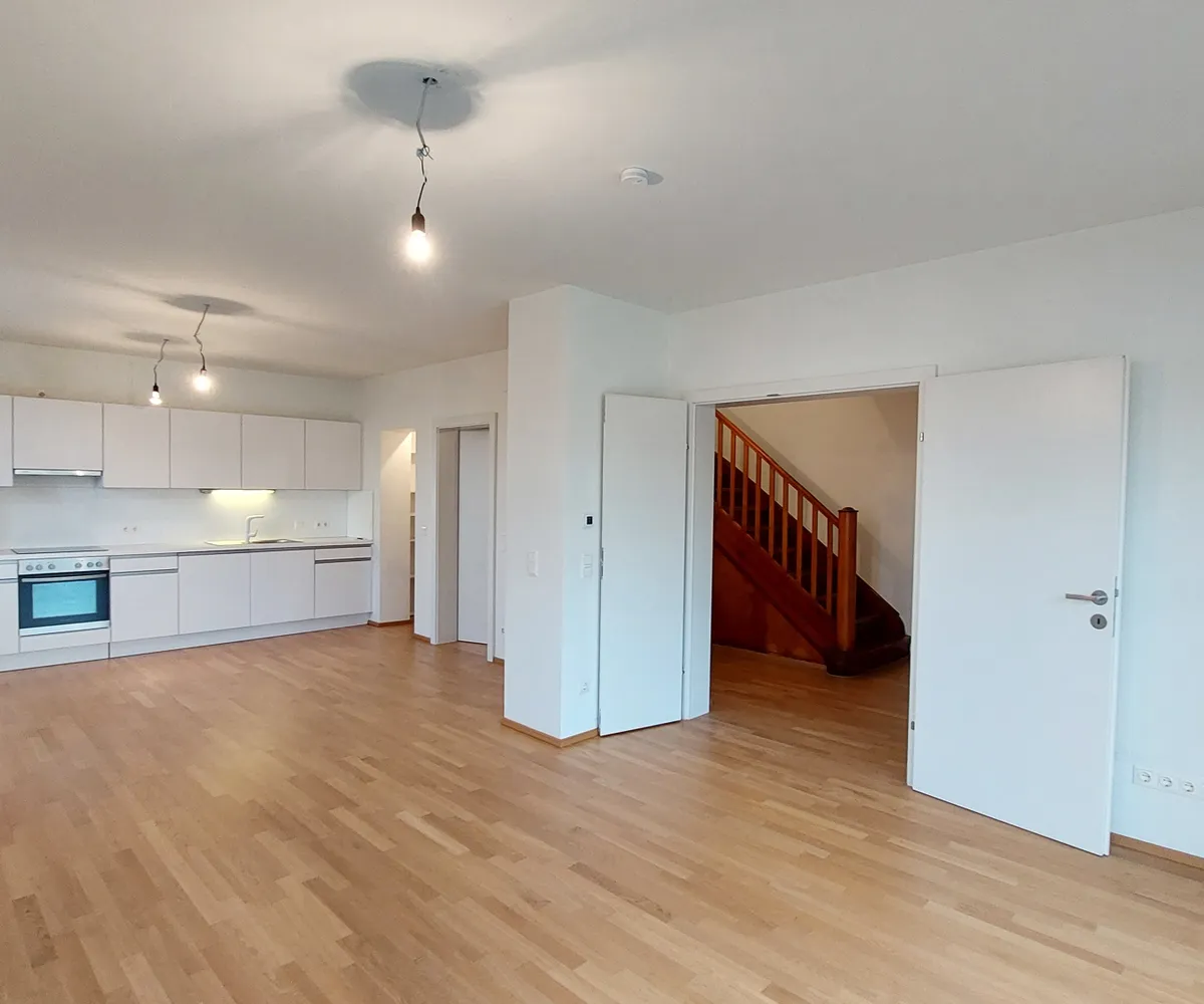 Im Erdgeschoß erwartet Sie ein einladender Eingangsbereich, ein großzügiger Wohnbereich mit Küchenzeile, Speis und Zugang zum Balkon, außerdem ein separates WC.