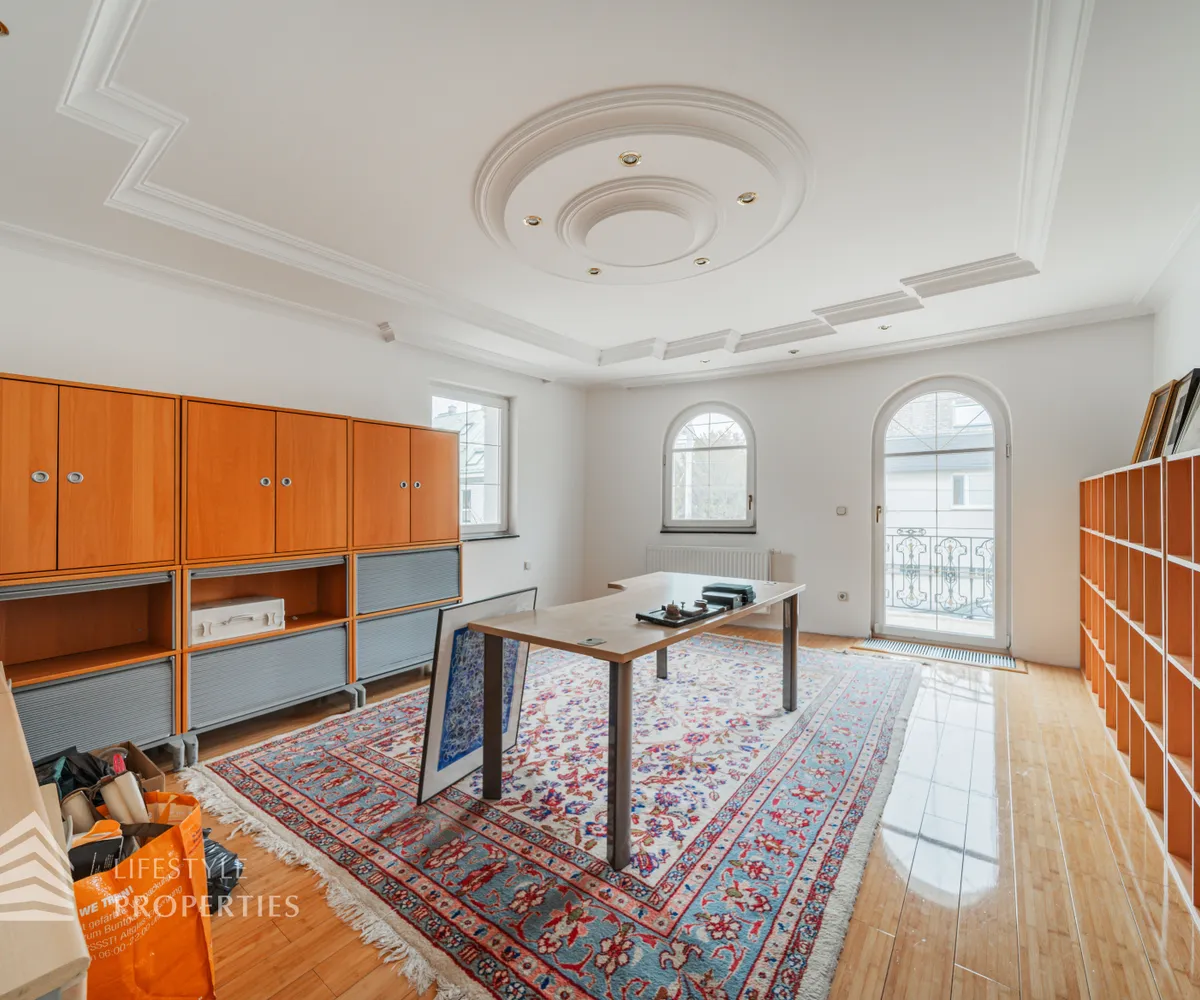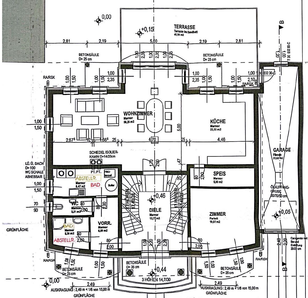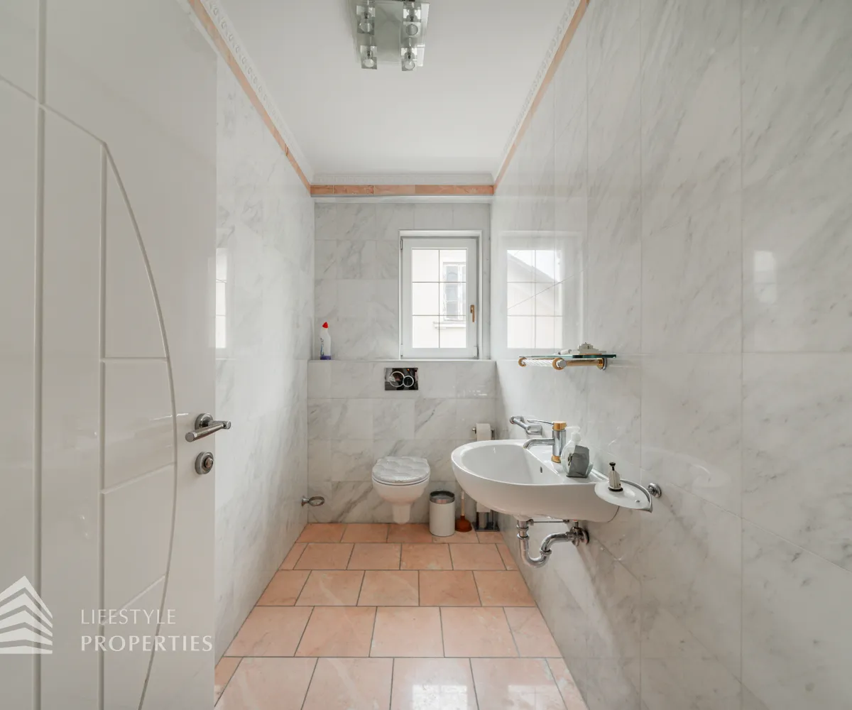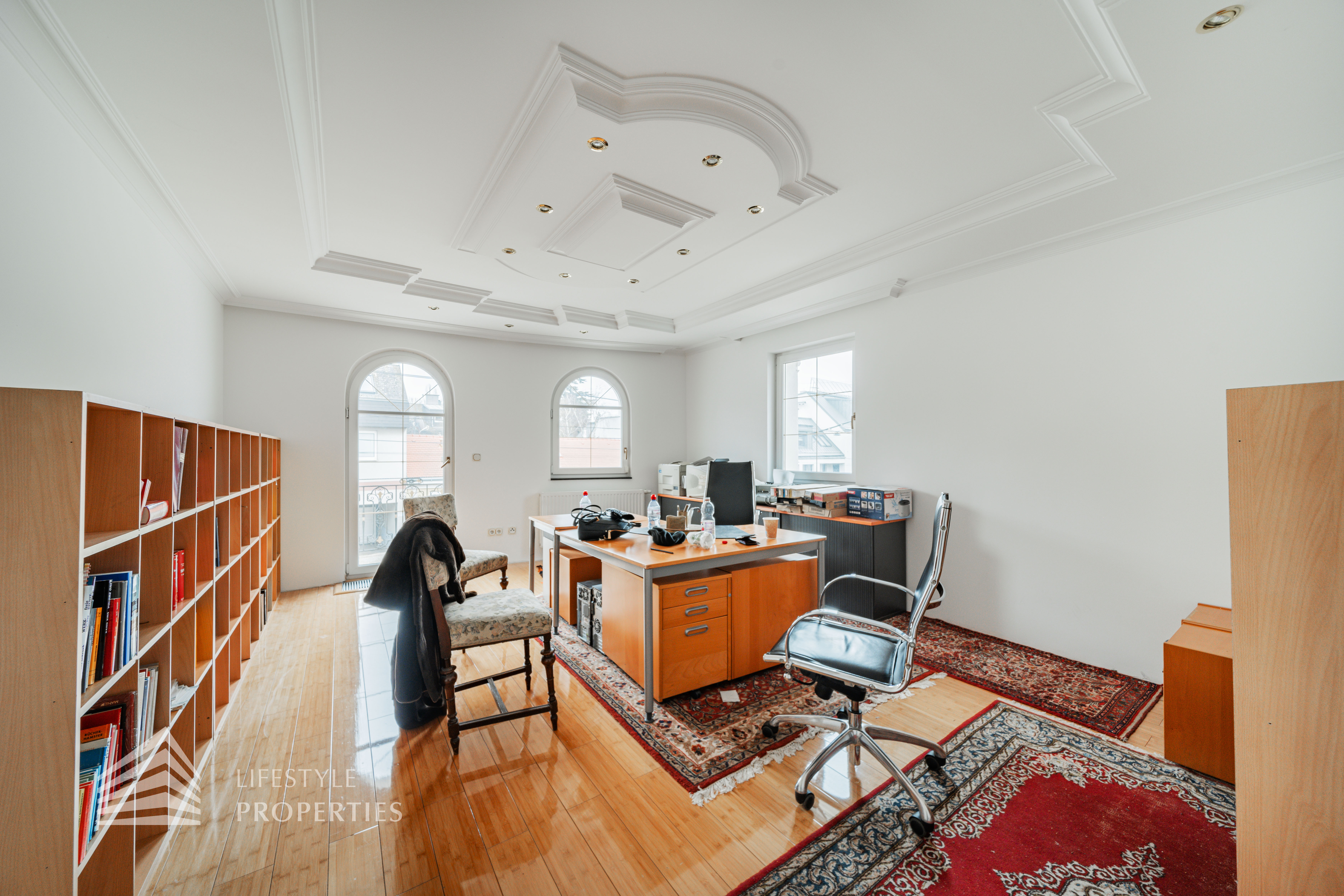 Beim Betreten der Villa gelangen Sie in das Erdgeschoß und einen einladenden Vorraum, welcher Sie in die Räumlichkeiten dieser Etage führt. Zunächst befindet sich rechterhand ein helles ca. 19 m² großes Arbeitszimmer, welches aber auch wunderbar als Gästezimmer genutzt werden kann. Direkt gegenüber befindet sich ein kleiner Vorraum, der Sie zu dem ersten Badezimmer, einem separatem WC und einem Abstellraum führt. Gegenüber der Eingangstüre gelangen Sie in den geräumigen und großzügigen Wohnessbereich, welcher mit einer Größe von knapp 56 m 2 besticht. Hier befindet sich außerdem die ca. 23 m 2 große offene Küche. Der Wohnbereich bietet ausreichend Platz für einen einladenden Esstisch und ein großes gemütliches Sofa. Von hier aus gelangen Sie auf die knapp 46 m 2 große Terrasse, welche Sie auch in den eigenen und ruhigen Garten führt.