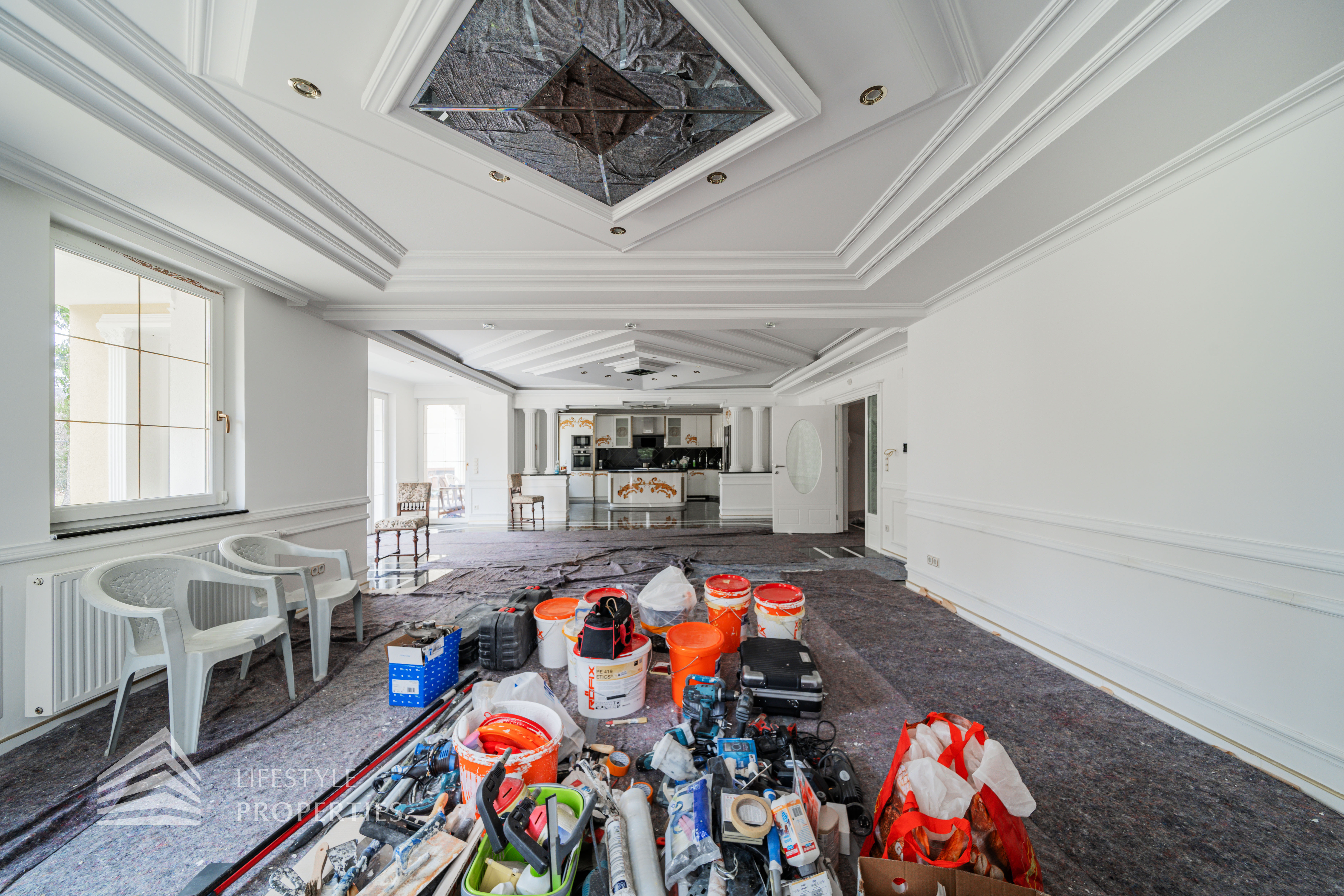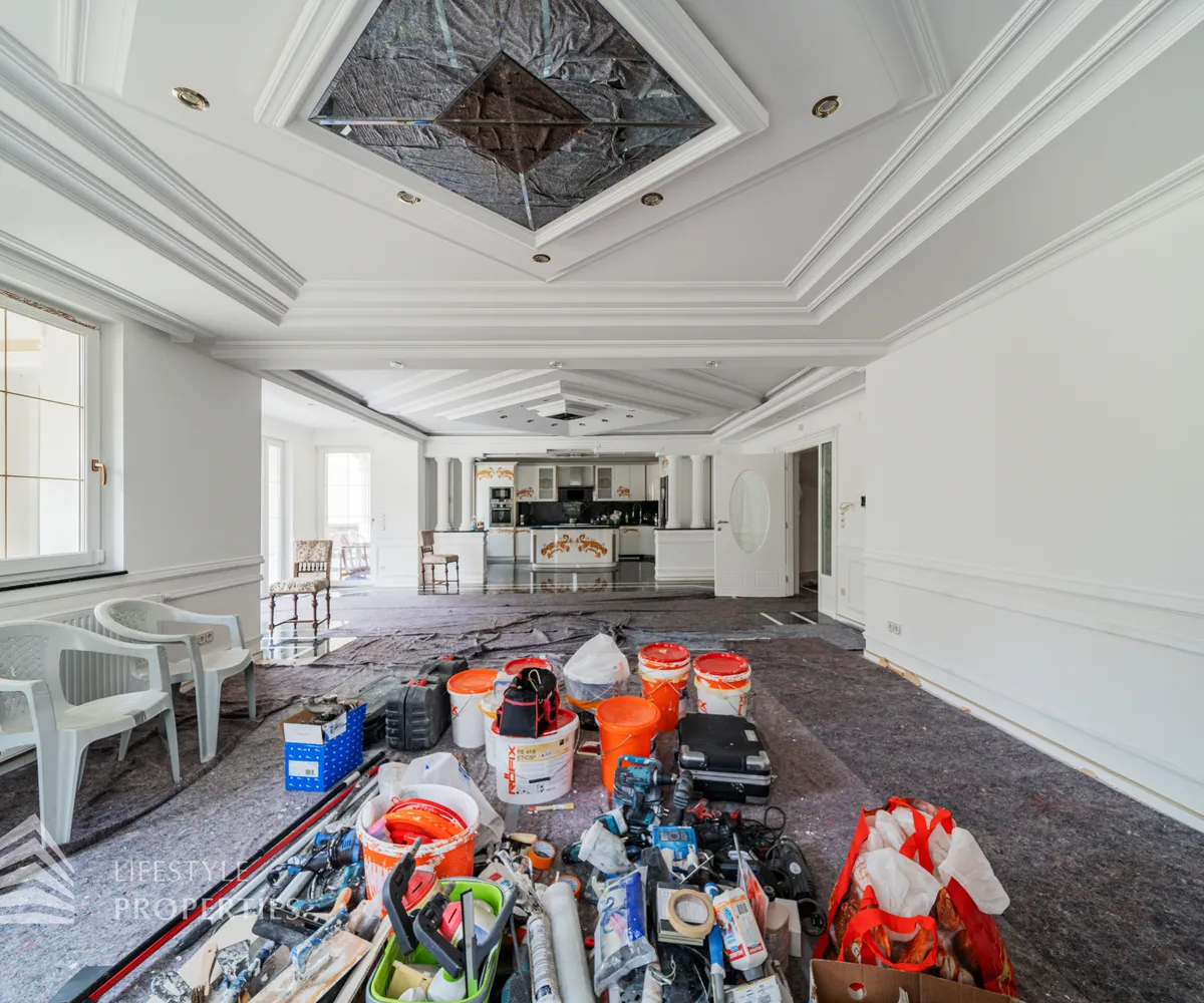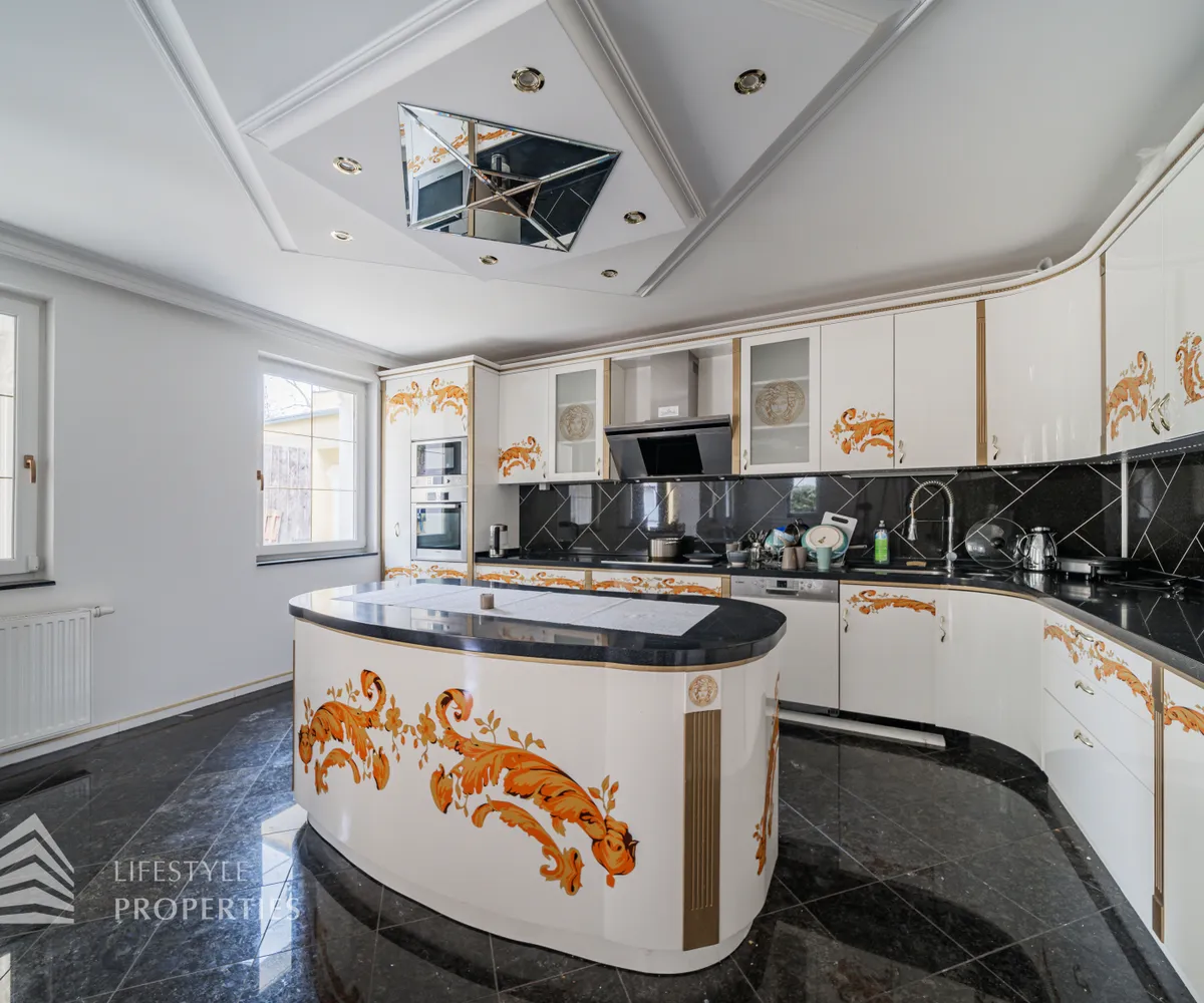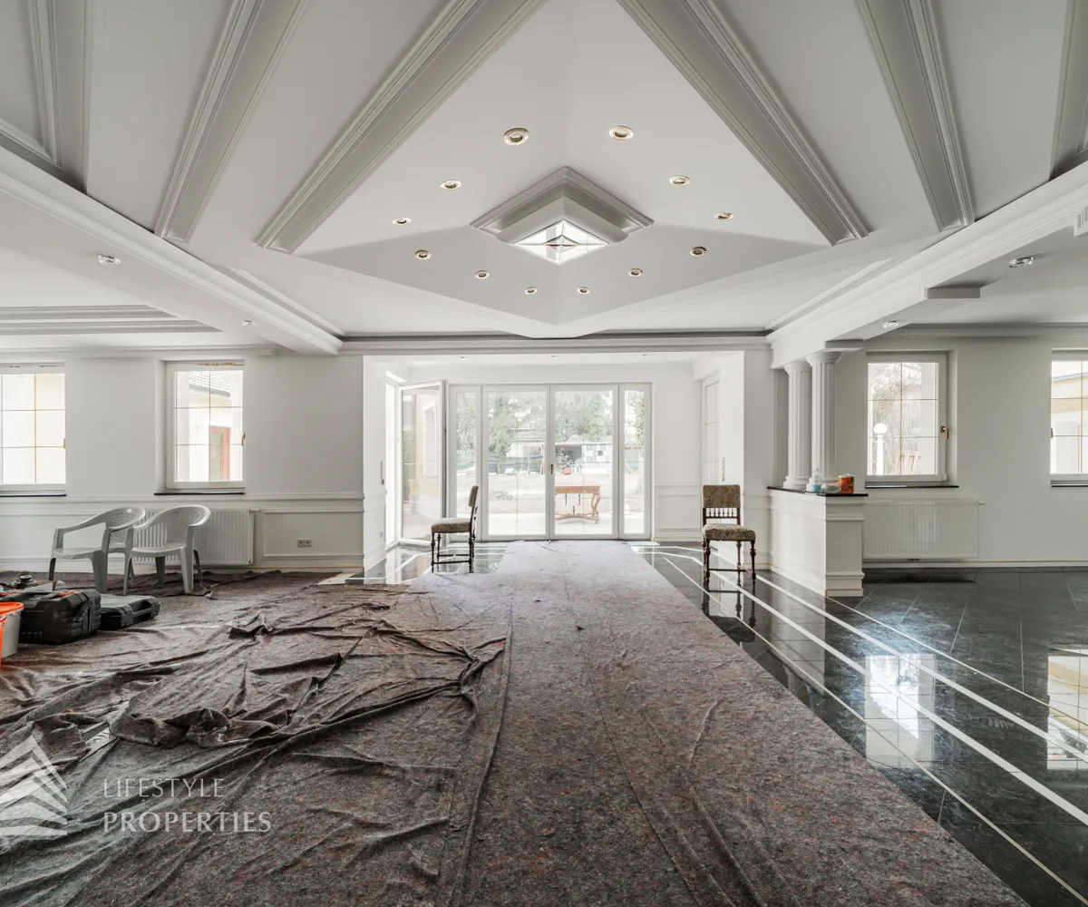 Beim Betreten der Villa gelangen Sie in das Erdgeschoß und einen einladenden Vorraum, welcher Sie in die Räumlichkeiten dieser Etage führt. Zunächst befindet sich rechterhand ein helles ca. 19 m² großes Arbeitszimmer, welches aber auch wunderbar als Gästezimmer genutzt werden kann. Direkt gegenüber befindet sich ein kleiner Vorraum, der Sie zu dem ersten Badezimmer, einem separatem WC und einem Abstellraum führt. Gegenüber der Eingangstüre gelangen Sie in den geräumigen und großzügigen Wohnessbereich, welcher mit einer Größe von knapp 56 m 2 besticht. Hier befindet sich außerdem die ca. 23 m 2 große offene Küche. Der Wohnbereich bietet ausreichend Platz für einen einladenden Esstisch und ein großes gemütliches Sofa. Von hier aus gelangen Sie auf die knapp 46 m 2 große Terrasse, welche Sie auch in den eigenen und ruhigen Garten führt.