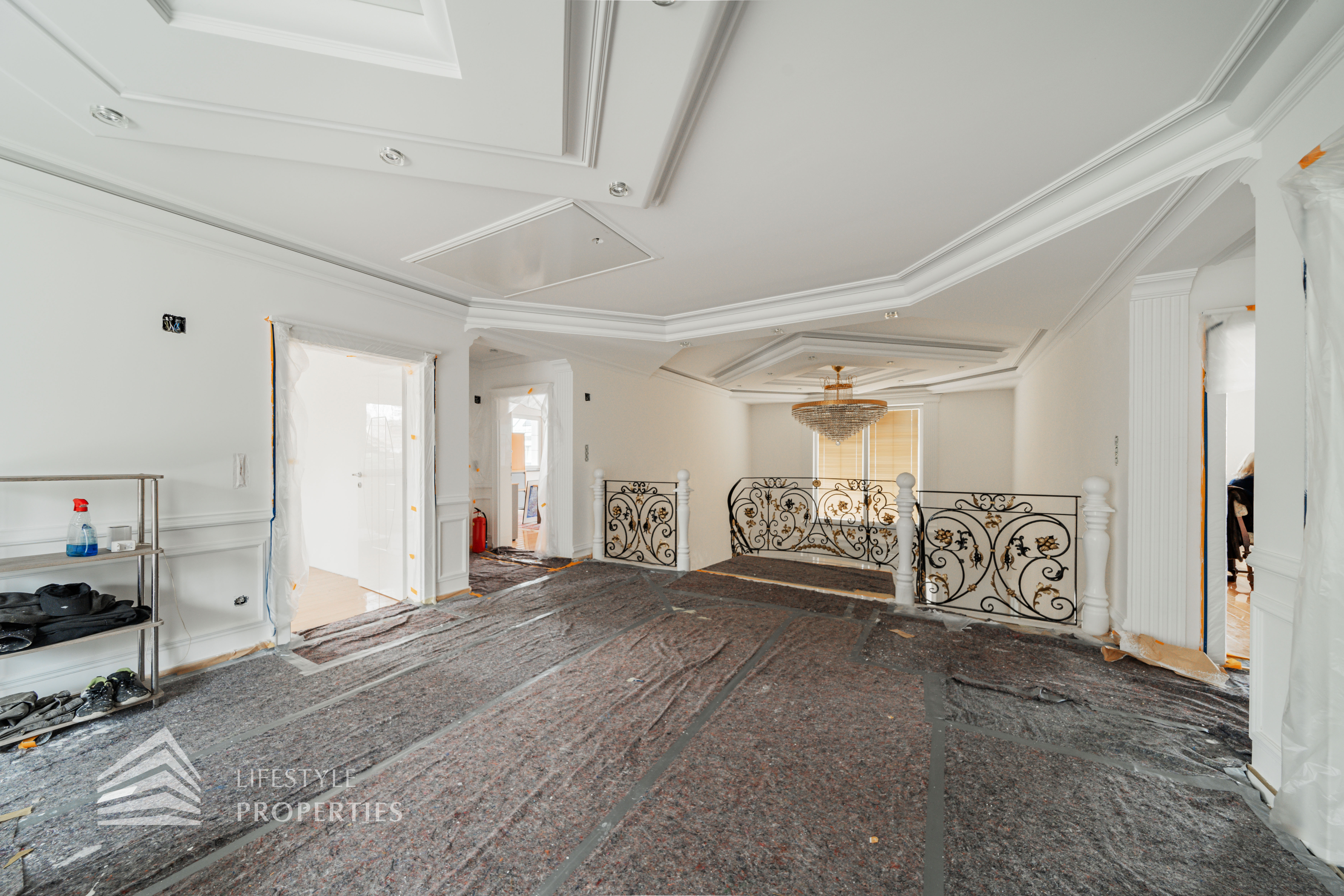 Über den Eingangsbereich gelangt man in die obere Etage, welche sich in vier Zimmer, einen Technikraum und zwei Badezimmer aufteilt. Der Flur bringt Sie zentral in alle Räumlichkeiten. Ein traumhafter ca. 16 m² großer Balkon, welcher über den Garten blickt, befindet sich ebenfalls auf dieser Etage. Zwei kleinere ca. 7 m² große Balkone liegen auf der gegenüberliegenden Seite des Hauses.