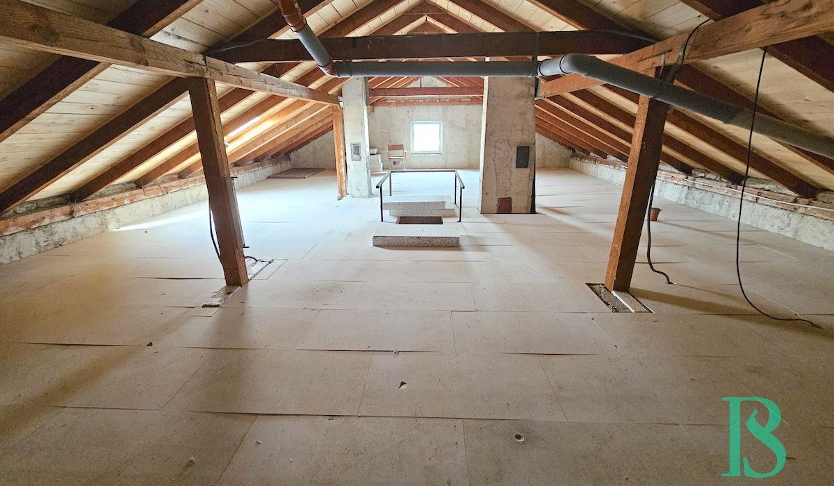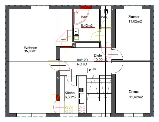 Das Obergeschoss ist der Mittelpunkt des Familienlebens: Ein großes XL-Wohnzimmer, das flexibel in Wohnzimmer und Elternschlafzimmer geteilt werden kann, zwei weitere Zimmer, eine freundliche Küche sowie ein Wannenbad mit WC.