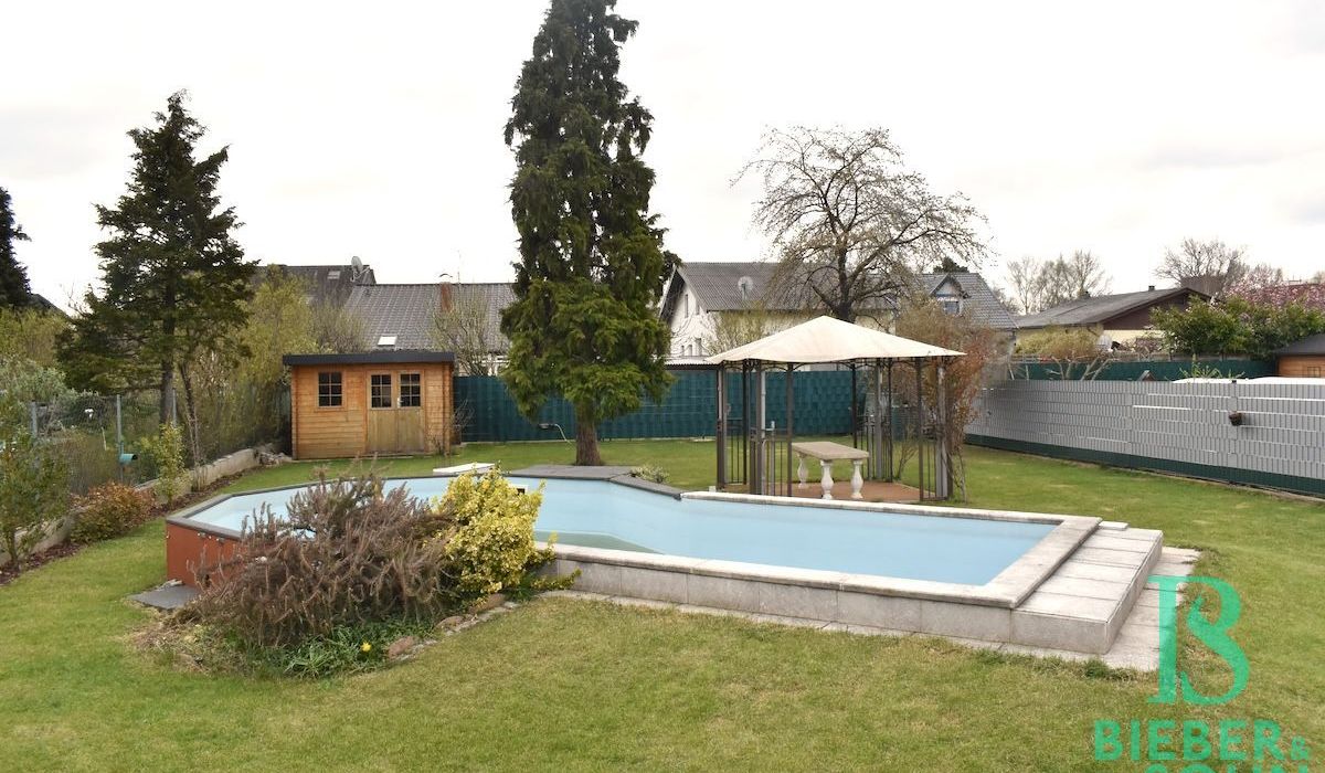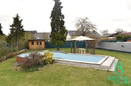 Ein ca. 570m² großer, gepflegter Garten mit Swimming Pool lädt zum Entspannen und Sonnenbaden ein. Eine praktische Gartenhütte bietet ausreichend Stauraum für Gartengeräte und weiteres Zubehör.