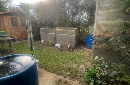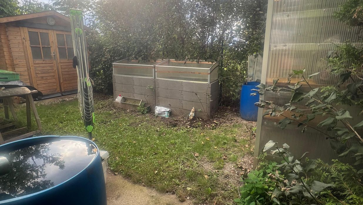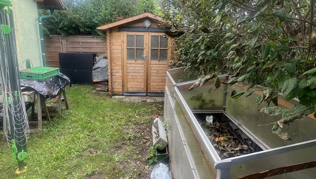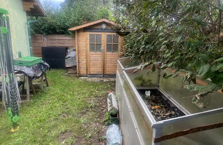 Zudem besteht ein 4 m² großer Geräteschuppen / Gewächshaus im Garten.