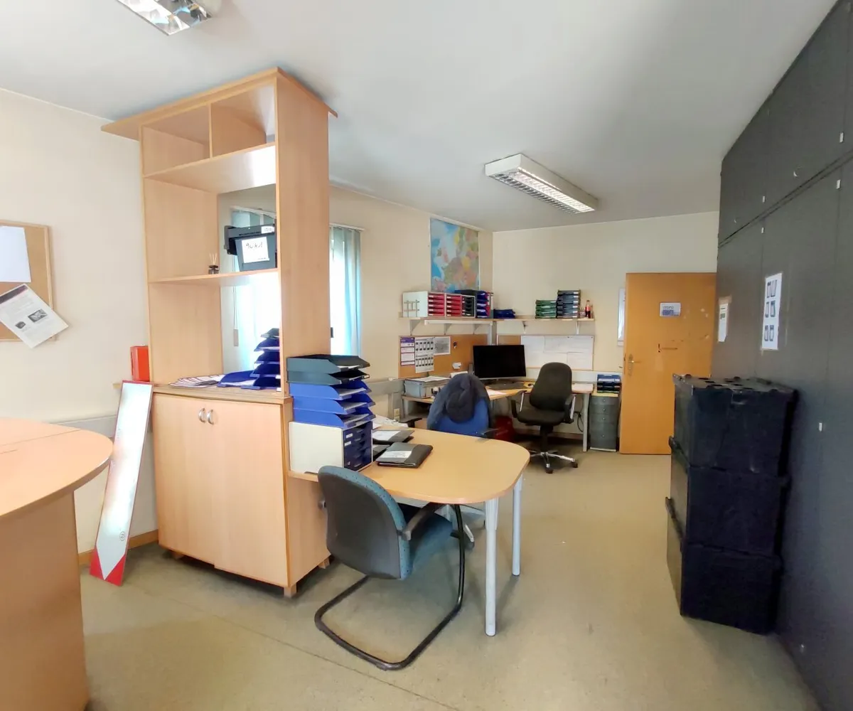 Der Bürotrakt mit ca. 109 m² Fläche ist direkt an die Lagerhalle angebunden und bietet moderne Arbeitsbedingungen für Verwaltung oder Kundenbetreuung.
