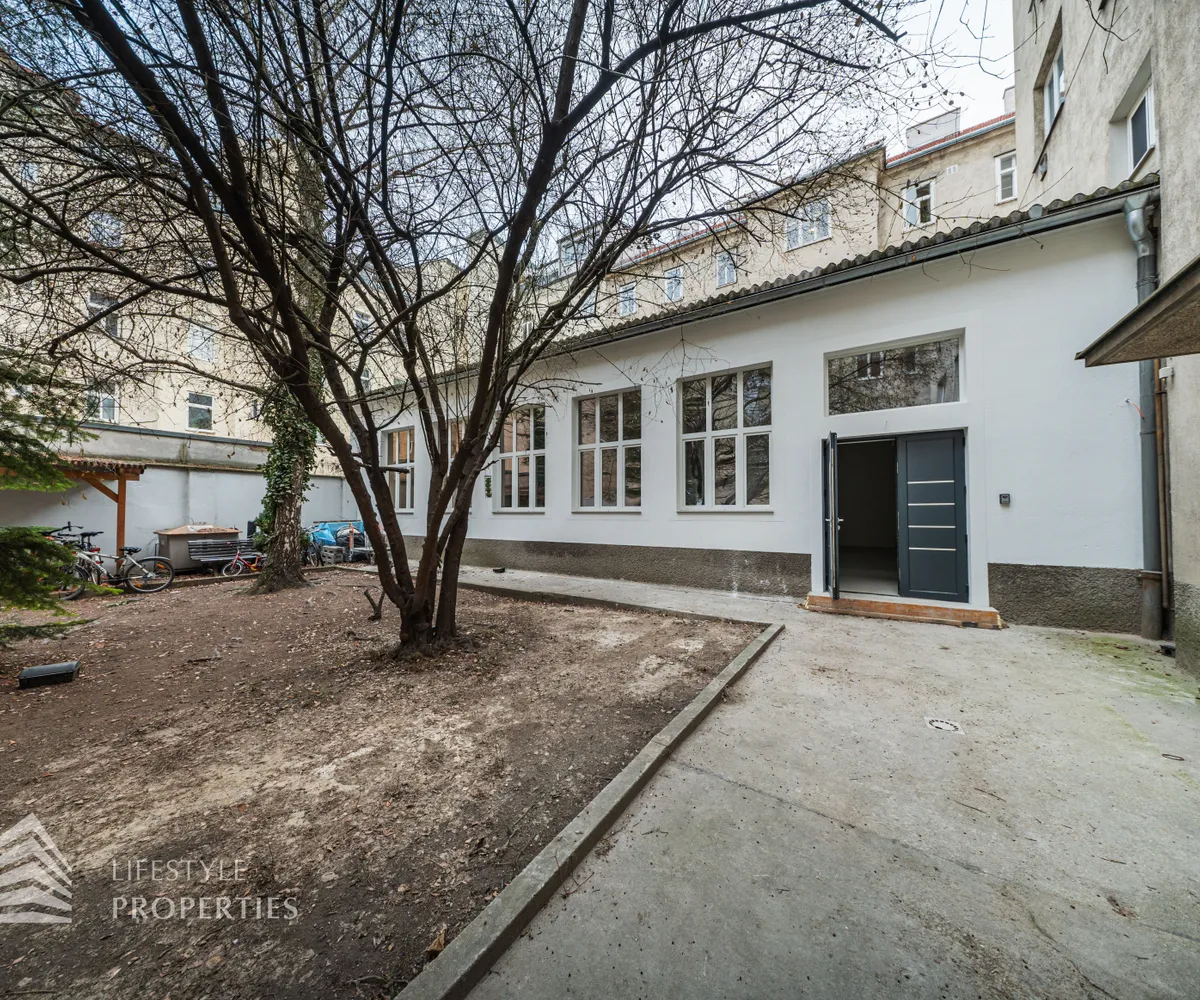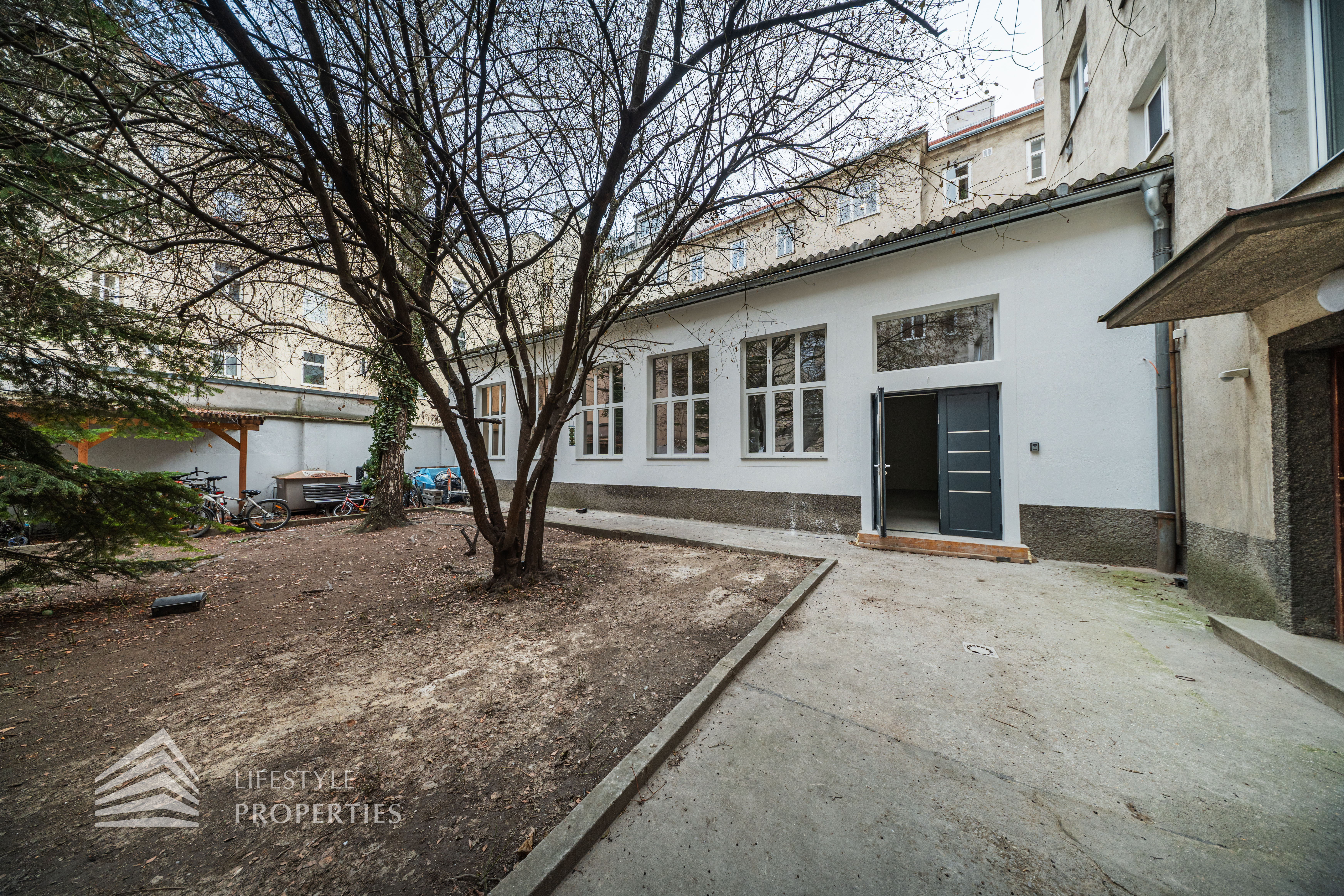 Das Loft befindet sich in einem Gebäude aus dem Jahre 1970 und ist in einem ruhigen, begrünten Hinterhof gelegen. Das Hofgebäude mit Loft-Charakter und sehr hohen Decken befindet sich aktuell in einem nicht fertiggestellten Zustand, wird jedoch umfassend saniert und modernisiert und eignet sich nach Renovierung ideal als Büro oder Atelier. Der Eigentümer stellt sich vor, dass der langfristige Mieter sich mit 140.000 € an den Umbaukosten beteilgt.