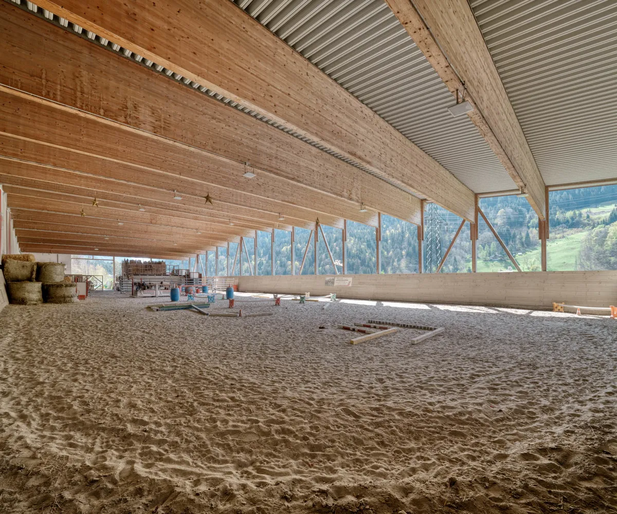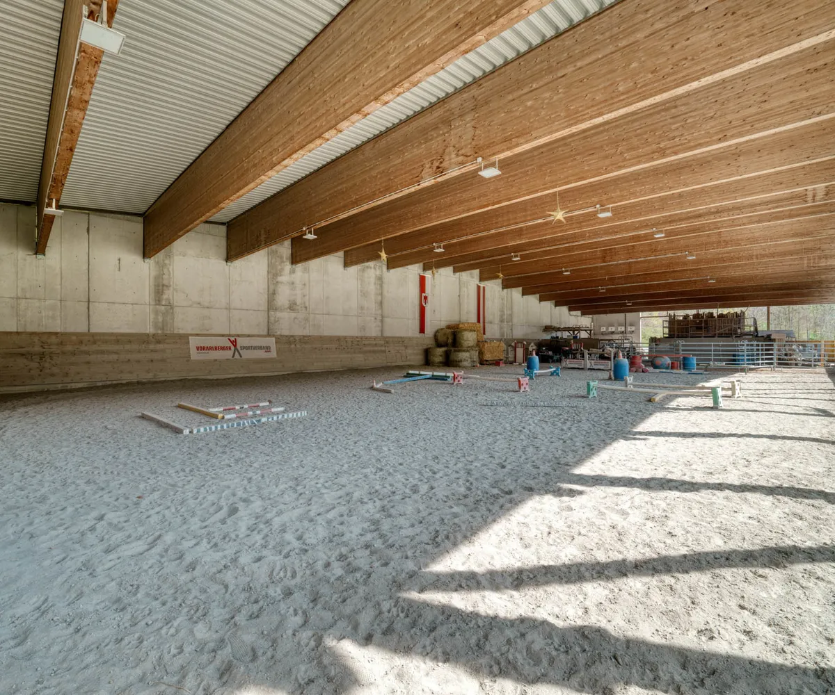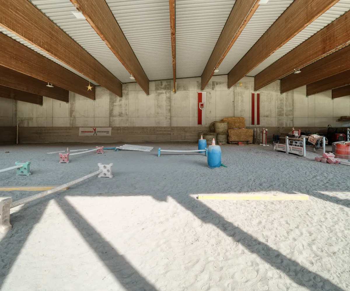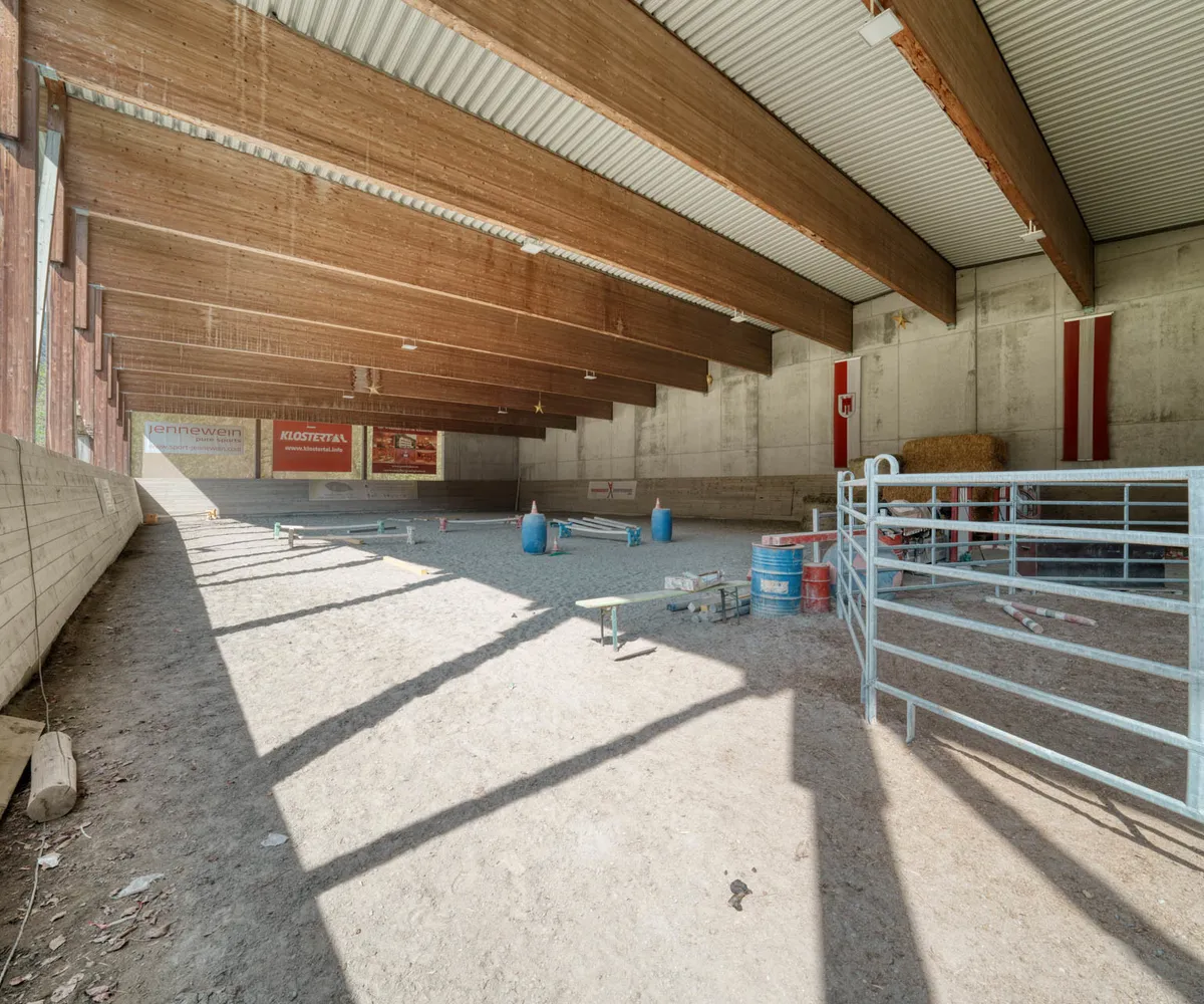 Die Reithalle liegt direkt anliegenden zu den dazugehörigen landwirtschaftlichen und forstwirtschaftlichen Flächen. Diese Lage ermöglicht es den Pferden und Reitern, die Schönheit der Umgebung in vollen Zügen zu genießen und gleichzeitig beste Bedingungen für Training und Erholung zu bieten.