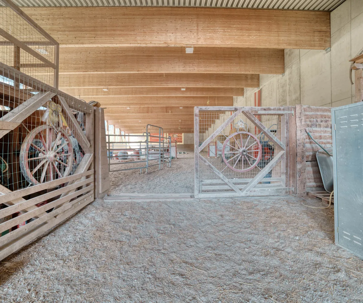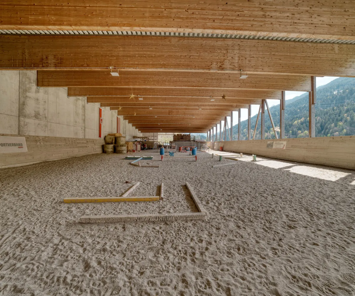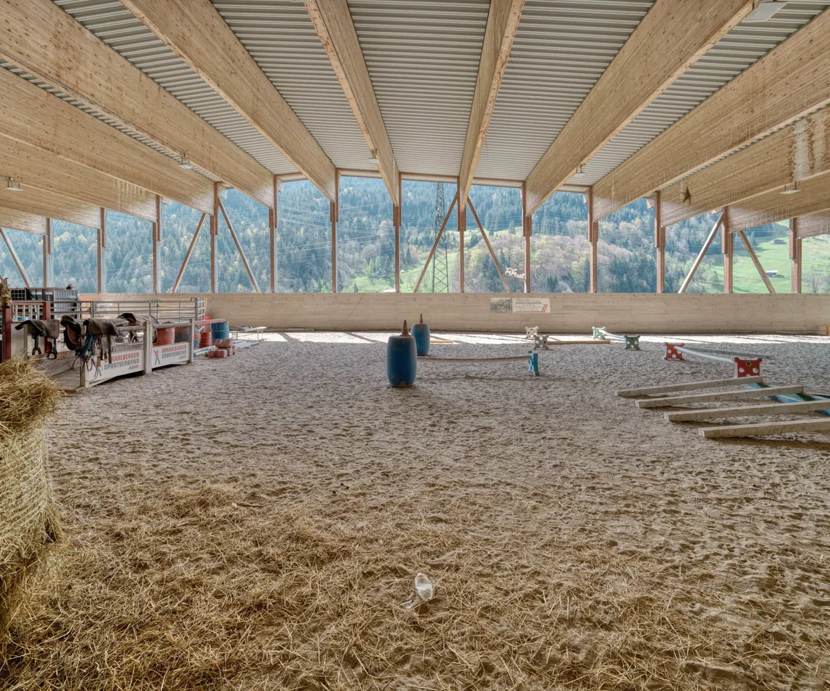 Die Reithalle liegt direkt anliegenden zu den dazugehörigen landwirtschaftlichen und forstwirtschaftlichen Flächen. Diese Lage ermöglicht es den Pferden und Reitern, die Schönheit der Umgebung in vollen Zügen zu genießen und gleichzeitig beste Bedingungen für Training und Erholung zu bieten.