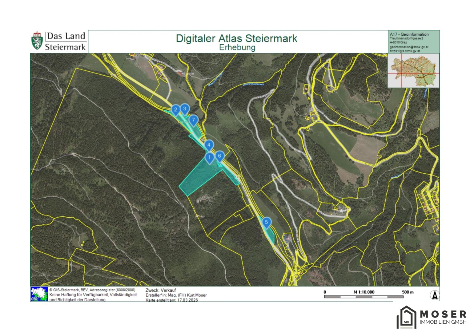 Die angebotene Liegenschaft liegt nur ca. 1,5 km von der Bezirkshauptstadt Murau entfernt. Der Wald ist aufgrund der B 96 sehr gut erreichbar. Die Seehöhe des Waldes liegt zwischen 800 und 900 Höhenmeter. Die Stadt verfügt über eine sehr gute Nahversorgung mit Einkaufsmöglichkeiten, Gastronomie, Schulen sowie medizinischer Betreuung. Das historische Stadtzentrum mit seinen gut erhaltenen Gebäuden und gemütlichen Plätzen verleiht Murau einen besonderen Charme.