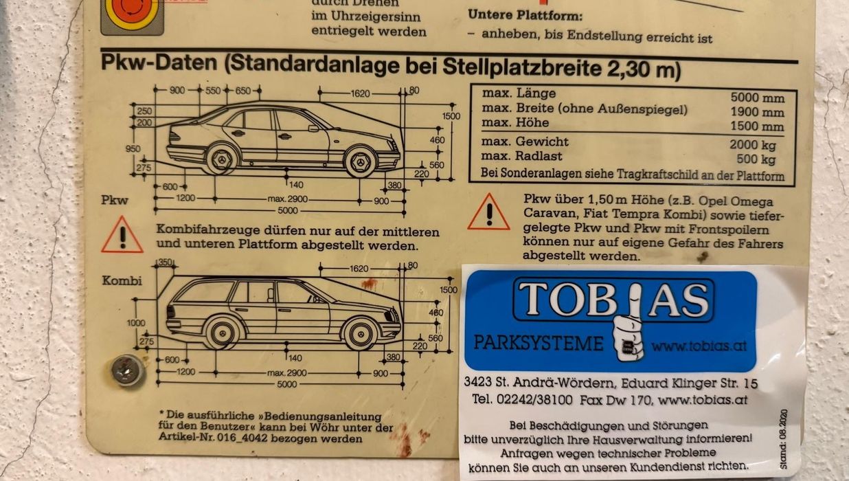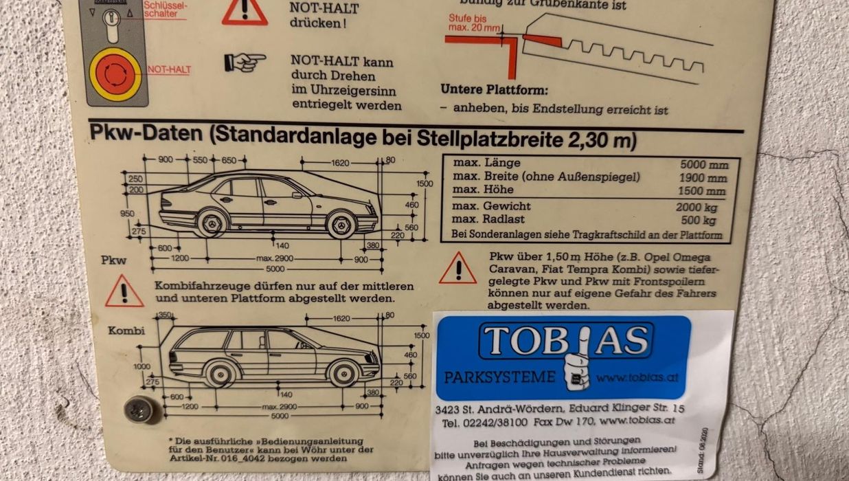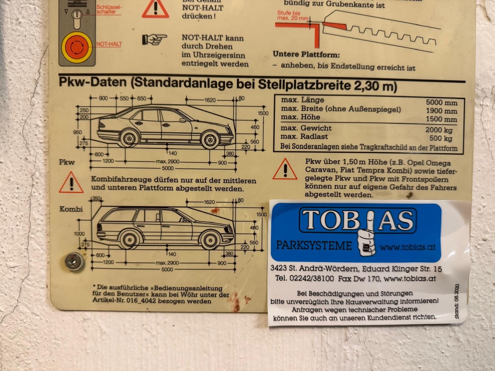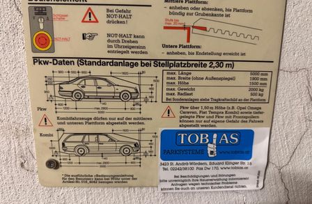 Der Stellplatz befindet sich in einem modernen Duplex-Parksystem , das den vorhandenen Raum optimal nutzt. Voraussetzung ist, dass das Fahrzeug den technischen Vorgaben für Stapelparker entspricht (Höhe, Breite, Gewicht – auf Anfrage).