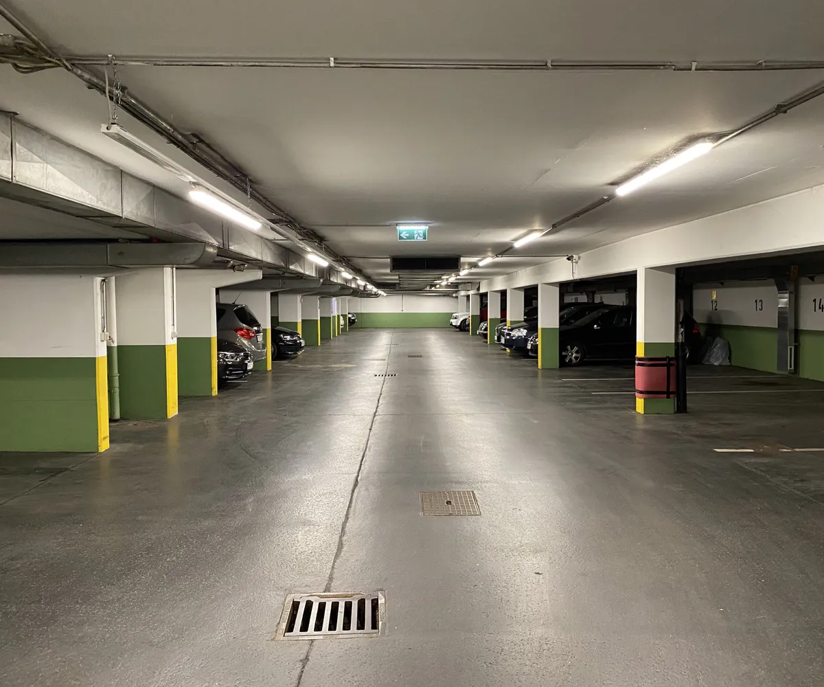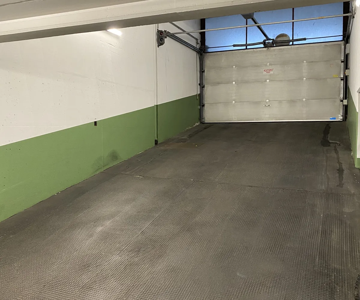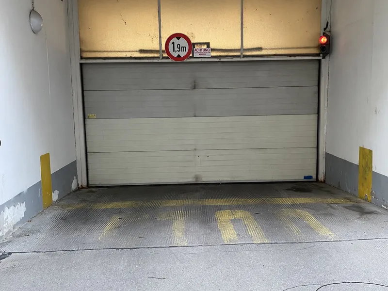 Die Garage liegt im Untergeschoß eines 1974 errichteten Mehrfamilienhauses mit glatter Fassade und Personenaufzug.